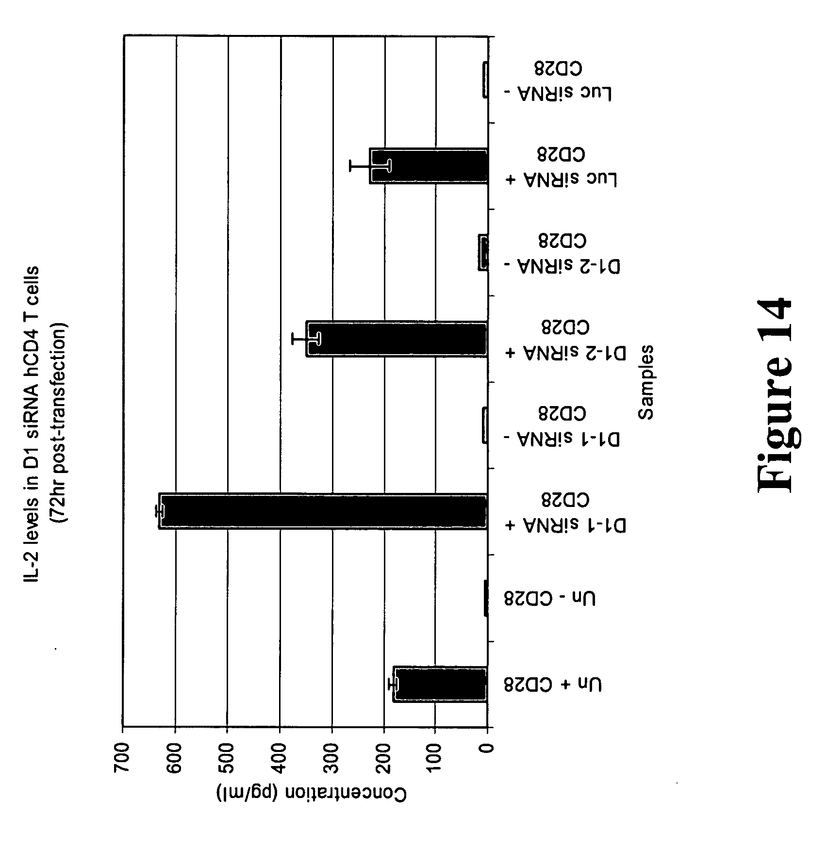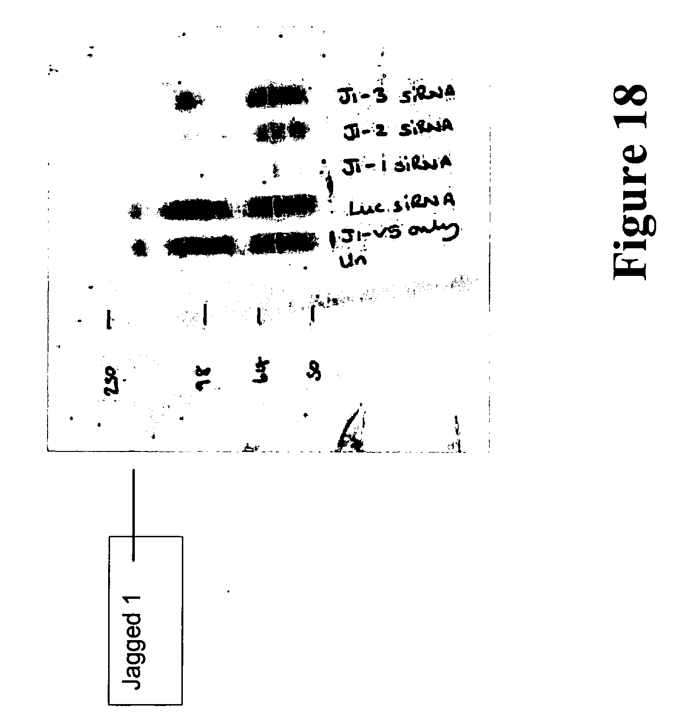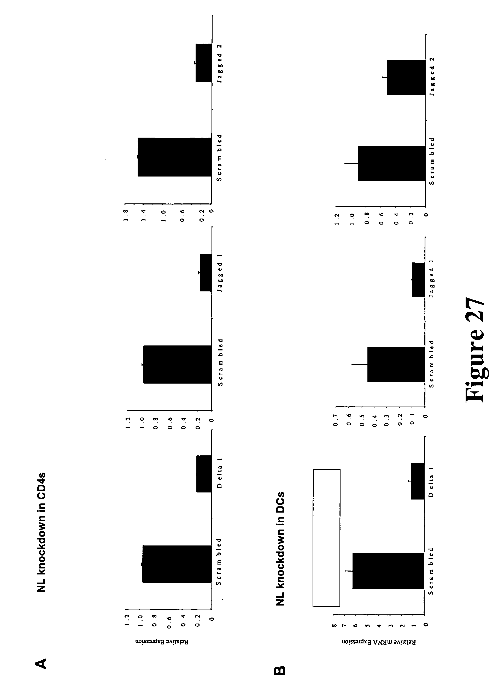 A cDNA clone spanning the complete coding sequence of the human Jagged1 gene (see, e.g. GenBank Accession No AF028593) was isolated from a cDNA library using a PCR-based screening strategy and cloned into the mammalian expression vector pcDNA3.1-V5-HisA (Invitrogen) without a stop codon, to generate the plasmid pcDNA3.1 FL hjagged1 V5-His. When expressed in mammalian cells, this plasmid expresses the full-length human Jagged1 protein with V5 and His tags at the 3′ end of the intracellular domain. CHO cells were transfected with pcDNA3.1 FL hjagged1 V5-His using Lipofectamine 2000 transfection reagent and 24 hours later were further transfected with 100 nM final concentration Jagged1 siRNAs or Luc siRNA (as siRNA control), using siPORT Amine transfection reagent. An additional 24 hours later cells were plated onto CHO-N2 cells at 5×105 cells/ml in the presence of 10 mM LiCl, in duplicate. After overnight incubation cells were assayed for luciferase expression by Steady-Glo luciferase assay as described in EXAMPLE 1. Level of gene knockdown is shown by percentage activity, where luciferase expression seen with the Luc siRNA control is shown as 100% activity. Results are shown in Cells were also harvested into sample buffer and an equal concentration loaded onto 8% SDS-PAGE gel and Western blotted with anti-V5 HRP. Knockdown in expression can be seen with all the Jagged siRNAs in the CHO-N2 assay and in a Western Blot ( Knockdown in Jurkats Jurkat cells were co-transfected with pcDNA3.1 FL Jagged1 V5-His and 500 nM final concentration of Jagged 1 siRNAs using an Amaxa Nucleofector™ Kit (Amaxa Inc, MD, US) with Cell Line Nucleofector solution V and using manufacturer's protocol S18. Cells were harvested 6 & 24 hours post-transfection and equal protein concentrations were loaded onto 8% SDS-Page and Western blotted with anti-V5 HRP. Results are shown in Knockdown in gene expression can be seen, despite the fact that protein transfer was poor, probably due to the large size of Jagged 1. Delta1 Knockdown in Dendritic Cells (DCs) Monocyte derived DCs were purified from Buffy coats using CD14+ beads (Miltenyi Biotec) and incubated for 6 days in RPMI+10% FBS,+ glutamine, pen/strep (standard amounts) and 2-ME supplemented with IL-4 and GMCSF 50 ng/ml. Cells were matured on day 6 with TNFα 20 ng/ml, 24 h. Cells were harvested, counted and resuspended in Amaxa Dendritic cell nucleofection solution at 2×106 cells/100 ul solution. Cells were transfected with 100 nM final concentration human Delta1 siRNA (sequence as above) using Amaxa protocol U-02 and immediately resuspended in 1 ml pre-warmed media as above, supplemented with IL-4 and GMCSF as above. Cells were harvested 24 h post-transfection and assayed for Delta1 expression (relative to 18S rRNA expression) by RT-PCR using a Lightcycler™ RT-PCR instrument according to the manufacturer's directions (Roche). Results are shown in Delta1 Knockdown in a Mixed Lymphocyte Reaction (MLR) Monocyte-derived DCs were purified from Buffy coats using CD14+ beads (Miltenyi Biotec) and incubated for 6 days in RPMI+10% FBS,+ glutamine, pen/strep (standard amounts) and 2-ME supplemented with IL-4 and GMCSF 50 ng/ml. Cells were matured on day 6 with TNFα 20 ng/ml, 24 h. Cells were harvested, counted and resuspended in Amaxa Dendritic cell nucleofection solution at 2×106 cells/100 ul solution. Cells were transfected with 500 nM final concentration human Delta1 siRNA (sequence as above) using Amaxa protocol U-02 and immediately resuspended in 1 ml pre-warmed media as above, supplemented with IL-4 and GMCSF as above, incubated 24 h. DCs were then washed 2×PBS and resuspended to top concentration of 4×105 cells/ml in RPMI (as above except using 5% human serum (Sigma) rather than 10% FBS). Syngeneic and allogeneic CD4+ cells (purified typically from buffy coats using CD4+ beads, Miltenyi Biotec) were resuspended to 4×106 cells/ml in RPMI+5% human serum (as above). CD4+ cells were seeded at 4×105 cells/well in 100 ul media (as above) in 96-well round bottomed plates. DCs added in 100 ul media at a ratio of 10:1, 20:1, 40:1 (CD4 to DC, ratio, constant CD4) and no DCs—all in triplicate. Cells were incubated for 5 days at 37° C., 5% CO2, supernatants were then harvested and assayed by ELISA for cytokine (IFNγ) levels. Results are shown in As can be seen, hDelta siRNA in DCs promoted activation of CD4+ T-cells in this primary human mixed lymphocyte reaction (MLR). Knockdown of Delta 1 expression resulted in increased IFNγ in a ratio-dependent manner i.e more DCs corresponded to greater IFNγ expression. Jagged2 Knockdown in DCs Monocyte derived DCs were purified from Buffy coats using CD14+0 beads (Miltenyi Biotec) and incubated for 6 days in RPMI+10% FBS,+ glutamine, pen/strep (standard amounts) and 2-ME supplemented with IL-4 and GMCSF 50 ng/ml. Cells were matured on day 6 with TNFα 20 ng/ml, 24 h. Cells were harvested, counted and resuspended in Amaxa Dendritic cell nucleofection solution at 2×106 cells/100 ul solution. Cells were transfected with 500 nM final concentration human Jagged2 siRNA using Amaxa protocol U-02 and immediately resuspended in 1 ml pre-warmed media as above, supplemented with IL-4 and GMCSF as above. Jagged2 siRNA sequences used were as follows: