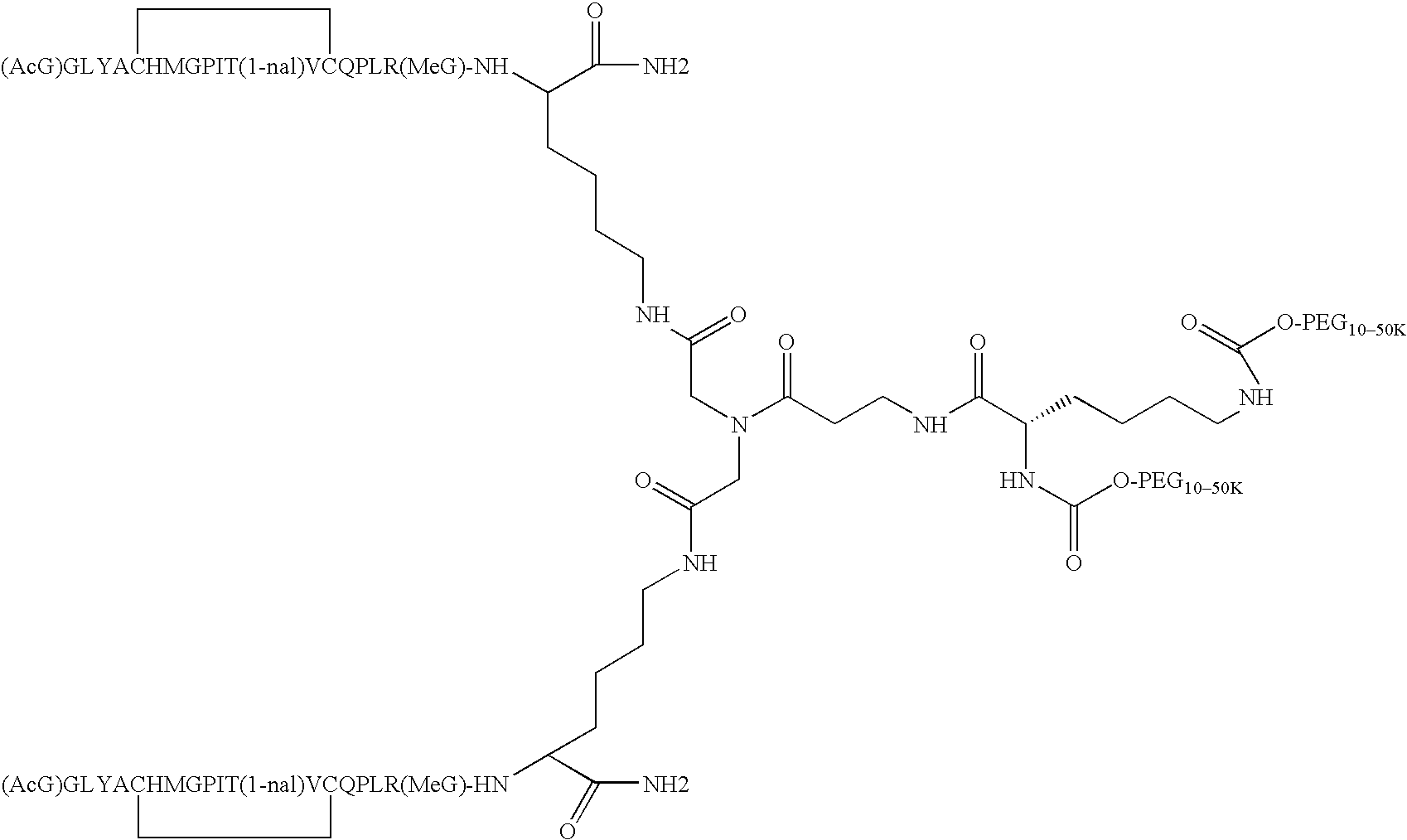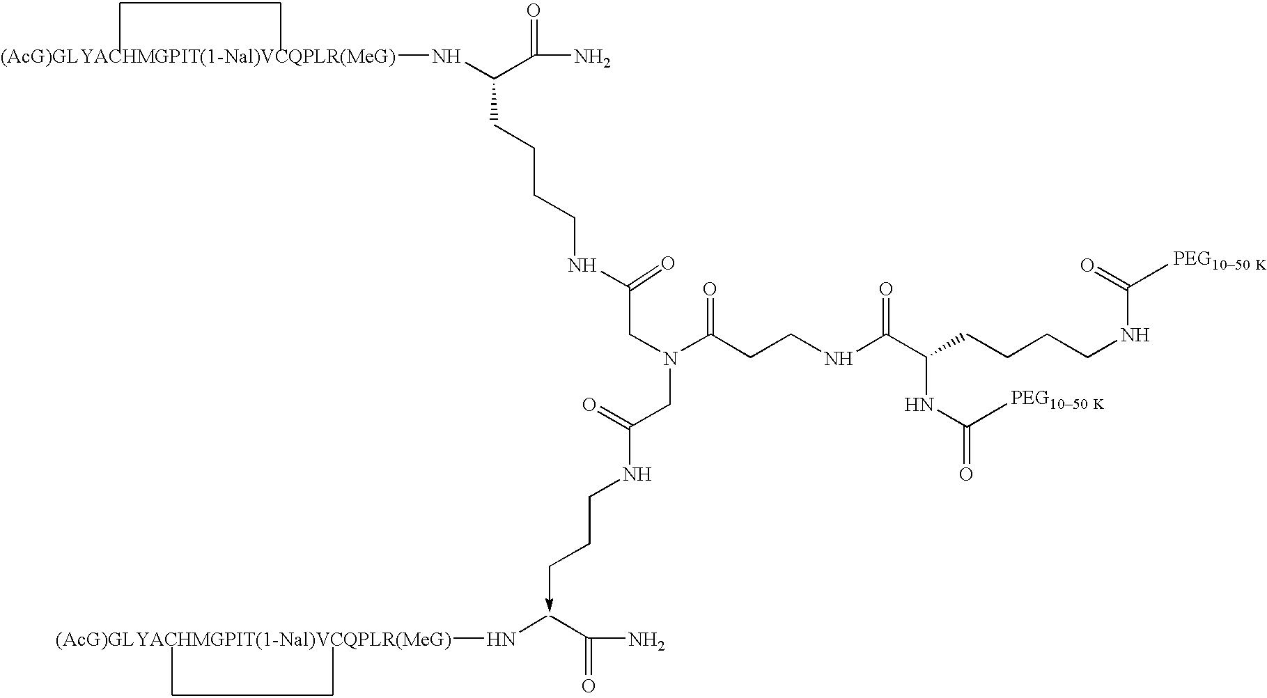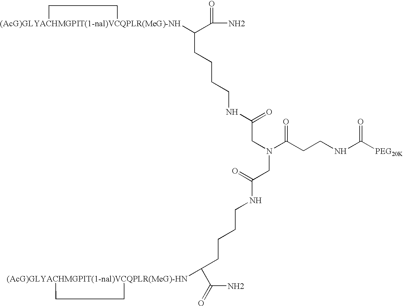 Alternatively, one or more of the lysine residues can be a D-lysine, giving rise to alternative stereochemistries that will be readily appreciated by those of ordinary skill in the art. Where each monomer of the homodimer has the amino acid sequence, (AcG)GLYACHMGPIT(1-nal)VCQPLR(MeG)K (SEQ ID NO: 2) and both N1 and N2 of the spacer are covalently attached via an amide linkage to an activated PEG moiety, the novel peptide compounds of the invention may be represented as follows:
