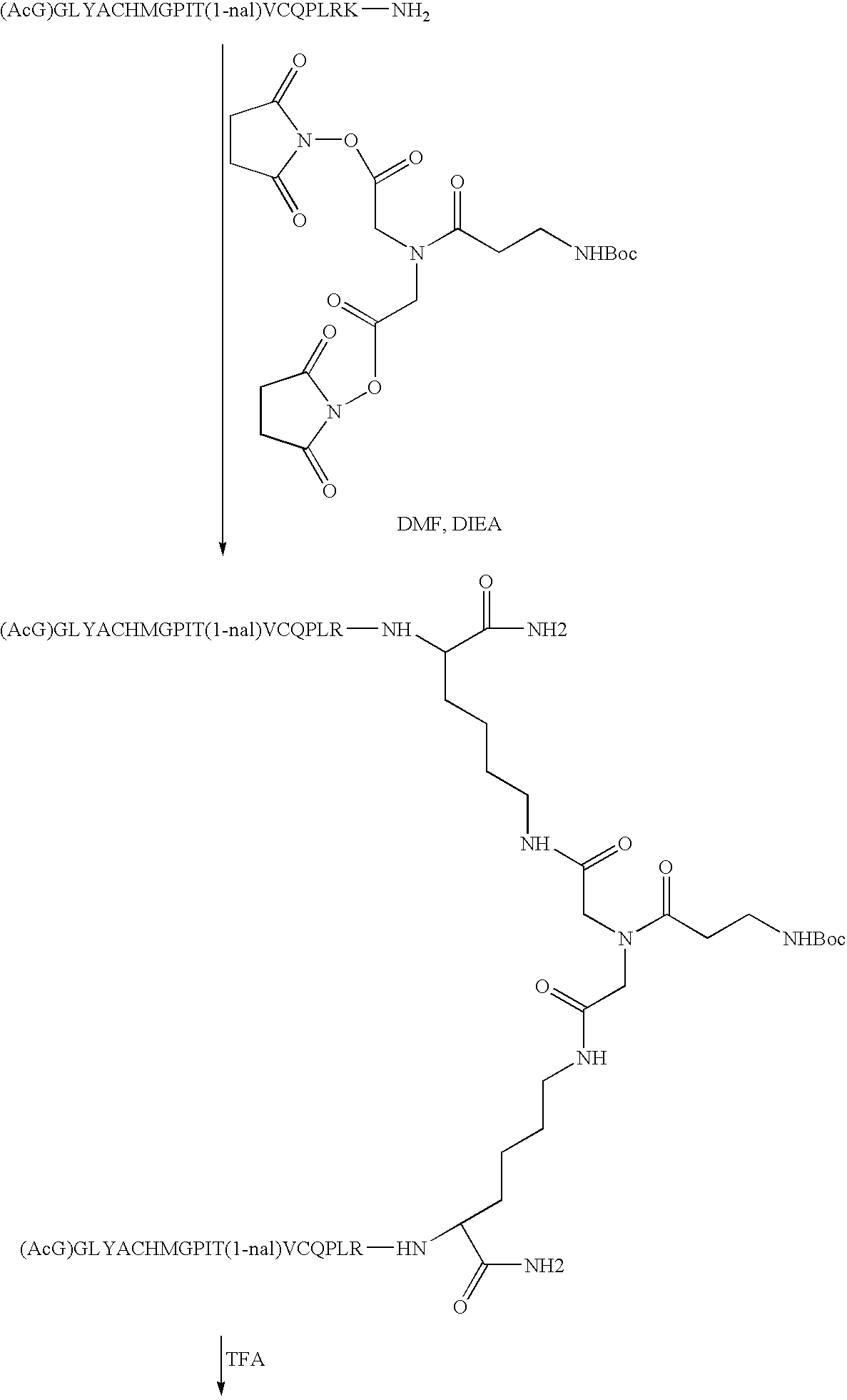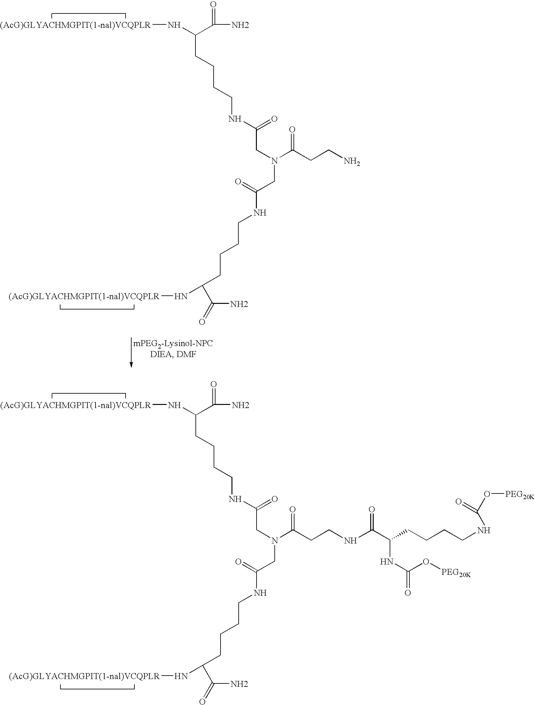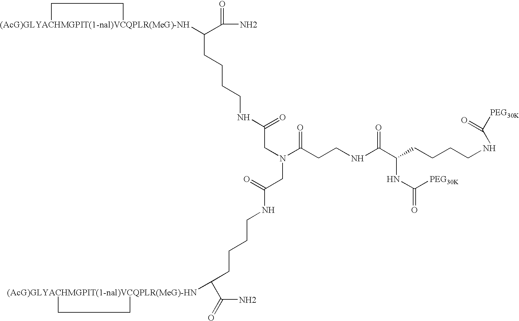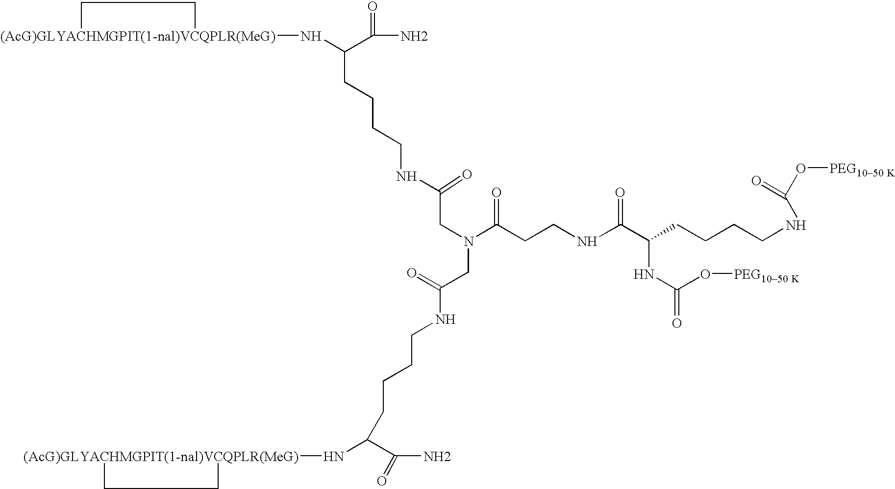 Alternatively, one or more of the lysine residues can be a D-lysine, giving rise to alternative stereochemistries that will be readily appreciated by those of ordinary skill in the art. Where each monomer of the homodimer has the amino acid sequence, (AcG)GLYACHMGPIT(1-nal)VCQPLR(MeG)K (SEQ ID NO: 2) and both N1 and N2 of the spacer are covalently attached via an amide linkage to an activated PEG moiety, the novel peptide compounds of the invention may be represented as follows: