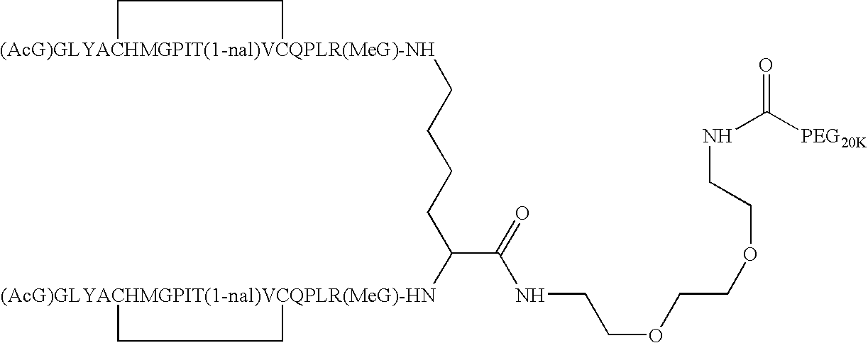 Thus, the novel peptides of the invention can also contain a PEG moiety, which is covalently attached via a carbamate linkage or an amide linkage to the tertiary amide linker of the peptide dimer. PEG is a water soluble polymer that is pharmaceutically acceptable. PEG for use in the present invention may be linear, unbranched PEG having a molecular weight of about 20 kilodaltons (20K) to about 60K (the term “about” indicating that in preparations of PEG, some molecules will weigh more, some less, than the stated molecular weight). Most preferably, the PEG has a molecular weight of about 30K to about 40K. One skilled in the art will be able to select the desired polymer size based on such considerations as the desired dosage; circulation time; resistance to proteolysis; effects, if any, on biological activity; ease in handling; degree or lack of antigenicity; and other known effects of PEG on a therapeutic peptide. Peptides, peptide dimers and other peptide-based molecules of the invention can be attached to water-soluble polymers (e.g., PEG) using any of a variety of chemistries to link the water-soluble polymer(s) to the receptor-binding portion of the molecule (e.g., peptide+spacer). A typical embodiment employs a single attachment junction for covalent attachment of the water soluble polymer(s) to the receptor-binding portion, however in alternative embodiments multiple attachment junctions may be used, including further variations wherein different species of water-soluble polymer are attached to the receptor-binding portion at distinct attachment junctions, which may include covalent attachment junction(s) to the spacer and/or to one or both peptide chains. In some embodiments, the dimer or higher order multimer will comprise distinct species of peptide chain (i.e., a heterodimer or other heteromultimer). By way of example and not limitation, a dimer may comprise a first peptide chain having a PEG attachment junction and the second peptide chain may either lack a PEG attachment junction or utilize a different linkage chemistry than the first peptide chain and in some variations the spacer may contain or lack a PEG attachment junction and said spacer, if PEGylated, may utilize a linkage chemistry different than that of the first and/or second peptide chains. An alternative embodiment employs a PEG attached to the spacer portion of the receptor-binding portion and a different water-soluble polymer (e.g., a carbohydrate) conjugated to a side chain of one of the amino acids of the peptide portion of the molecule. A wide variety of polyethylene glycol (PEG) species may be used for PEGylation of the receptor-binding portion (peptides+spacer). Substantially any suitable reactive PEG reagent can be used. In preferred embodiments, the reactive PEG reagent will result in formation of a carbamate or amide bond upon conjugation to the receptor-binding portion. Suitable reactive PEG species include, but are not limited to, those which are available for sale in the Drug Delivery Systems catalog (2003) of NOF Corporation (Yebisu Garden Place Tower, 20-3 Ebisu 4-chome, Shibuya-ku, Tokyo 150-6019) and the Molecular Engineering catalog (2003) of Nektar Therapeutics (490 Discovery Drive, Huntsville, Ala. 35806). For example and not limitation, the following PEG reagents are often preferred in various embodiments: mPEG2-NHS, mPEG2-ALD, multi-Arm PEG, mPEG(MAL)2, mPEG2(MAL), mPEG-NH2, mPEG-SPA, mPEG-SBA, mPEG-thioesters, mPEG-Double Esters, mPEG-BTC, mPEG-ButyrALD, mPEG-ACET, heterofunctional PEGs (NH2-PEG-COOH, Boc-PEG-NHS, Fmoc-PEG-NHS, NHS-PEG-VS, NHS-PEG-MAL), PEG acrylates (ACRL-PEG-NHS), PEG-phospholipids (e.g., mPEG-DSPE), multiarmed PEGs of the SUNBRITE series including the GL series of glycerine-based PEGs activated by a chemistry chosen by those skilled in the art, any of the SUNBRITE activated PEGs (including but not limited to carboxyl-PEGs, p-NP-PEGs, Tresyl-PEGs, aldehyde PEGs, acetal-PEGs, amino-PEGs, thiol-PEGs, maleimido-PEGs, hydroxyl-PEG-amine, amino-PEG-COOH, hydroxyl-PEG-aldehyde, carboxylic anhydride type-PEG, functionalized PEG-phospholipid, and other similar and/or suitable reactive PEGs as selected by those skilled in the art for their particular application and usage. The novel peptides of the invention can also contain two PEG moieties that are covalently attached via a carbamate or an amide linkage to a spacer moiety, wherein the spacer moiety is covalently bonded to the tertiary amide linker of the peptide dimer. Each of the two PEG moieties used in such embodiments of the present invention may be linear and may be linked together at a single point of attachment. Each PEG moiety preferably has a molecular weight of about 10 kilodaltons (10K) to about 60K (the term “about” indicating that in preparations of PEG, some molecules will weigh more, some less, than the stated molecular weight). Linear PEG moieties are particularly preferred. More preferably, each of the two PEG moieties has a molecular weight of about 20K to about 40K, and still more preferably between about 20K and about 40K. Still more preferably, each of the two PEG moieties has a molecular weight of about 20K. One skilled in the art will be able to select the desired polymer size based on such considerations as the desired dosage; circulation time; resistance to proteolysis; effects, if any, on biological activity; ease in handling; degree or lack of antigenicity; and other known effects of PEG on a therapeutic peptide. The present invention also comprises peptide agonists that are homodimers of peptide monomers having the amino acid sequence (AcG)GLYACHMGPIT(1-nal)VCQPLR(MeG) (SEQ ID NO: 3), where each amino acid is indicated by standard one letter abbreviation, “(AcG)” is N-acetylglycine, “(1-nal)” is 1-naphthylalanine, and “(MeG)” is N-methylglycine, also known as sarcosine. Each peptide monomer of the peptide dimer contains an intramolecular disulfide bond between the cysteine residues o