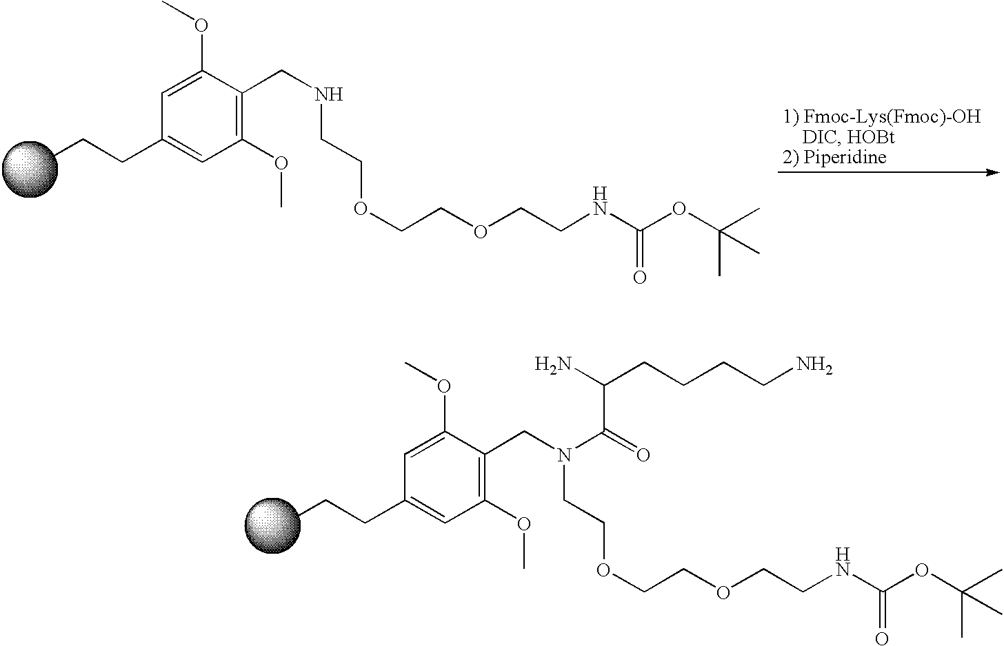 Step 6—Synthesis of TentaGel-linker-TAP-Lys: The resin from above was treated with a activated solution of Fmoc-Lys(Fmoc)-OH (prepared from 5 eq. of amino acid and 5 eq. of HATU dissolved at 0.5 M in DMF, followed by the addition of 10 eq. of DIEA) and allowed to gently shake 14 h. The resin was washed (DMF, THF, DCM, MeOH) and dried to yield the protected resin. Residual amine groups were capped by treating the resin with a solution of 10% acetic anhydride, 20% pyridine in DCM for 20 minutes, followed by washing as above. The Fmoc groups are removed by gently shaking the resin in 30% piperidine in DMF for 20 minutes, followed by washing (DMF, THF, DCM, MeOH) and drying.
