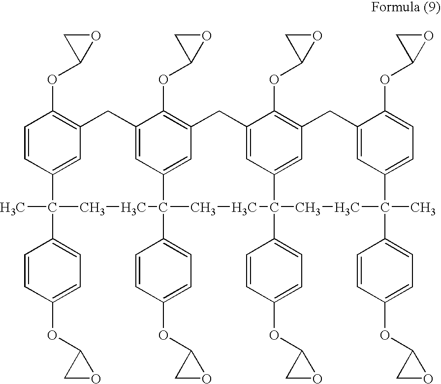 Epoxy resin (A): HP-7200 (manufactured by Dainippon 28.5 parts Ink and Chemicals, Inc.) Epoxy resin (B): EHPE 3150 (epoxy equivalent of 28.5 parts about 180) (manufactured by Daicel Chemical Industries, Ltd.) Bis-phenol A type epoxy resin: EP-5100-75X (epoxy 38 parts equivalent of about 630, manufactured by Adeka Corporation) Photocationic polymerization initiator: SP-172 1.5 parts (manufactured by Adeka Corporation) Additive (silane coupling agent): A-187 3.5 parts (manufactured by Nihonunika Corporation) Example 10