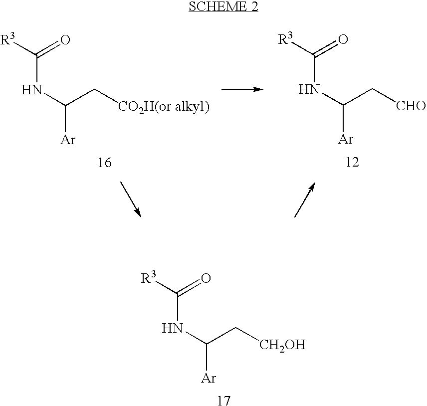 The β-acylamino aldehyde 12 can be prepared by direct reduction of a β-acylamino acid 16 or ester with a hydride reducing agent such as DIBAL-H or 16 can be reduced to the corresponding alcohol and re-oxidized to the aldehyde with a SO3-pyridine and TEA or alternative oxidizing agent. The R3 moiety can either be the moiety present in the final compound or alternatively R3C(═O) can be a protecting group, e.g., R3=O-tert-Bu (BOC), which can be removed to liberate a primary amine at an advantageous stage in the synthetic sequence which can be acylated or sulfonylated as desired. Compounds according to formula I wherein R2 is optionally substituted phenyl are generally conveniently prepared utilizing the BOC protecting group as R3C(═O). Deprotection and acylation is conveniently carried out in the latter stage of the synthesis. The specific acylating agents used are described in the following examples.
