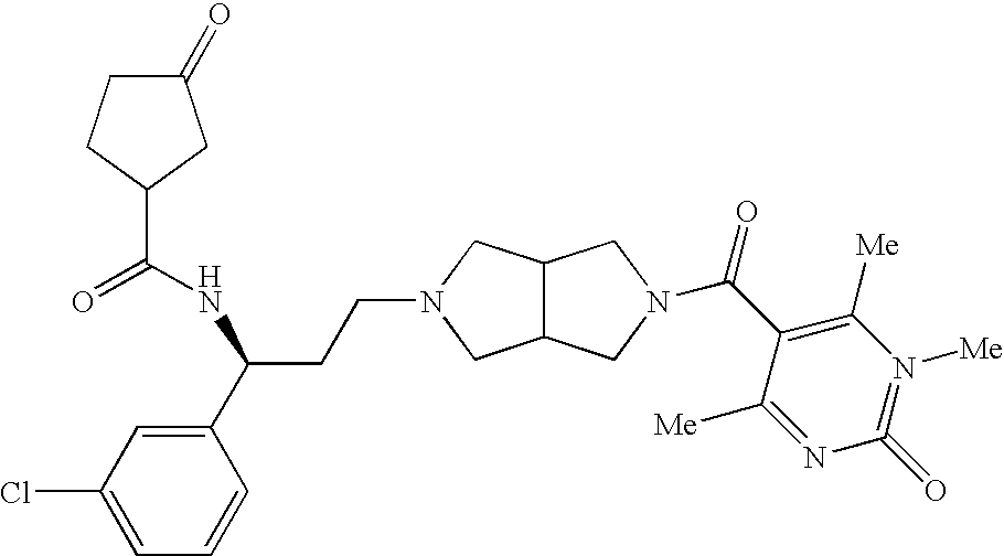 3-Oxo-cyclopentanecarboxylic acid {(S)-1-(3-chloro-phenyl)-3-[5-(1,4,6-trimethyl-2-oxo-1,2-dihydro-pyrimidine-5-carbonyl)-hexahydro-pyrrolo[3,4-c]pyrrol-2-yl]-propyl}-amide (II-4)