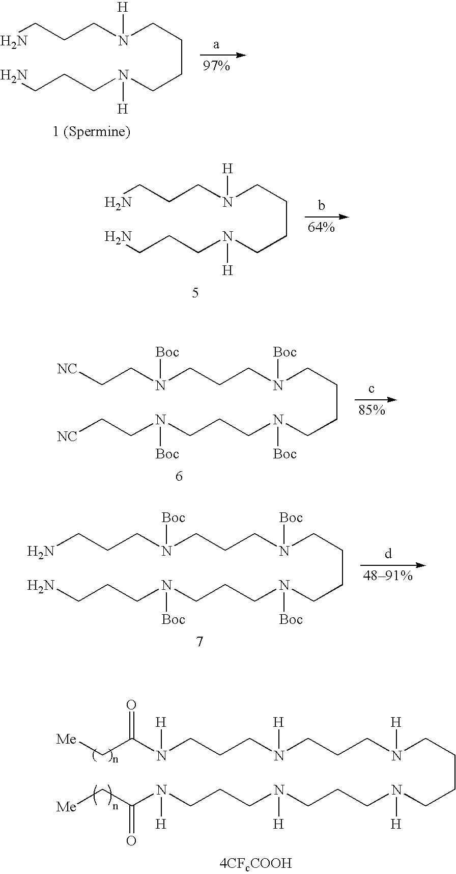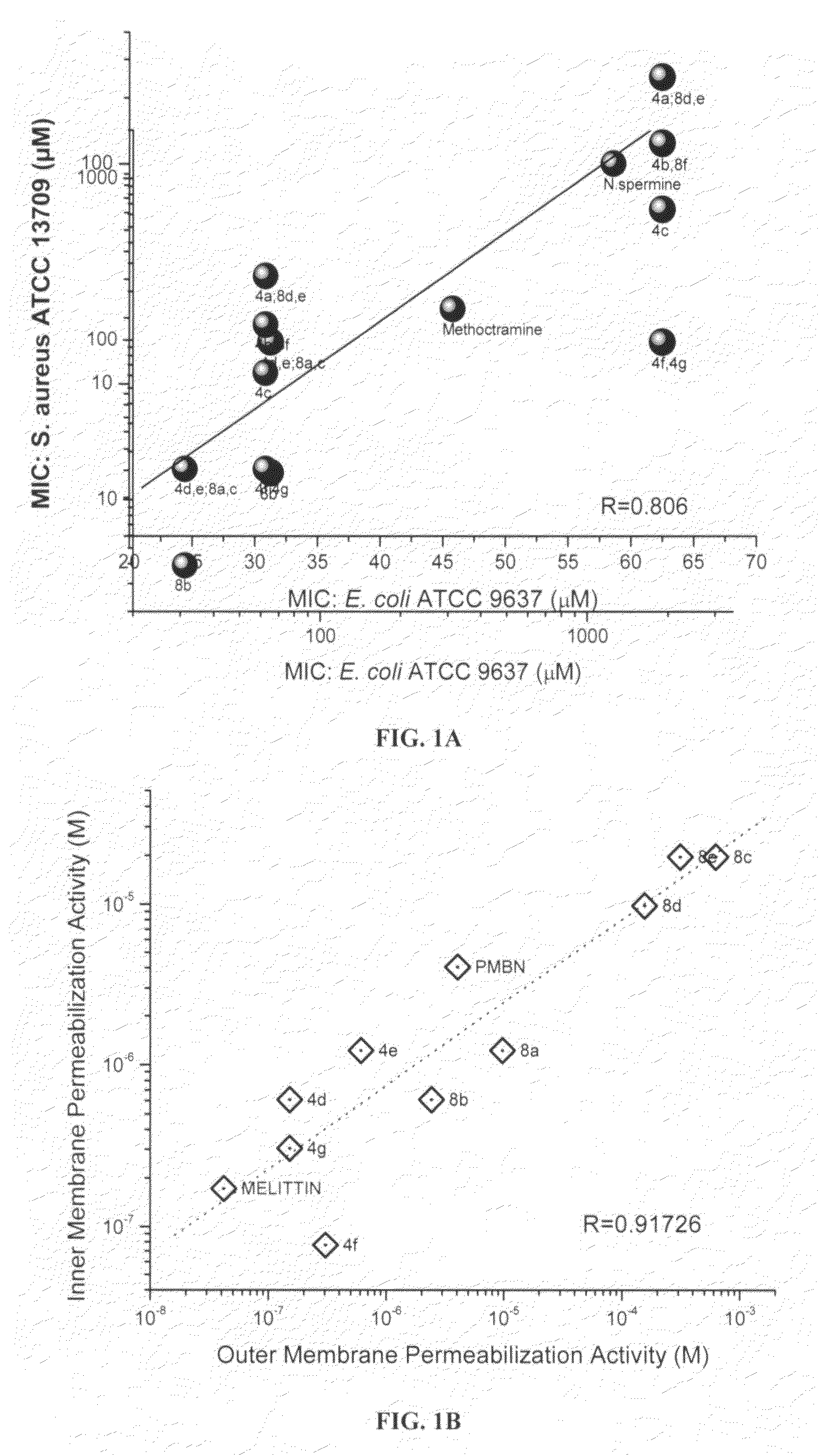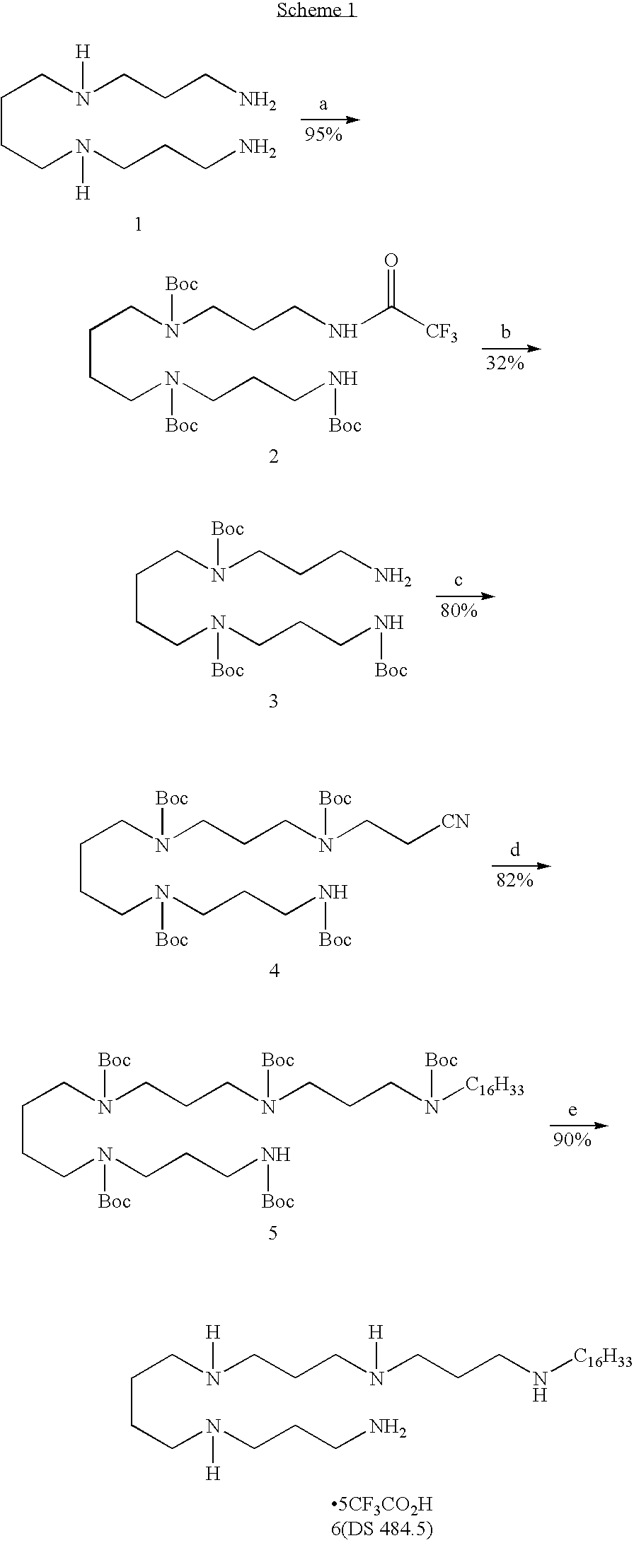 MICs of lipopolyamines against MIC μM; (μg/ml) Compound 4a 62.5; (47.3) 250; (189.3) 4b 62.5; (53.4) 125; (106.96) 4c 62.5; (54.3) 62.5; (54.3) 4d 31.25; (28.9) 15.6; (14.4) 4e 31.25; (29.3) 15.6; (14.6) 4f 62.5; (60.4) 15.6; (15.1) 4g 62.5; (62.2) 15.6; (15.5) 8a 31.25; (32.9) 15.6; (16.4) 8b 31.25; (33.7) 3.9; (4.2) 8c 31.25; (35.5) 15.6; (17.7) 8d 62.5; (76.3) 250; (305.3) 8e 62.5; (79.4) 250; (319.3) 8f 62.5; (83.3) 125; (166.7) PMB 3.9; (5.4) 125; (173.2) PMBN 250; (240.7) 500; (481.5) Melittin 175; (498.1) 5.5; (15.6) Naphthylacetylspermine 1250; (599.8) 1250; (599.8) Methoctramine 312.5; (227.7) 156.25; (113.8) EXAMPLE 3