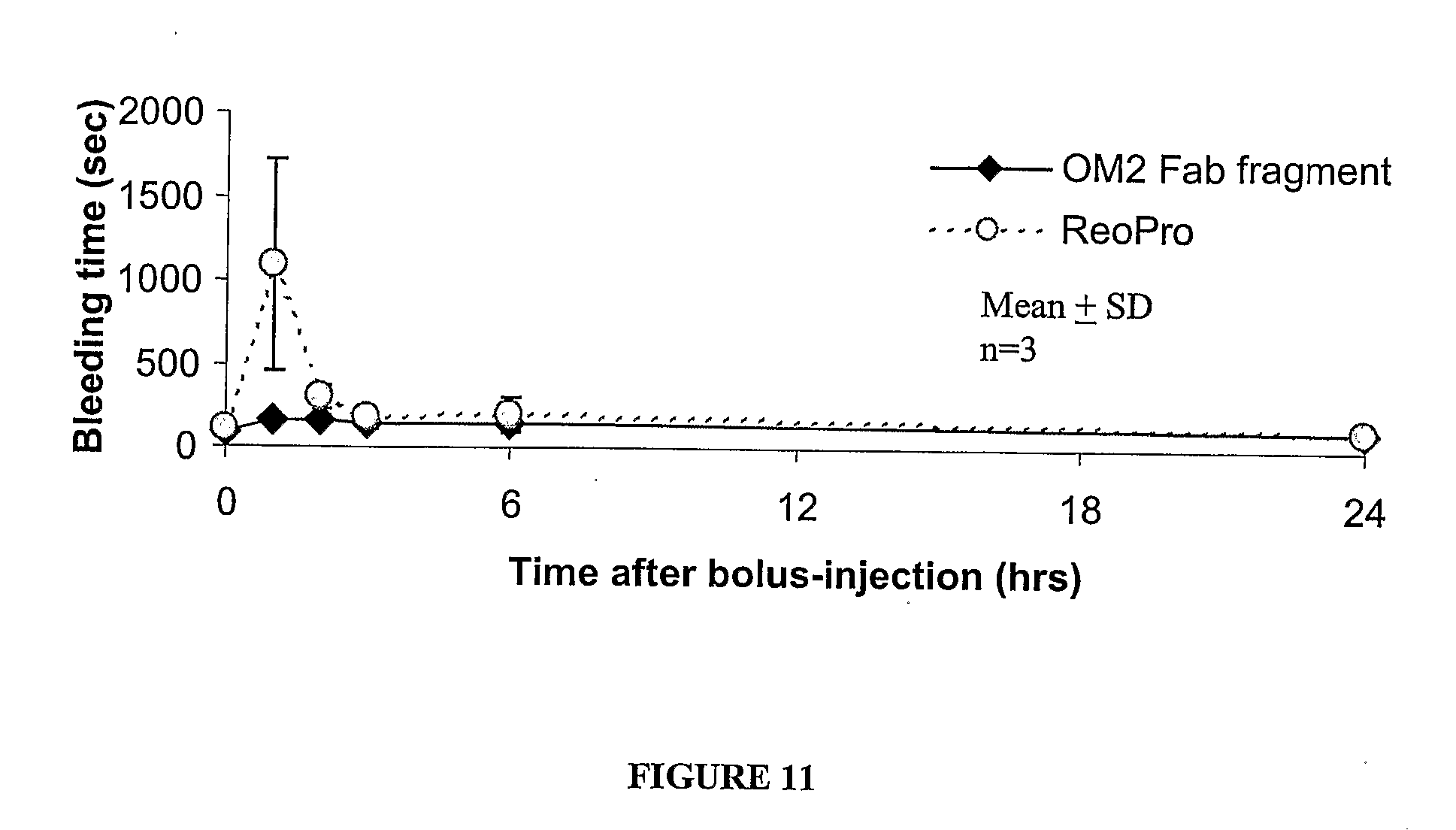 As shown in FIG. 11, the OM2 Fab fragment slightly prolonged skin bleeding time between 1 and 6 hrs after administration (1.7 to 2.0 times longer than baseline level). Bleeding time returned to nearly baseline level at 24 hrs after injection, coincident with the recovery of platelet aggregation.