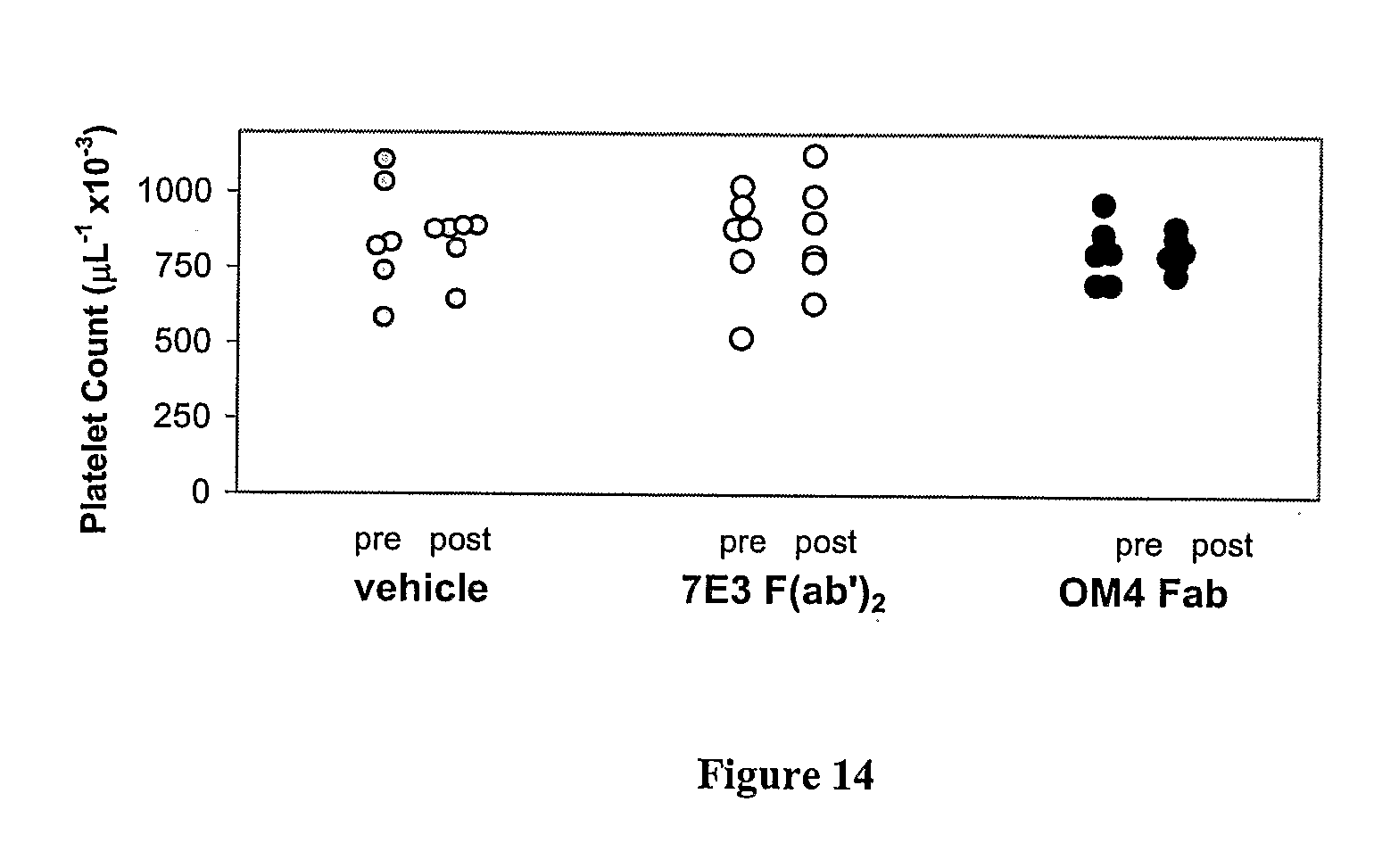 Similar to the nail bleeding time, tail bleeding time was dramatically prolonged in all animals by the administration of 7E3 F(ab′)2 fragment while administration of OM4 Fab had no effect in four out of six animals tested (FIG. 13B). In two animals, the tail bleeding time was prolonged to 26 and >30 minutes. In contrast, the 7E3 F(ab′)2 fragment prolonged tail bleeding time to beyond 30 minutes in all cases (FIG. 13B). There was no significant effect of intravenous administration of vehicle, OM4 Fab and 7E3 F(ab′)2 fragment on platelet count (FIG. 14).
