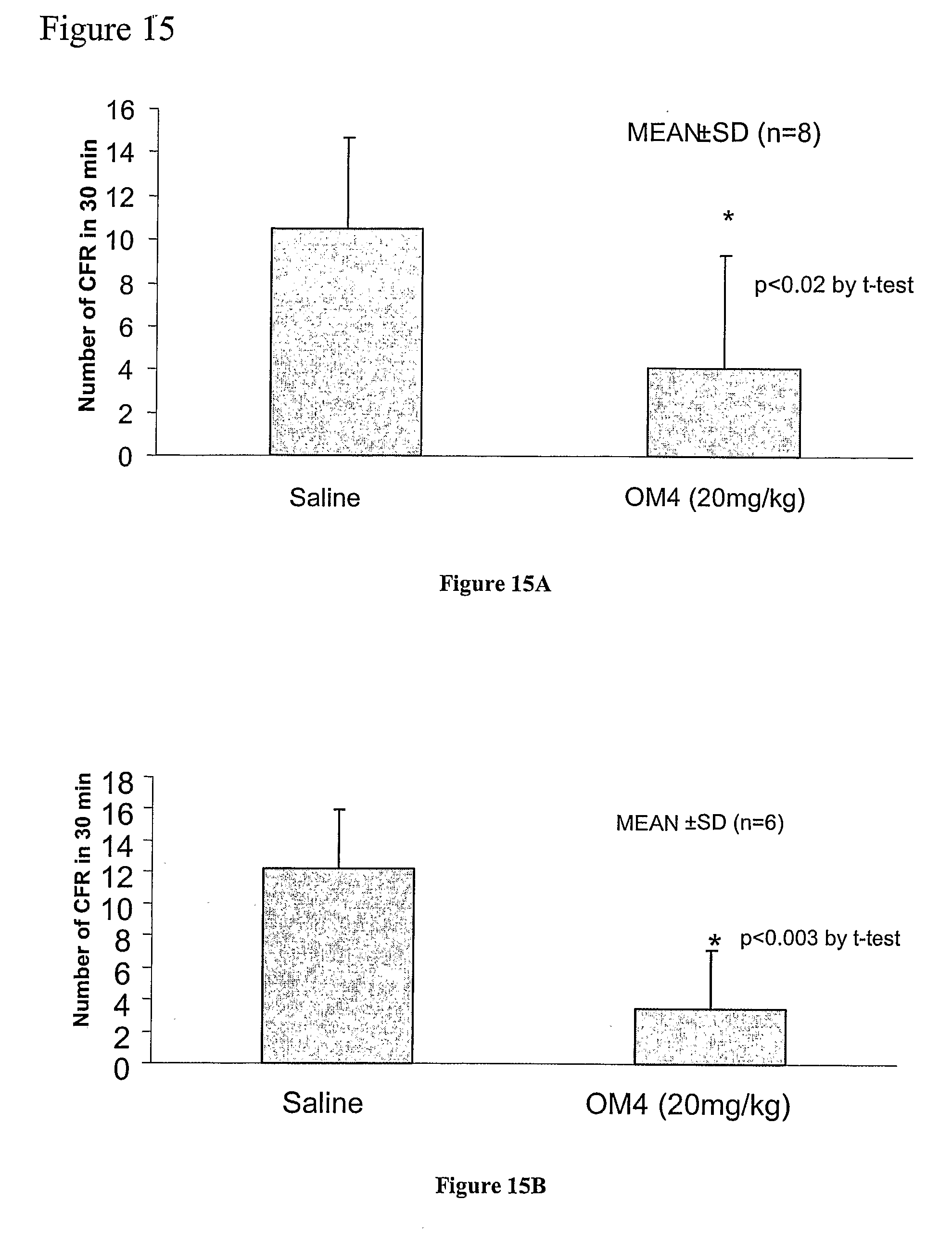 Pre-iniury groups. OM4 Fab fragment injected at 20 mg/kg before mechanic injury reduced the number of CFRs from 10.5±4.1 (mean±SD) to 4.1±5.2 (FIG. 15A). This reduction was statistically significant (p<0.02, t-test).