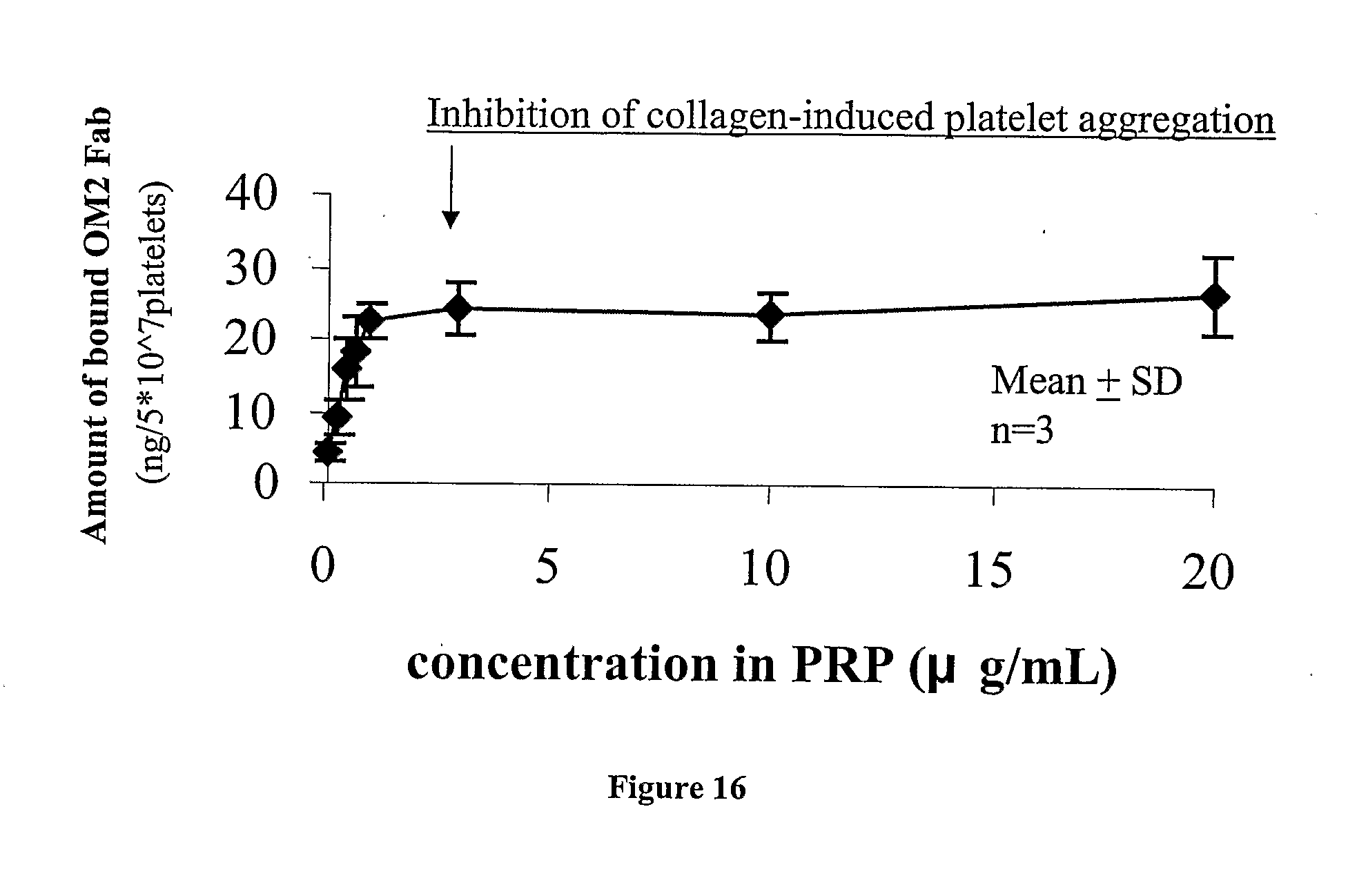 In the occupancy rate assay, occupancy rate was assumed to be at 100% at 20 μg/mL of biotinylated OM2 Fab fragment (bound amount: 26.4±5.5 ng/5×107 platelets). As shown in FIG. 16, the amount of bound OM2 Fab fragment saturated at 3 μg/mL (24.3±3.5 ng/5×107 platelets). The occupancy rate of biotinylated OM2 Fab fragment at 3 μg/mL was 92%. This result suggests that an occupancy rate of more than 90% of GPVI on platelet surface is required to exert maximal inhibitory effects on collagen-induced platelet aggregation.