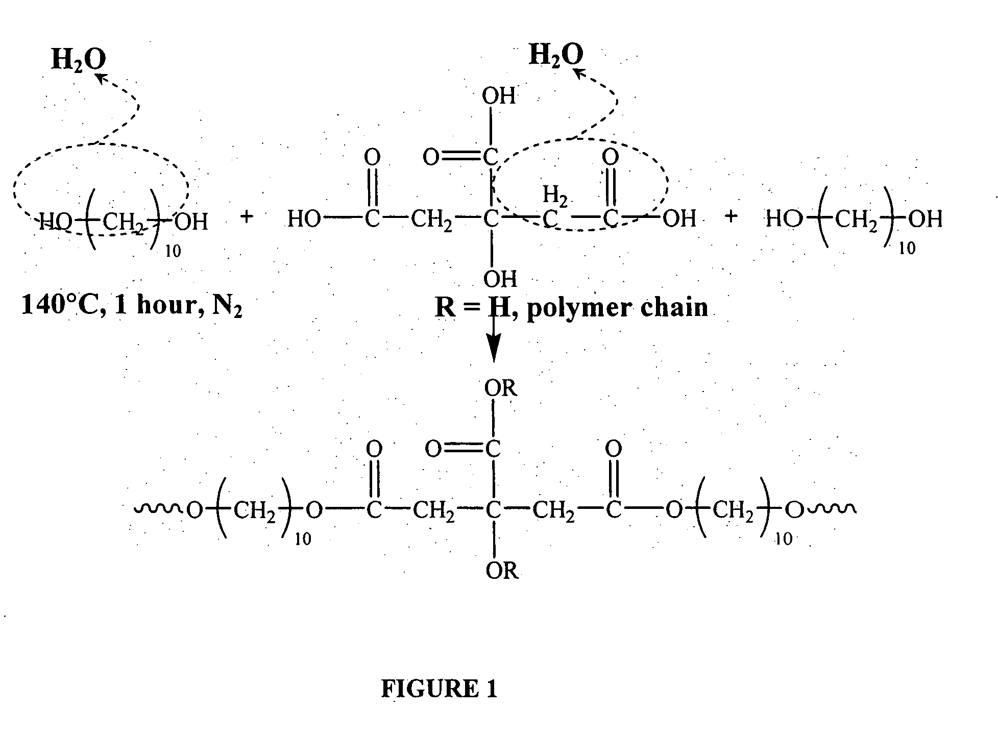 Where A is a linear, aliphatic diol and C also is a linear aliphatic diol. B is citric acid. The citric acid co-polymers of the present invention are made up of multiples of the above formula, as defined by the integer n, which may be any integer greater than 1. It is contemplated that n may range from 1 to about 1000 or more. It is particularly contemplated that n may be 1, 2, 3, 4, 5, 6, 7, 8, 9, 10, 11, 12, 13, 14, 15, 16, 17, 18, 19, 20, 21, 22, 23, 24, 25, 26, 27, 28, 29, 30, 31, 31, 32, 33, 34, 35, 36, 37, 38, 39, 40, 41, 42, 43, 44, 45, 46, 47, 48, 49, 50, or more. In preferred embodiments, the identity of “A” above is poly 1,10-decanediol and in another preferred embodiment the identity of A is 1,8-octanediol. However, it should be understood that these are merely exemplary linear, aliphatic diols. Those of skill are aware of other aliphatic alcohols that will be useful in polycondensation reactions to produce citric acid polymers. Exemplary such aliphatic diols include any diols of between about 2 carbons and about 20 carbons. While the diols are preferably aliphatic, linear, unsaturated diols, with the hydroxyl moiety being present at the C1 and Cx position (where x is the terminal carbon of the diol), it is contemplated that the diol may be an unsaturated diol in which the aliphatic chain contains one or more double bonds. The preferred identity for “C” in one embodiment is 1,8-octanediol, however as with moiety “A,” “C” may be any other aliphatic alcohols. While in specific embodiments, both A and C are both the same diol, e.g., 1,8-octanediol, it should be understood that A and C may have different carbon lengths. For example, A may be 2, 3, 4, 5, 6, 7, 8, 9, 10, 11, 12, 13, 14, 15, 16, 17, 18, 19, 20 or more carbons in length, and C may independently be 2, 3, 4, 5, 6, 7, 8, 9, 10, 11, 12, 13, 14, 15, 16, 17, 18, 19, 20 or more carbons in length. Exemplary methods for the polycondensation of the citric acid with the linear diols are provided in this Example. These materials are then used as starting materials for the grafts described in Example 2. Synthesis of Poly(1,10-decanediol-co-citric acid) (PDC) In a typical experiment, 19.212 g citric acid and 17.428 g 1,10-decanediol were added to a 250 ml three-neck round-bottom flask, fitted with an inlet adapter and an outlet adapter. The mixture was melted within 15 min by stirring at 160-165° C. in silicon oil bath, and then the temperature of the system was lowered to 120° C. The mixture was stirred for half an hour at 120° C. to get the pre-polymer. Nitrogen was vented throughout the above procedures. The pre-polymer was post- polymerized at 60° C., 80° C. or 120° C. with and without vacuum for predetermined time from one day to 3 weeks depending on the temperature to achieve the Poly(1,10-decanediol-co-citric acid). Nitrogen was introduced into the reaction system before the polymer was taken out from reaction system. Preparation of Poly(1,8-Octanediol-co-citric acid) (POC) In a typical experiment, 19.212 g citric acid and 14.623 g octanediol were added to a 250 mL three-neck round-bottom flask, fitted with an inlet adapter and an outlet adapter. The mixture was melted within 15 min by stirring at 160-165° C. in silicon oil bath, and then the temperature of the system was lowered to 140° C.; The mixture was stirred for another 1 hr at 140° C. to get the pre-polymer. Nitrogen was vented throughout the above procedures. The pre-polymer was post- polymerized at 60° C., 80° C. or 120° C. with and without vacuum for predetermined time (from one day to 3 weeks depending on the temperature, with the lower temperatures requiring longer times) to achieve the Poly(1,8-octanediol-co-citric acid). Nitrogen was introduced into the reaction system before the polymer was taken out from the reaction system. Porous scaffolds of POC (tubular and flat sheets) were prepared via a salt leaching technique as follows: POC pre-polymer was dissolved into dioxane to form a 25 wt % solution, and then the sieved salt (90-120 microns) was added into pre-polymer solution to serve as a porogen. The resulting slurry was cast into a poly(tetrafluoroethylene) (PTFE) mold (square and tubular shape). After solvent evaporation for 72 h, the mold was transferred into a vacuum oven for post-polymerization. The salt in the resulting composite was leached out by successive incubations in water (produced by Milli-Q water purification system every 12 h for a total 96 h. The resulting porous scaffold was air-dried for 24 hr and then vacuum dried for another 24 hrs. The resulting scaffold was stored in a dessicator under vacuum before use. Porous scaffolds are typically preferred when cells are expected to migrate through a 3-dimensional space in order to create a tissue slice. Solid films would be used when a homogenous surface or substrate for cell growth is required such as an endothelial cell monolayer within the lumen of a vascular graft. Using similar techniques, porous scaffolds of PDC or other poly(diol)citrates can be prepared. In other embodiments, biphasic scaffolds can be prepared. Biphasic scaffolds consist of an outside porous phase and an inside non-porous phase as depicted in the schematic drawing shown in FIG. 15 of PCT PCT/US2004/030631, incorporated herein by reference. The non-porous phase is expected to provide a continuous surface for EC adhesion and spreading, mechanical strength, and elasticity to the scaffold. The porous phase will facilitate the 3-D growth of smooth muscle cells. Biphasic scaffolds were fabricated via the following procedures. Briefly, glass rods (˜3 mm diameter) were coated with the pre-polymer solution and air dried to allow for solvent evaporation. Wall thickness of the tubes can be controlled by the number of coatings and the percent pre-polymer in the solution. The pre-coated pre-polymer was partially post-polymerized under 60° C. for 24 hr; the pre-polymer-coated glass rod is then inserted c