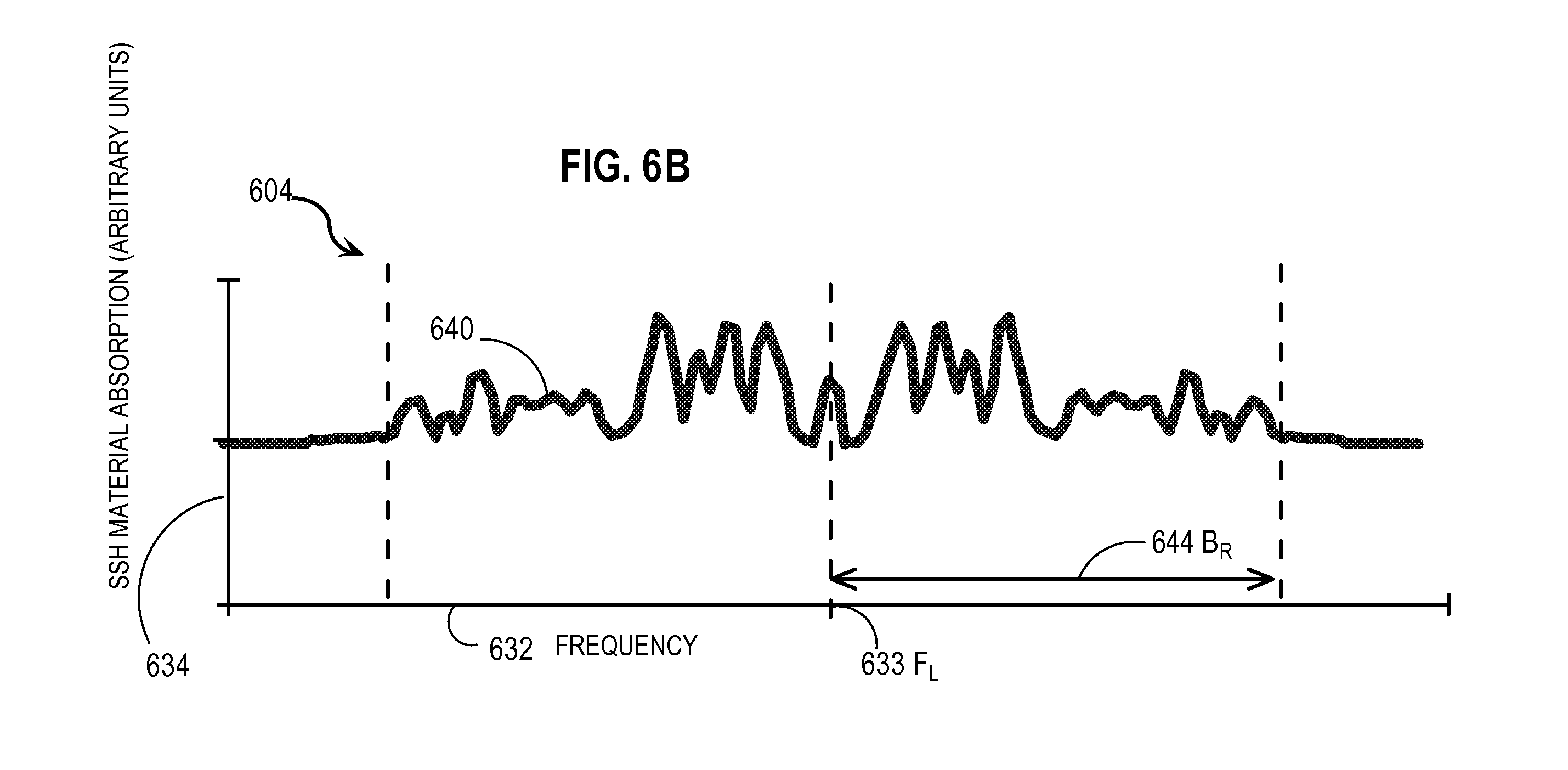 In some cases, the response waveform phase and amplitude can be directly observed. For some other cases, e.g., at optical frequencies, in order to obtain the full information about both the phase and the amplitude, a heterodyne detection scheme is used, where a reference waveform interferes with the response signal. Typically the reference waveform is close in frequency with the response signal so that a lower frequency beat output is produced that is readily observable with available photo-detectors and high dynamic-range digitizers. Under some conditions, heterodyne detection is automatic, such as when the probe waveform spatially overlaps the response signal and acts as a reference, as in the case of absorption or dispersion. In other cases, the output signal is distinct from the probe waveform and a reference waveform is made to interfere with the response signal before being received by a measurement apparatus, such as a digitizing detector. In some embodiments, the reference waveform is also a chirped optical waveform. 2.2 Apparatus for High Bandwidth ADC EM ADC 400 includes one or more electromagnetic source 410, electromagnetic couplers 420 In the illustrated embodiment 400, EM source 410 includes an input laser 412. This laser 412 provides stabilized optical carrier frequency beams 413 The EM couplers 420 direct EM waveforms, such as optical carrier waveform 413 The EM modulators 430 modulate the carrier waveforms to produce signal waveforms with rich frequency content. In the illustrated embodiment, EM modulators 430 include electro-optic modulators (EOMs) 434 In the illustrated embodiment, the target analog signal input 102 receives a radio frequency signal that is modulated onto optical carrier waveform 413 In the illustrated embodiment, phase-sensitive spectral information is provided by causing the optical waveform 425 with the target analog signal to interact with a delayed reference waveform 415 also directed onto SSH material 450 by EM coupler 420 The SSH material 450 records one or more waveforms 426 The phase-sensitive spectrum recorded in SSH material 450 is read out using a chirped optical waveform over the frequency band of interest. In some embodiments, more than one chirped optical waveform is used to read out the phase-sensitive spectrum. In the illustrated embodiment, the chirped optical waveform is produced by modulating optical carrier waveform 413 For heterodyne readout processes, a heterodyne reference optical waveform (e.g., waveform 427 The EM detector/digitizer 460 includes one or more detectors such as an optical detector that detect the time-varying optical intensity in a certain optical bandwidth. In some embodiments, a one- or two-dimensional array of optical detectors is used to simultaneously detect a response waveform 427 The post-digitized electronics in EM analyzer 470 use electrical signals output by EM detector/digitizer 460 to construct a series of digital values that represent the target analog signal with sample spacing that corresponds to the particular bandwidth desired for the digitization. For example, the post-digitized processor applies any applicable filtering and corrections to generate the phase-sensitive spectrum; and then applies an inverse Fourier transform and extracts a series of values that represent the target analog signal. The processes performed by post-digitized processor 470 are described in more detail below with reference to The results of the processing by post-digitized processor 470 are presented at target digital signal output 109. 2.3 Theoretical Considerations The use of the reference signal and processing performed in post-digitized processor 470 to provide phase information for the spectrum recorded in SSH material 450 is described in this section based on the following theoretical considerations, for purposes of explanation. However, the invention is not limited by the completeness or accuracy of the following description. The SSH material responds to a broadband optical waveform by recording a high-fidelity replica of its power spectrum in the form of a modified absorption spectrum. A power spectrum, as is well known, is a real-valued function defined by a product of a complex-valued Fourier transform by its complex conjugate, where a complex value includes a real part and an imaginary part that is a factor of the square root of −1. The modified absorption spectrum can be characterized by an average modified absorption coefficient spectrum (e.g., trace 640 in The operation of the illustrated SSH ADC embodiment is a two step process. First, a sensitive spectral holographic recording of the complex Fourier transform of a target signal (also called a signal of interest, SOI) is captured by the SSH material. The target signal on input 102, VS(t), exists on or is modulated onto an optical carrier, along with a delayed reference signal 435, VR(t), and illuminates the SSH material. In some embodiments, the reference waveform precedes the target signal waveform. The second step in the operation of the illustrated SSH-ADC embodiment is the readout process. The modified absorption profile results in a transmission transfer function given by T(f)=exp(− A conventional spectroscopic approach to scanned readout says that the scan rate should be less than δf2, where δf is the spectral resolution of interest. For the SSH ADC embodiment, δf should be greater than the reciprocal of the captured signal's duration, according to the convention. A disadvantage of this approach is that readout of the frequency-domain waveform might take longer than the material lifetime. A recently developed spectral recovery technique allows scan rates over 1000 times faster than the conventional approach, making this technique a useful element of the illustrated SSH ADC embodiment. Artifacts introduced by the fast readout are corrected digitally in post digitized processing, as described below with reference to After a digital absorption s