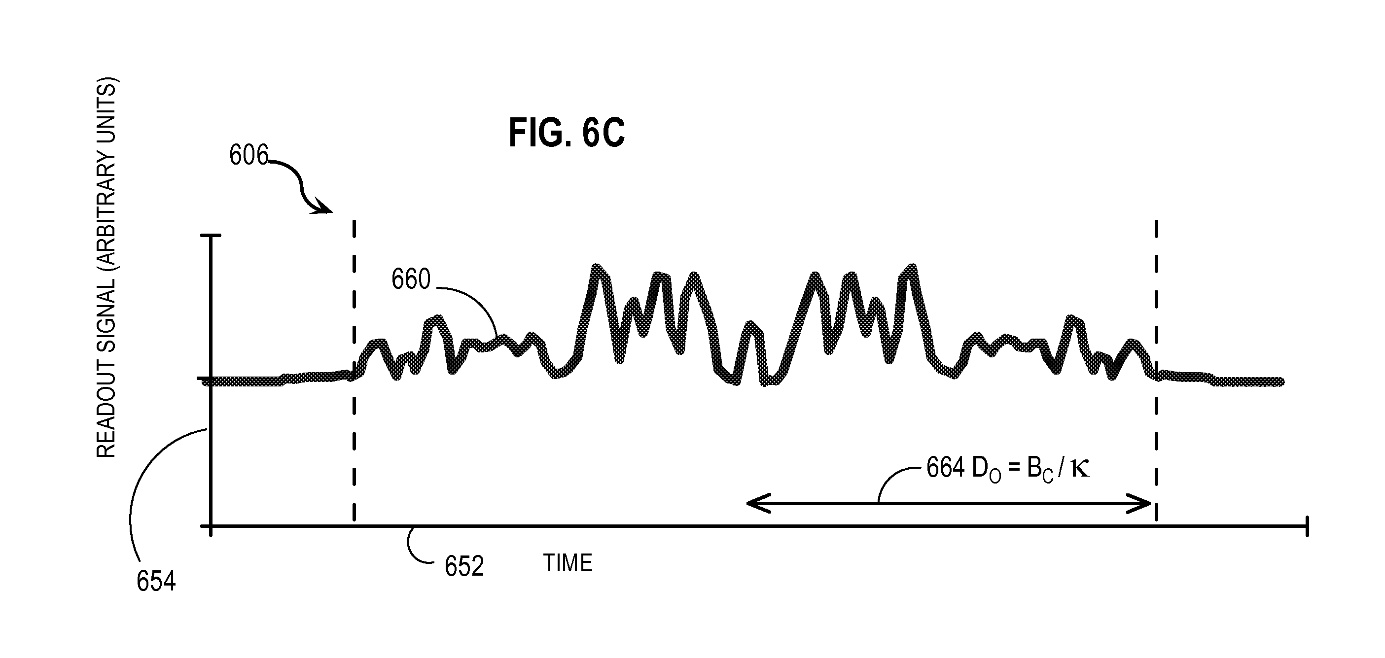 VS(t) of Equation 5; and are not of particular interest, but can be processed to enhance system signal to noise. This term is significant for durations up to the longer of DR and DT. The two portions 686 and 684 are well separated when τ is greater than the longer of DT and DR. Thus in step 520, described above, τ is selected to be greater than the longer of DT and DR. When the two portions are well separated, the first portion 686 is output on the target digital signal output 109 during step 540.