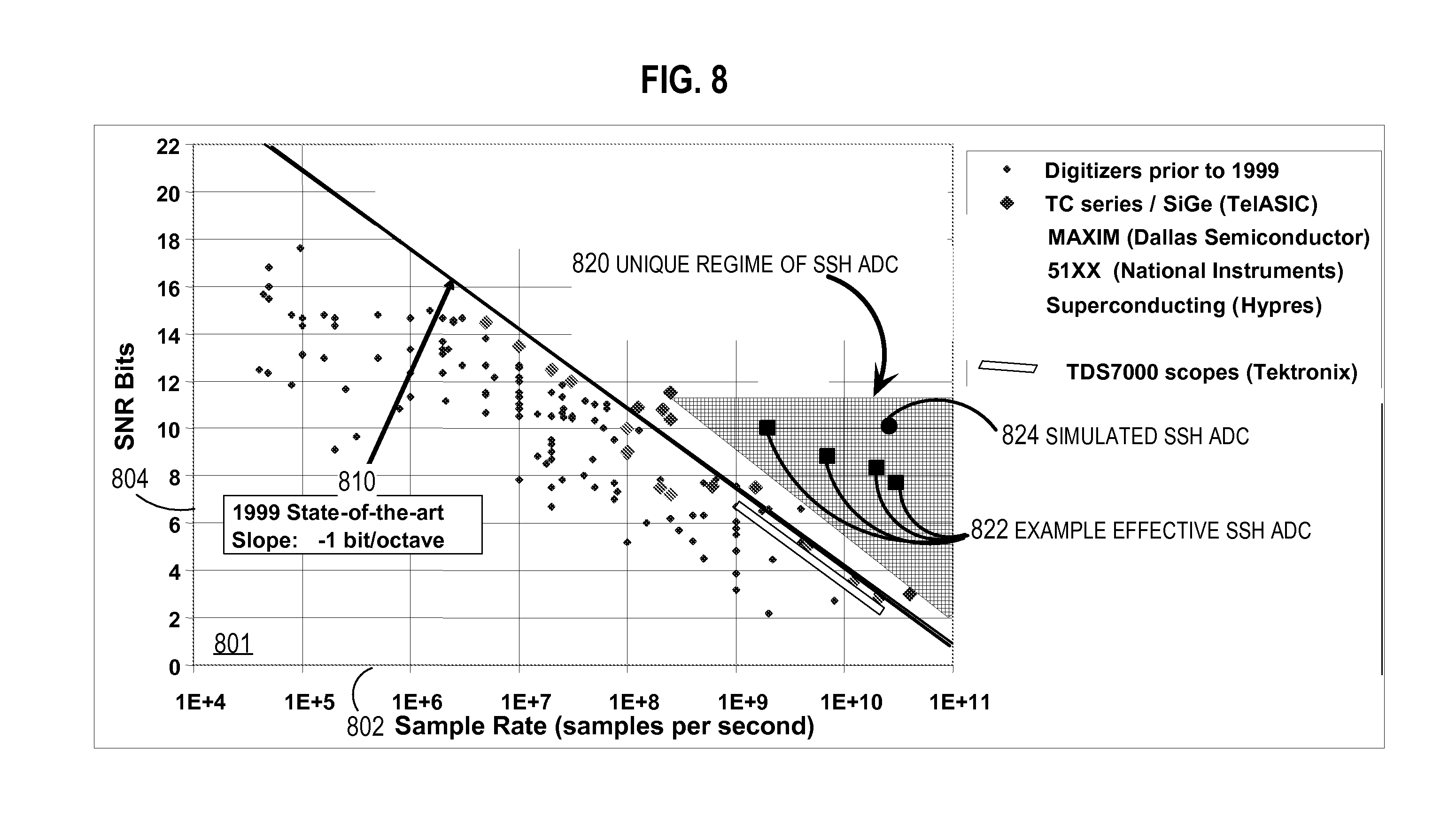means for receiving an input analog waveform to be digitized over a particular frequency band; means for recording a phase-sensitive frequency-domain representation of the input analog waveform; means for digitizing the phase-sensitive frequency-domain representation to produce a spectral series of digital values; and means for determining an output series of digital values that represent the analog waveform based on the spectral series. 20. An apparatus for converting an analog waveform to a series of digital values comprising: