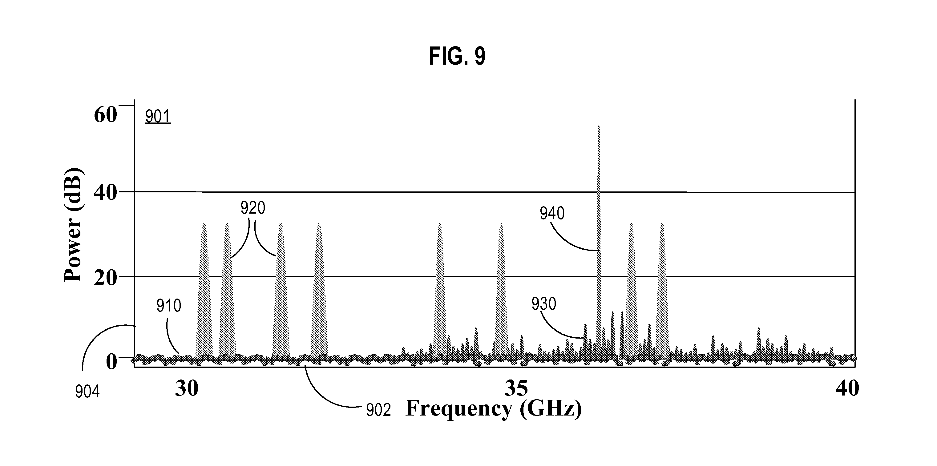 where VS(f) and VR(f) are the Fourier transforms of the target waveform on input 102 and reference waveform 435, respectively, fL=c/λ is the optical carrier frequency, and τ is the delay between the target signal waveform 425 and reference signal waveform 415. It is noted that the combined energy spectrum contains a spectral interference term that holds all the phase and amplitude information needed to reconstruct the target signal. The spectral interference term includes a product term and the complex conjugate (c.c.) of the product term. In the illustrated embodiment, only the product term is used. In other embodiments, the complex conjugate is used by itself or in conjunction with the product term to obtain improved signal to noise. The strength of optical sidebands depends on the modulation depth of the EM modulators 430 used to convert the voltage waveforms, if any (e.g., on input 102 and reference 435) to optical waveforms (e.g., waveforms 425 and 415). Here is considered only the upper sideband of the optical signal. The lower sideband contains similar information and, if included in some embodiments, improves the signal to noise ratio. The residual optical carrier is ignored in this analysis.