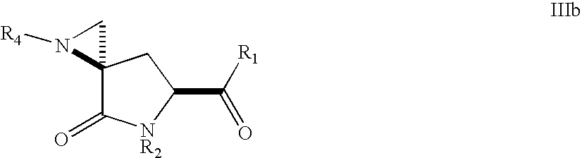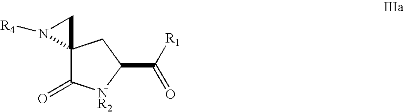Under Option (B) there are essentially two possible types of conditions depending on the reactive species which attack the aziridine ring. On one hand, it is possible to generate the anion of a compound of formula VIIIb by contacting said compound of formula VIIIb with a strong base (i.e. Butyl lithium, etc.). Once the anion of the compound of formula VIIIb is formed, the compound of formula III may be added and the aziridine ring is attacked by the anion of the compound of formula VIIIb. The reaction may further continue by addition of the compound of formula X, for example, an alkylating compound such as methyl iodide (R3=alkyl), etc. The conditions needed to form the anion of a compound of formula VIIIb are known to the skilled person in the art. Some of said species are even commercially available. Alternatively, it is possible to quench the reaction prior to the addition of a compound of formula X, in which case R3 will be hydrogen in the resulting compound of formula II. On the other hand, it is possible to use directly the compound of formula VIIIb. These conditions usually require heat or microwaves and yield a compound of formula II wherein R3 is hydrogen. In still another embodiment, a substantially pure stereoisomer of a compound of formula III, or a mixture thereof, is reacted with a compound of formula VIIIa and with a compound of formula X, to render a substantially pure stereoisomer of a compound of formula II, or mixtures thereof, wherein R5 is R3 and Y is a N-containing organic residue of formula VIIc [Option (C)]. The compounds of formula VIIIa and X have been previously defined. The skilled person in the art knows that reactions such as the transformation of the compound of formula III into a compound of formula II, namely the ring opening of the aziridine ring in the presence of a nucleophile, usually require heat. Microwaves can be used, if desired. The compound of formula II has two chiral centres; therefore, it can be in the form of any of the essentially pure stereoisomers or mixtures thereof. In a particular embodiment, the compound of formula II is selected from the group consisting of: a) a substantially pure compound of formula IIa,