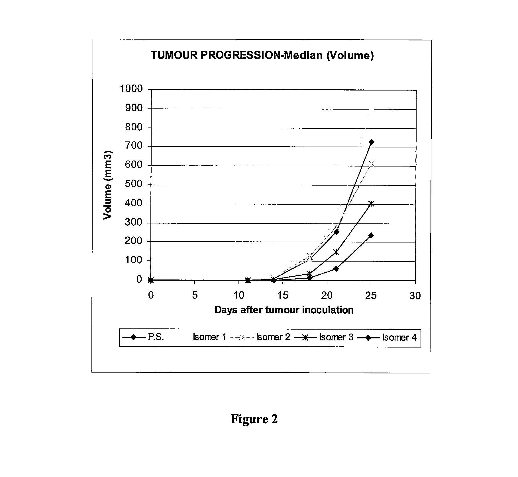 Mice were observed daily and the tumour size recorded twice a week. This was carried out by measuring two perpendicular diameters (L/W) with a calliper. These measures were used to obtain both tumour surface and volume: Tumour surface=L×W (mm2) Tumour volume=L×W2×½(mm3) Results were expressed as single values and/or as the mean±SD or median from each experimental group. Statistics A case-control study was performed with treated and control mice in order to determine whether differences between isomers and administration of placebo were present. The data obtained (tumoral surface and volume) were tested for Normal distribution within the groups—Kolmogorov Smimov test p<0,05—. A non-parametrical hypothesis test for unpaired samples was performed in order to contrast whether isomers had a deletereouos effect on tumoral growth. The U-test of Mann Withney was chosen for being one of the better known non-parametrical tests, anyway, results for this test are equivalent both to those of Wilcoxon's sum of ranges and Kruskal-Wallis two-groups test. Due to the high dispersion of data, outlayers (animals beyond percentile 25 or above percentile 75 for tumour surface at day 25) were excluded of the study. The statistic software used was SPSSv12.0 Thirty mice per group (thirty one from placebo group) were planned to be studied. Two mice from isomer 2 group died for unknown causes the second week after tumour inoculation and were excluded. Tables 1 and 2 show the results of each experimental group expressed as the median values. These tables summarize the median of surface (Table 1) or volume (Table 2) in isomers or P.S. mice group on each day scored.