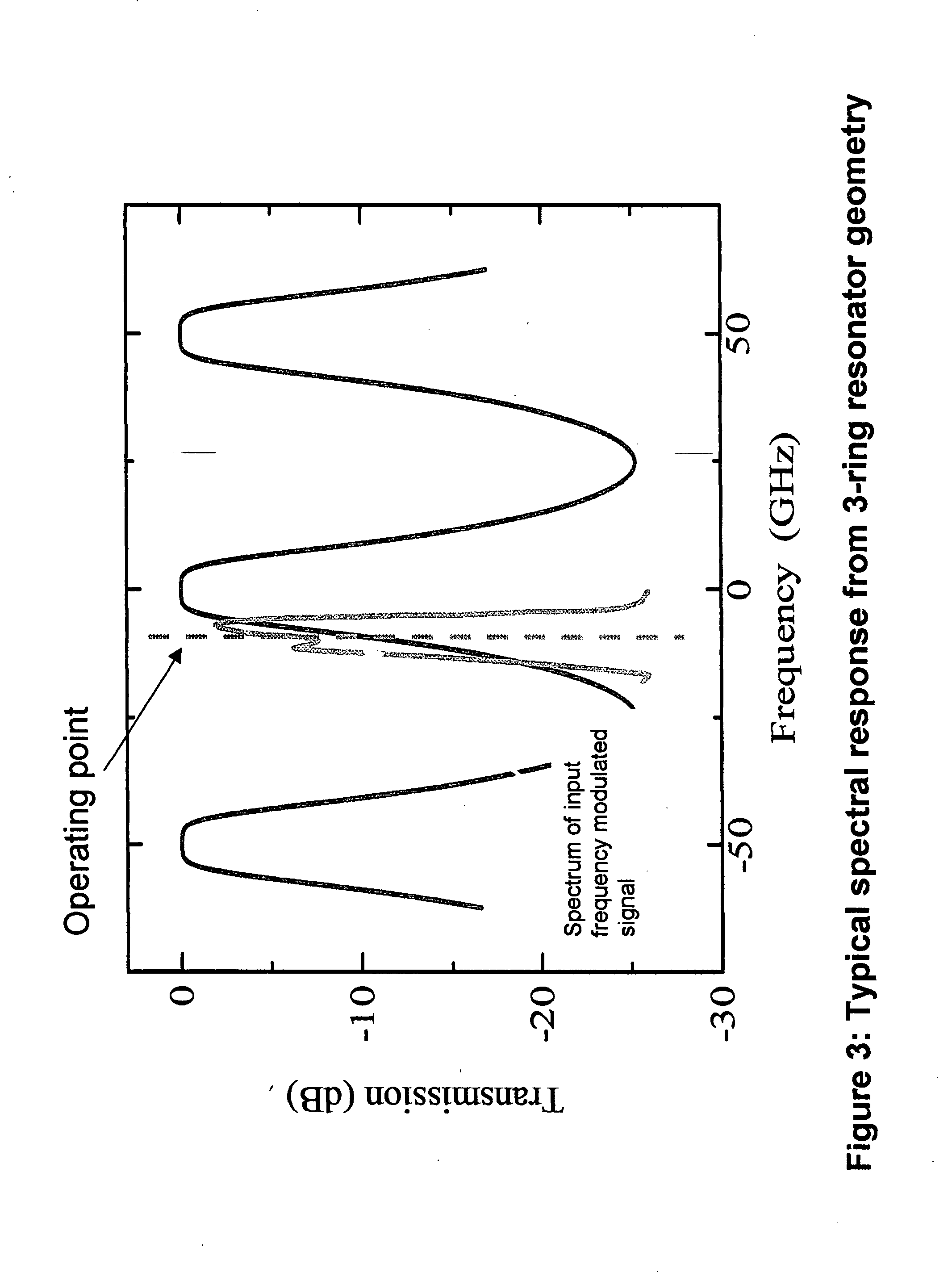 an optical signal source adapted to produce a frequency modulated signal; and a multi-ring resonator optical spectrum reshaper (OSR) adapted to convert the frequency modulated signal into a substantially amplitude modulated signal. 2. A fiber optic system according to 3. A fiber optic system according to 4. A fiber optic system according to 5. A fiber optic system according to 6. A fiber optic system according to 7. A fiber optic system according to 8. A fiber optic system according to 9. A fiber optic system according to 10. A fiber optic system according to 11. A fiber optic system according to 12. A fiber optic system according to 13. A fiber optic system according to 14. A fiber optic system according to 15. A fiber optic system according to 16. A fiber optic system according to 17. A fiber optic system according to 18. A fiber optic system according to 19. A fiber optic system according to 20. A fiber optic system according to 21. A fiber optic system according to 22. A method for transmitting an optical signal through a fiber comprising: