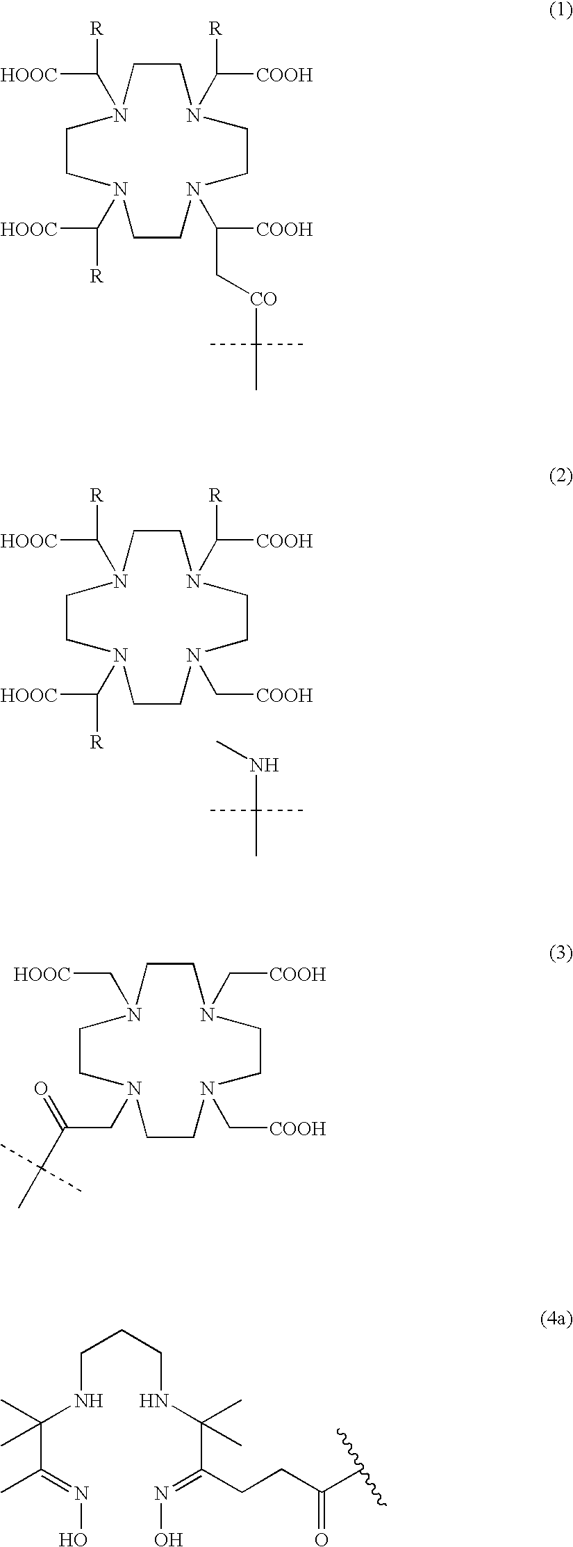 23. The compound of embodiment 20, wherein M is selected from the group consisting of: DTPA, DOTA, DO3A, HPDO3A, EDTA, TETA and CMDOTA. 24. The compound of embodiment 20, wherein M is selected from the group consisting of EHPG and derivatives thereof. 25. The compound of embodiment 20, wherein M is selected from the group consisting of 5-Cl-EHPG, 5-Br-EHPG, 5-Me-EHPG, 5-t-Bu-EHPG, and 5-sec-Bu-EHPG. 26. The compound of embodiment 20, wherein M is selected from the group consisting of benzodiethylenetriamine pentaacetic acid (benzo-DTPA) and derivatives thereof. 27. The compound of embodiment 20, wherein M is selected from the group consisting of dibenzo-DTPA, phenyl-DTPA, diphenyl-DTPA, benzyl-DTPA, and dibenzyl DTPA. 28. The compound of embodiment 20, wherein M is selected from the group consisting of HBED and derivatives thereof. 29. The compound of embodiment 20, wherein M is a macrocyclic compound which contains at least 3 carbon atoms and at least two heteroatoms (O and/or N), which macrocyclic compounds can consist of one ring, or two or three rings joined together at the hetero ring elements. 30. The compound of embodiment 20, wherein M is selected from the group consisting of benzo-DOTA, dibenzo-DOTA, and benzo-NOTA, benzo-TETA, benzo-DOTMA, and benzo-TETMA. 31. The compound of embodiment 20, wherein M is selected from the group consisting of derivatives of 1,3-propylenediaminetetraacetic acid (PDTA) and triethylenetetraaminehexaacetic acid (TTHA); derivatives of 1,5,10-N,N′,N″-tris(2,3-dihydroxybenzoyl)-tricatecholate (LICAM) and 1,3,5-N,N′,N″-tris(2,3-dihydroxybenzoyl)aminomethylbenzene (MECAM). 32. A compound of embodiment 20 selected from the group consisting of: