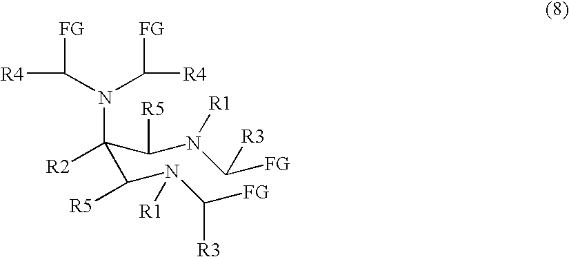 In the above Formulas 1 and 2, R is alkyl, preferably methyl. In the above Formulas 5a and 5b, X is either CH2 or O; Y is C1-C10 branched or unbranched alkyl; aryl, aryloxy, arylamino, arylaminoacyl; arylalkyl—where the alkyl group or groups attached to the aryl group are C1-C10 branched or unbranched alkyl groups, C1-C10 branched or unbranched hydroxy or polyhydroxyalkyl groups or polyalkoxyalkyl or polyhydroxy-polyalkoxyalkyl groups; J is optional, but if present is C(═O)—, OC(═O)—, SO2—, NC(═O)—, NC(═S)—, N(Y), NC(═NCH3)—, NC(═NH)—, N═N—, homopolyamides or heteropolyamines derived from synthetic or naturally occurring amino acids; all where n is 1-100. Other variants of these structures are described, for example, in U.S. Pat. No. 6,093,382. In Formula 6, the group S—NHCOCH3 may be replaced with SH or S-Z wherein Z is any of the known sulfur protecting groups such as those described above. Formula 7 illustrates one embodiment of t-butyl compounds useful as a metal chelator. The disclosures of each of the foregoing patents, applications and references are incorporated by reference in their entirety. The metal chelators of the Aazta family generally have the following general formula: (8):