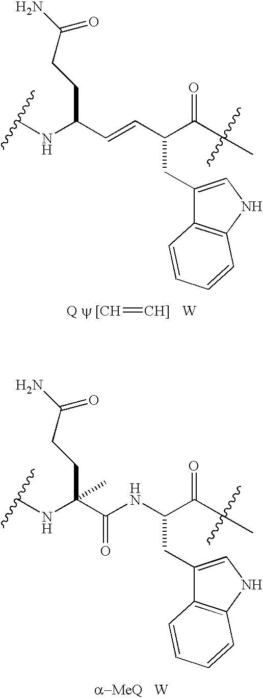52. The compound of embodiment 51, wherein G is an agonist or a peptide which confers agonist activity. 53. The compound of embodiment 51, wherein the non-alpha amino acid with a cyclic group is selected from the group consisting of: