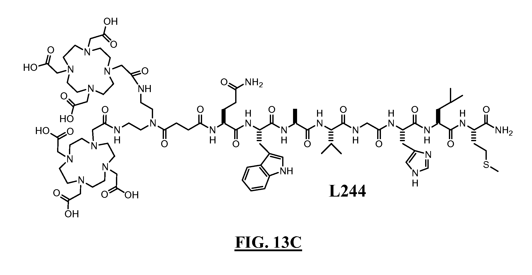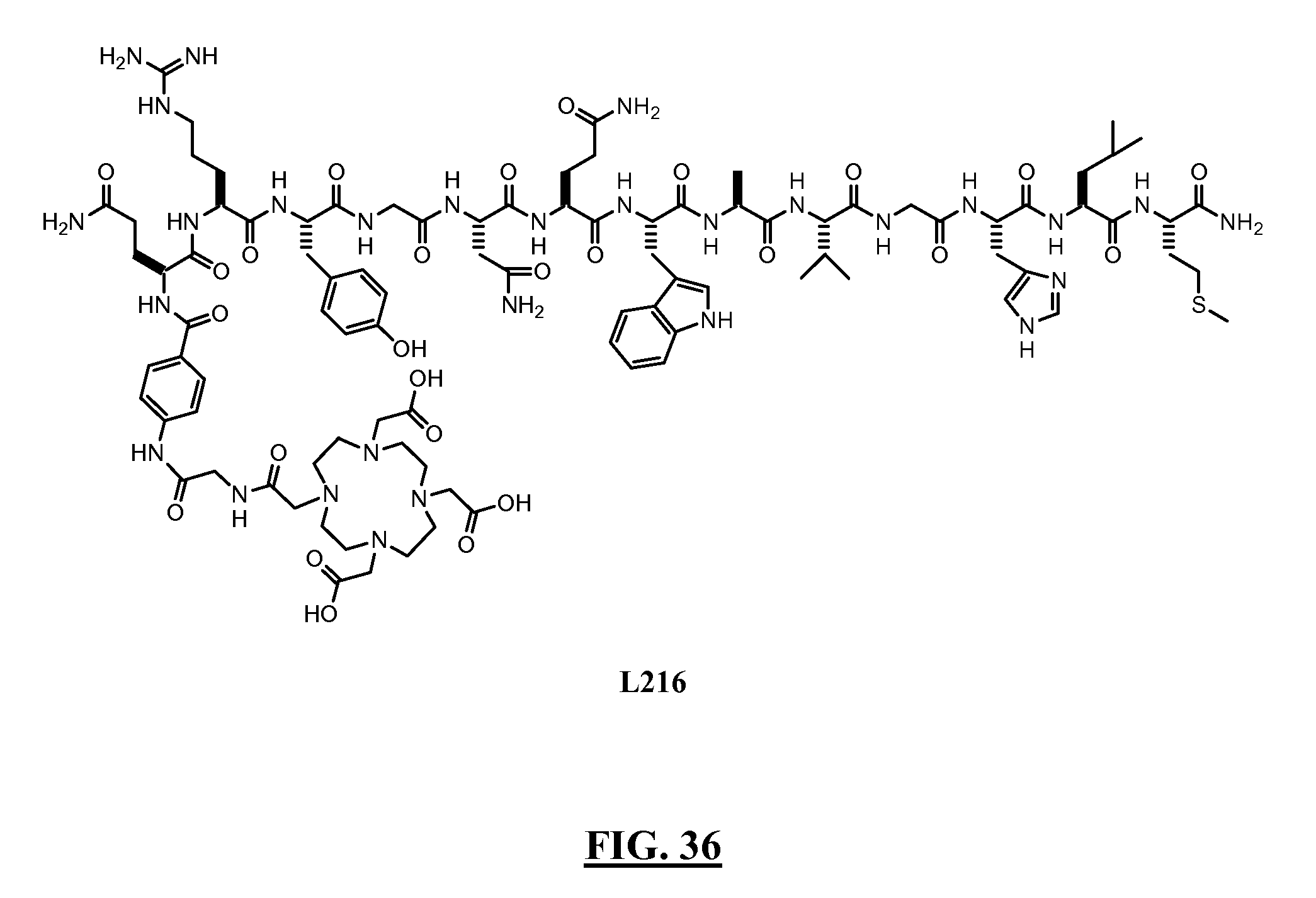 Number of selected compounds for the assay and their linkers NUMBER OF LINKER TYPE COMPOUNDS Neutral, Basic or combination of neutral, basic & acidic 8 Linear aliphatic (ω-aminoalkanoic & ω- 4 aminoalkoxynoic acid Bile acids (cholic acids) 3 Substituted alanine (cycloalkyl, aromatic and 5 heteroaromatic) Aromatic (aminobenzoic acid and aminoalkyl benzoic 12 acid, biphenyl) Cyclic non-aromatic 5 Heterocyclic (aromatic and non-aromatic) 5 Miscellaneous (DOTA-NMB, DOTA-G-Abz4-NMB, 6 DOTA-Abz4-G-NMB, BBN7-14, BBN8-14, DOTA-BBN7-14) The IC50 values obtained from competition experiments using 125I-NMB and 125I-BBN IC50 (nM) 125I-BBN/ 125I-NMB/ GRP-R & L # COMPOUND PC3 C6 GRP-R NMB-R na N,N-dimethylglycine-Ser- 10 10.4 — yes Cys(Acm)-Gly-SS- QWAVGHLM-NH2* na N,N-dimethylglycine-Ser- 25 7.9 — yes Cys(Acm)-Gly-G- QWAVGHLM-NH2* na N,N-dimethylglycine-Ser- 48 20.2 — yes Cys(Acm)-Gly-GG- QWAVGHLM-NH2* na N,N-dimethylglycine-Ser- 13 6.4 — yes Cys(Acm)-Gly-KK- QWAVGHLM-NH2* na N,N-dimethylglycine-Ser- 2 2.2 — yes Cys(Acm)-Gly-SK- QWAVGHLM-NH2* na N,N-dimethylglycine-Ser- 1.9 2.0 — yes Cys(Acm)-Gly-SR- QWAVGHLM-NH2* na N,N-dimethylglycine-Ser- 7.5 24.1 yes — Cys(Acm)-Gly-KS- QWAVGHLM-NH2* na N,N-dimethylglycine-Ser- 32 60.0 yes — Cys(Acm)-Gly-KE- QWAVGHLM-NH2* na DO3A-monoamide-Aoc- 3.4 3.1 — yes QWAVGHLM-NH2* na DO3A-monoamide-Apa3- 36 18.9 — yes QWAVGHLM-NH2* na DO3A-monoamide-Abu4- 19.8 5.2 — yes QWAVGHLM-NH2* L3 N,N-dimethylglycine-Ser- 70 33 — yes Cys(Acm)-Gly-DJ- QWAVGHLM-NH2* L64 DO3A-monoamide-G-Adca3- 8.5 3.3 — yes QWAVGHLM-NH2* L63 DO3A-monoamide-G-Ah12ca- 23 3.8 — yes QWAVGHLM-NH2* L67 DO3A-monoamide-G-Akca- 5.5 2.3 — yes QWAVGHLM-NH2* na DO3A-monoamide-Cha-Cha- 22 77 yes — QWAVGHLM-NH2* na DO3A-monoamide-Nal1-Bip- 30 210.9 yes — QWAVGHLM-NH2* na DO3A-monoamide-Cha-Nal1- 8 66.5 yes — QWAVGHLM-NH2* na DO3A-monoamide-Nal1-Bpa4- 17 89.9 yes — QWAVGHLM-NH2* L301 DO3A-monoamide-Amb4- 10 6.8 yes Nal1-QWAVGHLM-NH2* L147 DO3A-monoamide-G- 4 32 yes — Mo3abz4-QWAVGHLM-NH2* L241 DO3A-monoamide-G- 4 0.8 — yes Cl3 abz4QWAVGHLM-NH2* L242 DO3A-monoamide-G-M3abz4- 5 2.2 — yes QWAVGHLM-NH2* L243 DO3A-monoamide-G- 14 9.9 — yes Ho3abz4-QWAVGHLM-NH2* L202 DO3A-monoamide-G-Hybz4- 13 2.7 — yes QWAVGHLM-NH2* L204 DO3A-monoamide-Abz4-G- 50 1.2 — yes QWAVGHLM-NH2* L233 DO3A-monoamide-G-Abz3- 4.8 1.6 — yes QWAVGHLM-NH2* L235 DO3A-monoamide-G-Nmabz4- 7 1.5 — yes QWAVGHLM-NH2* L147 DO3A-monoamide-Mo3amb4- 3.5 1.2 — yes QWAVGHLM-NH2* L71 DO3A-monoamide-Amb4- 7.2 0.2 — yes QWAVGHLM-NH2* L73 DO3A-monoamide-Aeb4- 5 1.8 — yes QWAVGHLM-NH2* L208 DO3A-monoamide-Dae-Tpa- 8 0.9 — yes QWAVGHLM-NH2* L206 DO3A-monoamide-G- 5 1.3 — yes A4m2biphc4- QWAVGHLM-NH2* L207 DO3A-monoamide-G- 3 15.1 — yes A3biphc3- QWAVGHLM-NH2* L72 DO3A-monoamide-Amc4- 8.2 2.6 — yes QWAVGHLM-NH2* L107 DO3A-monoamide-Amc4- 5 0.3 — yes Amc4- QWAVGHLM-NH2* L89 DO3A-monoamide-Aepa4- 23 114 yes — QWAVGHLM-NH2* L28 N,N-dimethylglycine-Ser- 25 13 — yes Cys(Acm)-Gly-Aepa4-S- QWAVGHLM-NH2* L74 DO3A-monoamide-G-Inp- 6.5 3.4 — Yes QWAVGHLM-NH2* L36 N,N-dimethylglycine-Ser- 7 12.1 — yes Cys(Acm)-Gly-Pial-J- QWAVGHLM-NH2* L82 DO3A-monoamide-Ckbp- 8 1.7 — Yes QWAVGHLM-NH2* na DO3A-monoamide-Aoc- 11 14 — Yes QWAVGHL-Nle-NH2* L70 DO3A-monoamide-G-Abz4- 4.5 1.5 — Yes QWAVGHLM-NH2* na DO3A-monoamide- 366 >250 No selective QWAVGHLM-NH2* preference na QWAVGHLM-NH2* 369 754 No selective preference na WAVGHLM-NH2 >800 >800 No selective (SEQ ID NO: 25) preference L204 DO3A-monoamide-Abz4-G- >50 1.2 preference to NMB-R QWAVGHLM-NH2* na GNLWATGHFM-NH2 >500 0.7 preference to NMB-R (SEQ ID NO: 24) L227 DO3A-monoamide-G-Abz4- 28 0.8 — Yes LWATGHFM-NH2 wherein LWATGHFM-NH2 is SEQ ID NO: 16