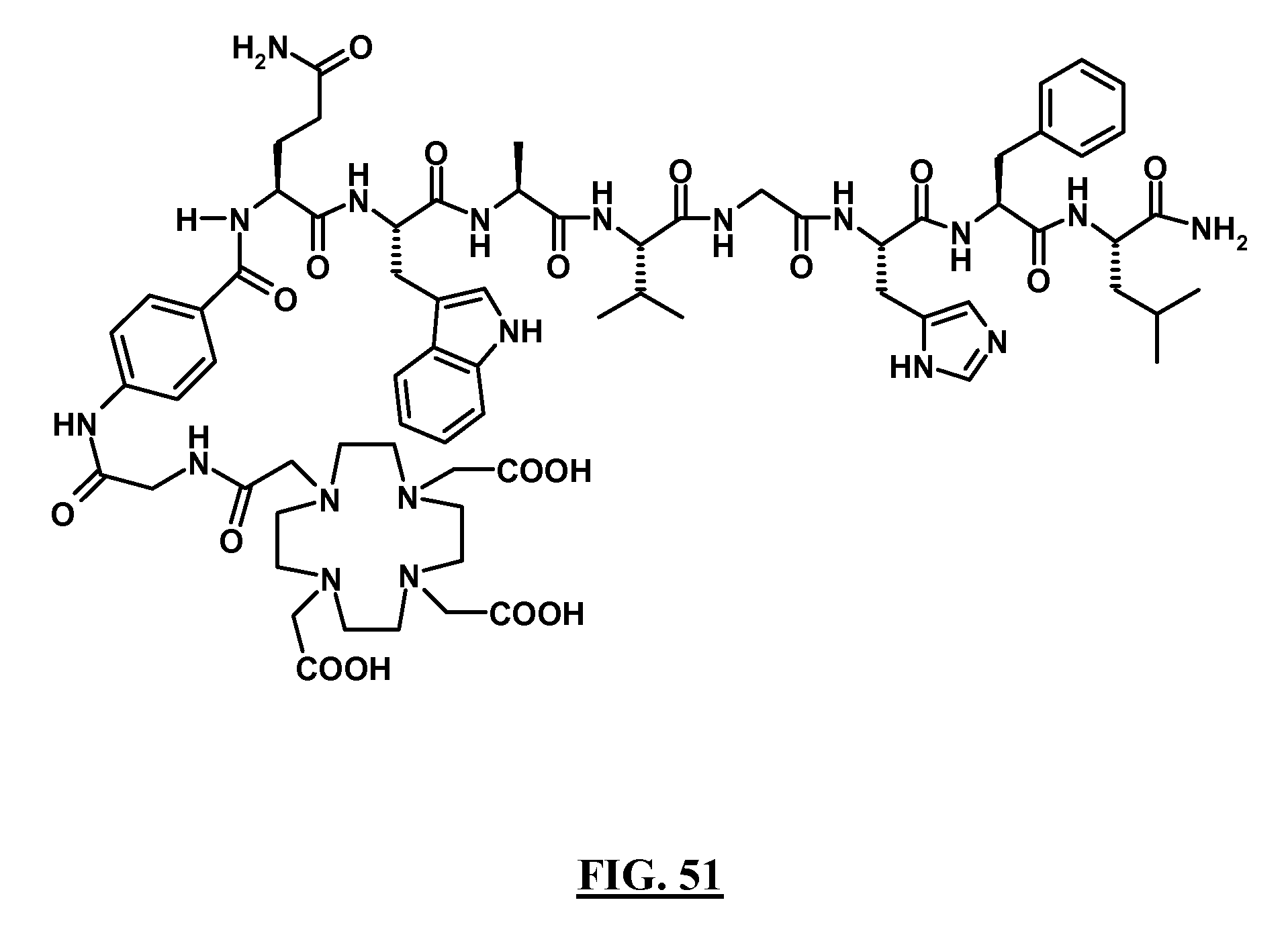 94. A method of improving the in vivo activity of a compound of any one of embodiments 1, 20, 51, 78, 80, or 82, comprising the step of modifying the GRP receptor targeting peptide so as to reduce proteolytic cleavage of said peptide. 95. The method of embodiment 94, wherein the modified GRP-R targeting peptide is an agonist. 96. A method of reducing proteolytic cleavage of a gastrin releasing peptide (GRP) analogue of any one of embodiments 1, 20, 51, 78, 80, or 82, said method comprising the step of modifying the peptide bond in the GRP-R targeting moiety. 97. The method of embodiment 96, wherein the modified GRP-R targeting peptide is an agonist. 98. A method of reducing proteolytic cleavage of a gastrin releasing peptide (GRP) analogue having a gastrin releasing peptide receptor (GRP-R) targeting moiety that is an agonist, said method comprising the step of modifying the peptide bond in the GRP-R targeting moiety. 99. The method of any one of embodiments 94, 96 or 98, wherein the GRP-R targeting moiety is selected from the group consisting of: