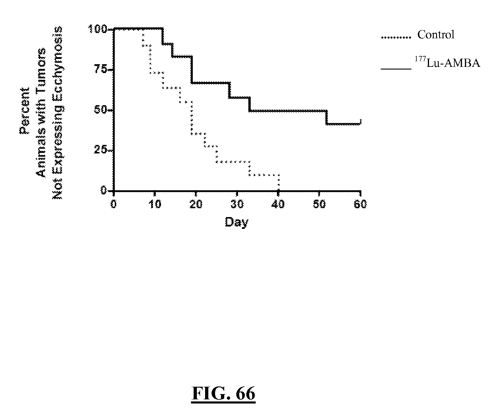 Referring now to As shown in Time to Progression is an alternative means to assess the anti-cancer activity of new agents. It is defined as the time point at which the tumor shows a 20% increase in diameter. The Mean Time to Progression is the study day when half of the animals in a group reach that point. In a preferred embodiment, it has now been found that the mean time to tumor progression in LNCap tumours is increased by about 100% with177Lu-L70 treatment. The Mean Time to Progression data is shown in Table 23.