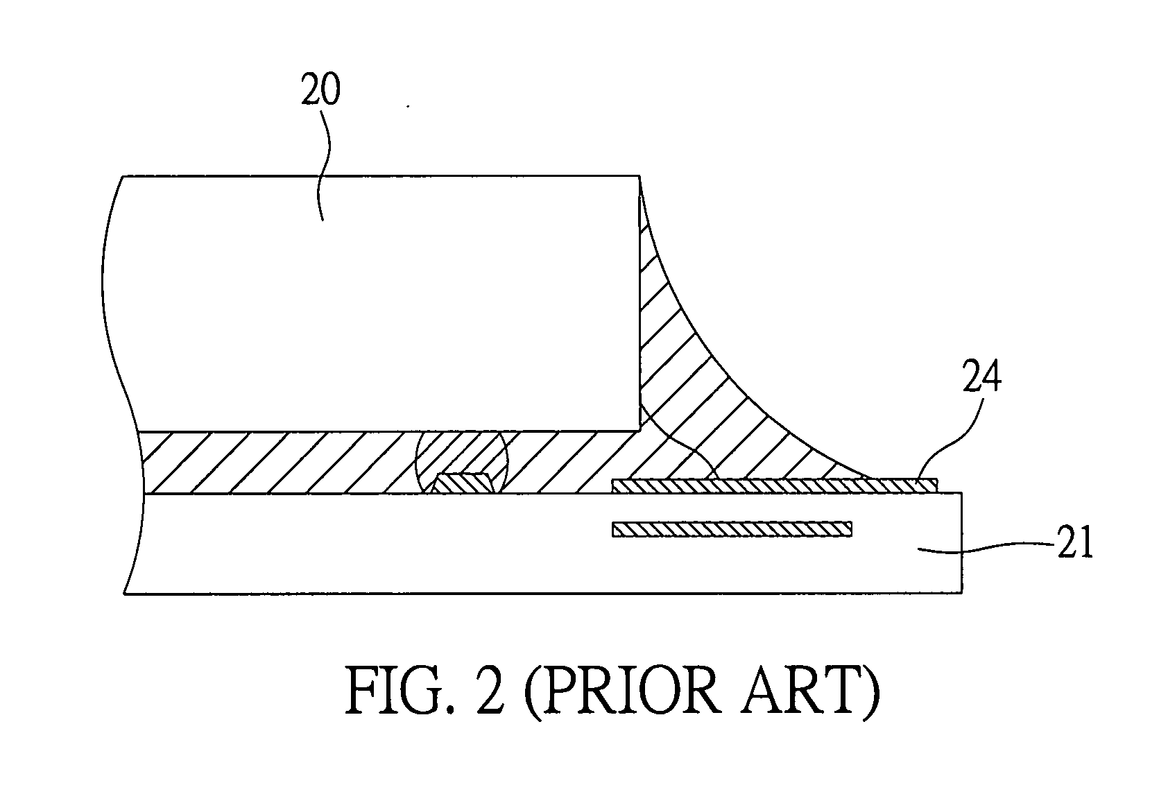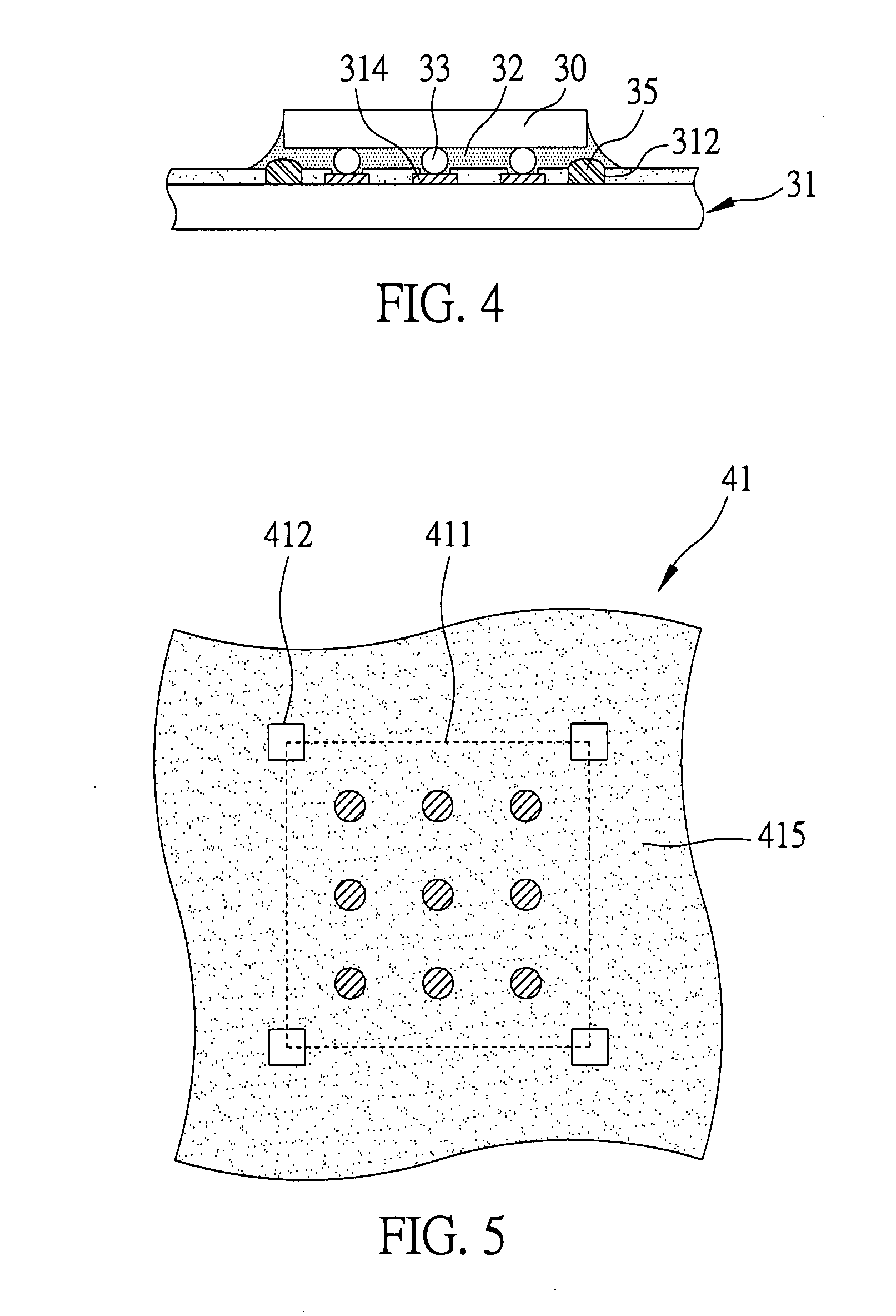 a body; a chip-mounting area formed on the body for attaching to a flip chip; and a groove formed around the chip-mounting area for filling with a filler of low Young's modulus. 14. The chip carrier of 15. The chip carrier of 16. The chip carrier of 17. The chip carrier of 18. The chip carrier of 19. The chip carrier of 20. The chip carrier of 21. The chip carrier of