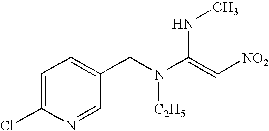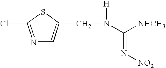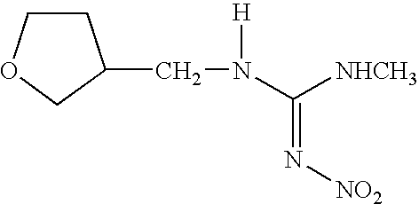 Beta-Cyfluthrin 94.5 46.5 85.5 85.5 85.5 Deltamethrin 39.5 94.5 Imidacloprid 147 187 187 102 198 198 198 Thiacloprid 2,6-Di-tert-butyl-4- 2 2 2 2 2 2 2 methylphenol Agnique ® KE 3552 Arlatone ® T 100 100 100 100 100 100 100 Atlox ® 3467 130 130 130 113 Atlox ® 4894 50 50 50 Atlox ® 4913 (anhydrous) Atlox ® 4914 Borresperse ® NA 20 Cyclohexanone Genagen ® 4166 150 Kraftsperse ® DW 5 Maize oil Morwet ® D 425 20 5 5 5 N-Methylpyrrolidone 150 Polydimethylsiloxane 0.5 0.5 0.5 0.5 0.5 0.5 0.5 Propylene glycol Solvesso ® 100 75 150 Sunflower oil 379 264 264 359 257 257 257 Trylox ® 6746 Compound (I-c-1) 200 200 200 200 150 150 150 Compound (I-d-1) Compound (I-f-1) Anhydrous citric acid 2 2 2 2 2 2 2 Agnique ® KE 3552 alkanol alkoxylate Cognis Arlatone ® T PEG-40 sorbitan peroleate, Uniqema nonionic Atlox ® 3467 blend containing alkylaryl Uniqema sulphonate, ethylhexanol, ethoxylated alcohol Atlox ® 4894 polyalkoxylated alcohol Uniqema Atlox ® 4913 polymeric nonionic surfactant Uniqema (anhydrous) Atlox ® 4914 polymeric nonionic surfactant Uniqema Borresperse ® NA lignosulphonate Borregaard LignoTech Genagen ® 4166 caprylic/capric fatty acid Clariant dimethylamide Kraftsperse ® DW 5 lignosulphonate, sodium salt Westvaco Morwet ® D 425 naphthalene sulphonate Witco Solvesso ® 100 aromatic organic solvent Exxon Mobile Trylox ® 6746 PEG-40 sorbitol hexaoleate Cognis Crystallization Behaviour