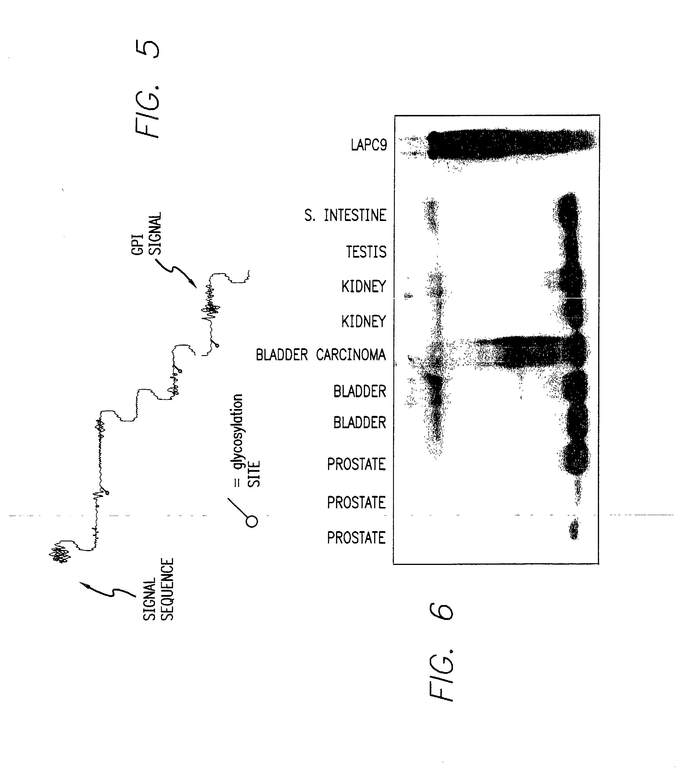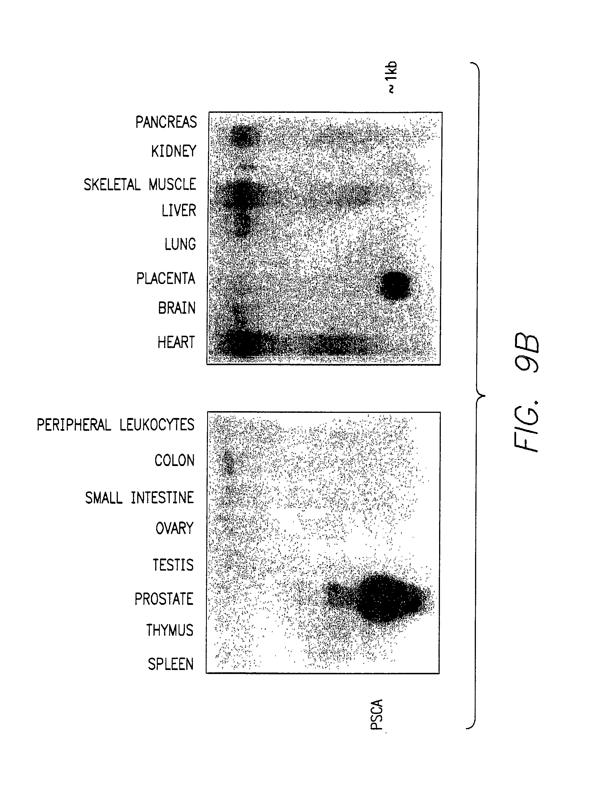 PSCA Expression in Prostate Cancer Bone Metastases This experiment shows that PSCA expression is amplified in bone metastases of prostate cancer. Materials and Methods Horse Serum (NHS) (GIBCO #26050-070) was diluted ( 1/20 dilution) in 1% Casein, PBST. The antibodies of the invention that recognize PSCA were diluted in 1/100 NHS, PBST. The detection system included HRP-rabbit anti-mouse Ig (DAKO P260), HRP-swine anti-rabbit Ig (DAKO P217), HRP-rabbit anti-swine Ig (DAKO P164). Each were diluted 1/100 in 1/100 NHS, PBST. 3,3′-diaminobenzidine tetrahyrochloride (DAB) (Fluka) stock was made by dissolving 5 gm in 135 ml of 0.05 M Tris, pH 7.4. DAB was aliquoted into 1 ml/vial and frozen at −20° C. A working solution of DAB was made by adding 1 ml of DAB to 40 ml of DAB buffer and 40 microliters of 50% H2O2. DAB buffer was prepared by combining 1.36 gm Imidazole (Sigma #I-0125) with 100 ml D2-H2O, then adjusting the pH to 7.5 with 5 N HCl. After the pH adjustment 20 ml of 0.5 M Tris pH 7.4 and 80 ml of D2- H2O were added. A section of a tissue/tumor known and previously demonstrated to be positive for the antibody was run with the patient slide. This slide served as a “positive control” for that antibody. A section of the patient's test specimen was incubated with a negative control antibody in place of the primary antibody. This slide served as a “negative control” for the test. The staining procedure was as follows. Bone samples were applied to slides. The slides were then baked overnight at 60° C. Slides were deparaffinize in 4 changes of xylene for 5 minutes each and passed through a graded series of ethyl alcohol (100%×4, 95%×2) to tapwater then transferred to NBF, and fixed for 30 minutes. The fixed slides were placed in running tapwater for 15 minutes, transferred to 3% H2O2—MeOH, incubated for 10 minutes, and washed in running tapwater for 5 minutes, then rinse in deionized water. Slides were then subjected to 0.01 M citrate buffer pH 6.0, heated at 45° C. for 25 minutes, cooled for 15 min and then washed in PBS. The slides were then rinsed in PBS and placed onto programmed DAKO Autostainer, using the following four step program. The four step program is as follows. The slide is rinsed in PBS and blocked with 1/20 NHS in 1% Casein in PBST for 10 minutes. Primary antibody is then applied and incubated for 30 minutes followed by a buffer rinse. HRP-Rabbit anti-Mouse Ig is then applied and incubated for 15 minutes followed by another buffer rinse. HRP-Swine anti-Rabbit Ig is applied and incubated for 15 minutes followed by a buffer rinse. HRP-Rabbit anti-Swine Ig is applied and incubated for 15 minutes followed by a buffer rinse. DAB is then applied to the slide and incubated for 5 minutes followed by a buffer rinse. A second DAB is applied and incubated for 5 minutes followed by a buffer rinse. The slides are removed from the Autostainer and placed into slide holders, rinsed in tapwater and counter stained with Harris hematoxylin (15 seconds). The slide is then washed in tapwater, dipped in acid-alcohol, washed in tapwater, dipped in sodium bicarbonate solution, and washed in tapwater. The slides are then dehydrated in graded ethyl alcohols (95%×2, 100%×3) and Propar×3 and coverslipped with Permount. PSCA Protein is Expressed Strongly in Prostate Cancers Metastatic to Bone Prostate cancer is unique among human tumors in its propensity to metastasize preferentially to bone and to induce osteoblastic responses. Nine sections of prostate cancer bone metastases were examined immunohistochemically ( These results suggest that PSCA may be greatly overexpressed in prostate cancer metastases to bone. This is particularly interesting since Sca-2, a close homologue of PSCA, was recently reported to suppress osteoclast activity in bone marrow. If PSCA had similar activity, it might provide one explanation for the tendency of prostate cancer metastases to produce an osteoblastic response, since inhibition of osteoclast activity would tilt the balance of activity in bone to bone formation. Another possibility is that PSCA might be involved in adhesion to bone, since other Ly-6/Thy-1 family members are involved in similar processes. There was heterogeneous expression of PSCA in a number of primary prostate cancers. These results further support the use of PSCA as a novel target for advanced disease. One of the most intriguing results of the present study was the consistent, intense staining seen in the nine prostate cancer bone metastases. LAPC-9, a xenograft established from a bony metastasis, also stained intensely for PSCA. In three patients, matched primary biopsy specimens showed low levels of PSCA expression compared to the bony metastages. Areas of strong PSCA expression in the primary tumors of the three patients examined may have been missed since only biopsies were available for analysis. Heterogeneous expression of PSCA was detected in at least one matched primary tumor, as well as in number of primary tumors for whom matched metastatic lesions were not available. Also, in two cases the primary tumor was sampled at least a decade prior to the bone metastasis, raising the possibility that clones expressing high levels of PSCA within the primary could have developed subsequent to the initial biopsy. These results clearly demonstrate PSCA expression in bone metastases, further supporting it as a novel target for advanced disease. PSCA Overexpression in Bladder and Pancreatic Carcinomas This experiment shows that PSCA expression is higher in bladder carcinomas than normal bladder. Tissues from prostate, bladder, kidney, testes, and small intestine (including prostate cancer and bladder and kidney carcinomas) were obtained from patients. These tissues were then examined for binding to PSCA using northern and western blot analyses as follows. For northern blot analyses, tissue samples were excised and a less than 0.5×0.5 cm tissue sample was quick frozen in liquid nitroge