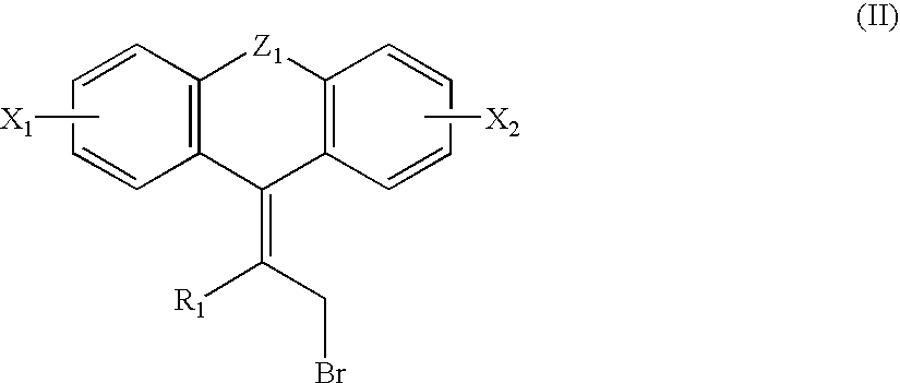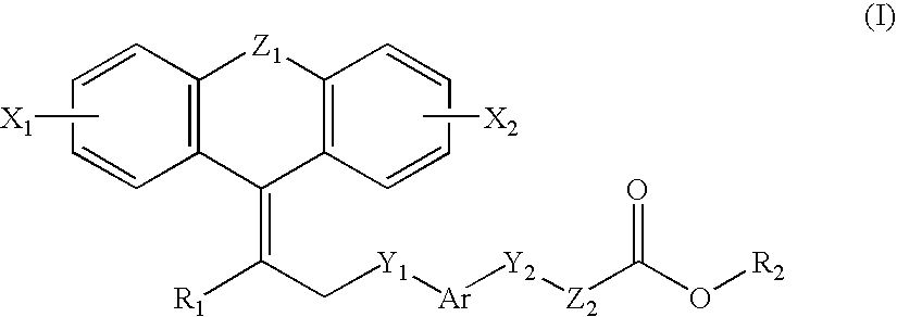 Reacting a compound of formula II (J. Med. Chem. 2002, 45, 789 and references therein) wherein R1 and Z1 are defined as above, and at least one of X1 and X2 is bromine and the other is hydrogen, with boronic acids or tributylstanane derivatives of X1 and X2, wherein X1 and X2 are aryl and heteroaryl as defined above, to give the desired substituted tricyclic intermediate. Reacting a compound of formula II, wherein X1, X2, R1 and Z1 are defined as above, with a compound of formula III wherein Y1, Ar, Y2, Z2 and R2 are defined as above, except that R is not hydrogen, under alkylating conditions, using K2CO3/acetone and the like, to obtain a compound of formula I, wherein X1, X2, Y1, Y2, Ar Z1, Z2, R1 and R2 are defined as above, except that R2 is not hydrogen. By chemical or enzymatic saponification of a compound of formula I, wherein X1, X2, Y1, Y2, Ar, Z1, Z2, R1 and R2 are defined as above, except that R2 is not hydrogen to give a compound of formula I, wherein X1, X2, Y1, Y2, Ar, Z1, Z2, R1 and R2 are defined as above, except that R2 is hydrogen. A mixture of 3-bromotoluene (42.8 g, 0.25 mol), N-bromosuccinimide (48.9 g, 0.275 mol) and benzoyl peroxide (0.75 g) in tetrachloromethane (500 mL) was stirred and heated to reflux for 3 h. The mixture was left to stand overnight at laboratory temperature, the solid was filtered off, washed with tetrachloromethane and the filtrates were evaporated. The residue was distilled in vacuo to yield 52.7 g (62.5%) of 1-bromo-3-bromomethylbenzene, b.p. 135-140° C./1.6 kPa. The above bromide (52.7 g, 0.21 mol) was warmed up to 120° C. and then triethyl phosphite (35.0 g, 36.7 mL, 0.21 mol) was added dropwise under stirring. The temperature was increased to 150° C., the mixture was stirred for 6 h and left to stand overnight at room temperature. The residue was distilled to give 61.55 g (95.5%) of (3-bromobenzyl)phosphonic acid diethyl ester, b.p. 124-126° C./13 Pa. Sodium (6.9 g (0.3 mol) was melted in argon atmosphere on oil bath (130° C.). Methanol (10.1 g, 12.75 mL, 0.315 mol) was added dropwise under slow stirring with mechanical stirrer at 140-150° C. during 30 min. Pulverous sodium methoxide was heated at 140° C. for next 30 min, cooled down to 20° C. and dimethylformamide (30 mL) was added. The mixture was cooled to 5° C. and then a solution of above phosphonic ester (36.9 g, 0.12 mol) and phtalaldehydic acid (18.0 g, 0.12 mol) in dimethylformamide (30 mL) was added dropwise under cooling during 10 min (temperature was maintained between 10-20° C.). The reaction mixture was stirred for next 30 min at room temperature, cooled to 5° C., the mixture of conc. hydrochloric acid (20 mL) and water (150 mL) were added dropwise and the product was extracted with chloroform (100 mL, 2×30 mL). The combined organic solution were washed with water (2×80 mL) and evaporated in vacuo. The residue was stirred with water (350 mL) for 2 h, solid was filtered, washed with water (500 mL) and dried. This afforded 32.6 g (90%) of crude 2-[2-(3-bromo-phenyl)-vinyl]-benzoic acid, m.p. 145-150° C. RF 0.75 (SiO2, ethyl acetate/ethanol/acetic acid 60:40:1). The above acid (15.0 g, 0.05 mol) was dissolved 15% ammonium hydroxide (100 mL) at 50° C. A charcoal (2 g) was added, the mixture was stirred for 30 min, filtered and clear solution was evaporated in vacuo. The residue was dissolved in water (100 mL), rhodium on activated charcoal (5%, 1.5 g) was added and the mixture was hydrogenated at 47° C. and 20-30 at for 15 min. Next portion of catalyst was added (1.3 g) and hydrogenation was continued for next 15 min (the same conditions). The catalyst was filtered off, the filtrate was acidified to pH 2 with conc. hydrochloric acid and product was extracted with chloroform (3×50 mL). Combined extracts were washed with water, dried (MgSO4) and evaporated in vacuo and the residue was submitted to chromatography on the column of silica gel (Fluka 60,100 g). Elution with the mixture of hexane/ethyl acetate gave 10.8 g (71%) of 2-[2-(3-bromophenyl)ethyl]benzoic acid, m.p. 88-90° C. RF 0.65 (SiO2, hexane/ethyl acetate 6:4). 1H NMR spectrum (250 MHz, CDCl3): 8.15 (m, 1H); 7.48-7.11 m, 7H); 3.32 (t, J=7.7 Hz, 2H); 3.32 (t, J=7.7 Hz, 2H). Elution with the mixture of hexane/ethyl acetate 1:1 afforded 2.85 g of 2-[2-(3-phenyl)ethyl]-benzoic acid, m.p. 138-139° C. as a by-product. RF 0.50 (SiO2, hexane/ethyl acetate 6:4). To a stirred mixture of the above acid (9.5 g, 0.031 mol) and dimethylformamide (0.5 g) in dichloromethane (180 mL) oxalyl chloride (2.7 mL, 0.0374 mol) was added dropwise during 30 min. The mixture was stirred for next 30 min at mom temperature and then evaporated in vacuo. The residue was dissolved in the mixture of dichloromethane (150 mL) and carbon disulphide (50 mL) and to this solution aluminum chloride (6.4 g, 0.048 mol) was added portionwise and the reaction mixture was stirred overnight. The mixture was poured in crushed ice, 15% hydrochloric acid (60 mL) was added and product was extracted with dichloromethane (150, 2×80 mL). The collected organic solutions were washed with water (80 mL), 10% solution of sodium carbonate (50 mL), dried (MgSO4) and evaporated. The residue (8.1 g) was purified by chromatography on a column of silica gel (Fluka 60, 100 g, hexane/benzene 8:2). This afforded 3.8 g (43%) of 2-bromo-10,11-dihydro-dibenzo[a,d]cyclohepten-5-one, m.p. 94-96° C. RF 0.55 (SiO2, hexane/benzene 1:1). 1H NMR spectrum (250 MHz, CDCl3): 8.00 (d, 1H); 7.91 (d, 1H); 7.88-7.21 (m, 5H); 3.08 (s, 4H). For C15H11BrO Calculated: C, 62.74%; H, 3.86%; Br, 27.83%. Found: C, 63.12%; H, 3.86%; Br, 27.33%. Magnesium turnings (0.234 g, 9.7 mmol) under tetrahydrofuran (3 mL) was activated with grain of iodine and with 1,2-dibromoethane (0.15 mL) and after the reaction was over, a solution of vinylbromide (1.04 g, 9.7 mmol) in tetrahydrofuran (18 mL) was added (dry ice condenser, nitrogen atmosphere). The reaction start immediately and the remaining part of