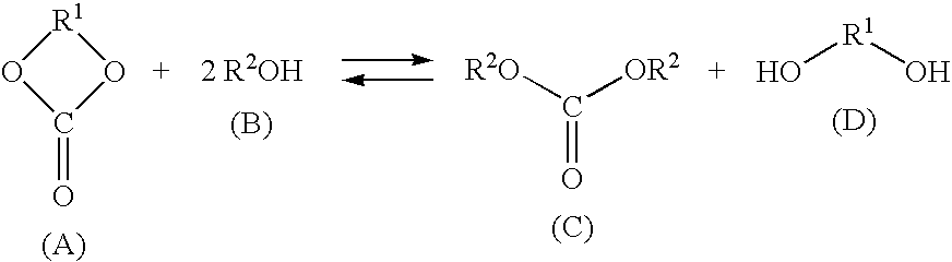 1. In an industrial process for the production of a diol in which a diol is produced by taking a cyclic carbonate and an aliphatic monohydric alcohol as starting materials, continuously feeding the starting materials into a continuous multi-stage distillation column A in which a catalyst is present, carrying out reactive distillation in said column A, continuously withdrawing a low boiling point reaction mixture AT containing a produced dialkyl carbonate and said aliphatic monohydric alcohol from an upper portion of the column A in a gaseous form, continuously withdrawing a high boiling point reaction mixture AB containing a produced diol from a lower portion of the column A in a liquid form, then continuously feeding said high boiling point reaction mixture AB into a continuous multi-stage distillation column C for separating off material having a lower boiling point than that of the diol contained in said high boiling point reaction mixture AB, continuously obtaining the material having a lower boiling point than the diol as a column top component CT and a side cut component CS, and continuously obtaining the diol substantially not containing the material having a lower boiling point than that of the diol as a column bottom component CB, wherein the improvement comprises: