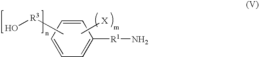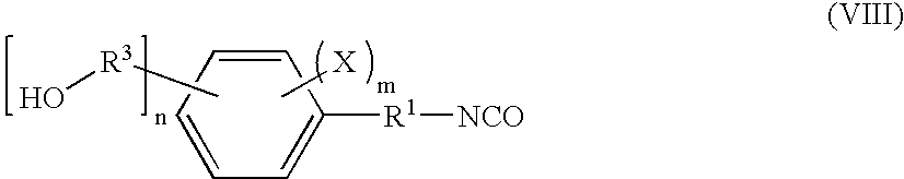 the hydroxyphenyl isocyanate compound being represented by Formula (VIII): wherein R1, R3, X, m and n are as defined in Formula (I); and