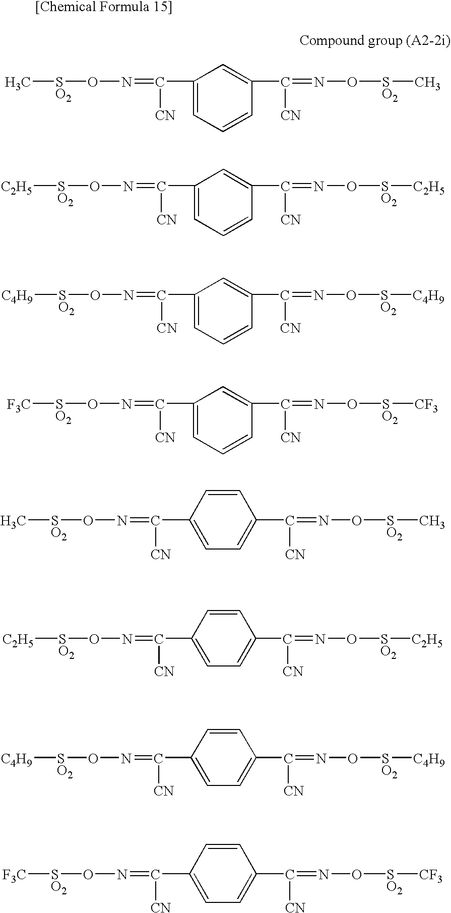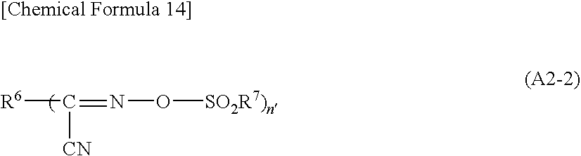 Coating films of respectively two kinds of film thickness (20 μm and 100 μm) were formed on 5-inch Si, or Au, Cu. Ni or Al sputtered wafers, and each coating film was exposed with ultraviolet radiation in sections, through a pattern mask used for measuring resolution, at exposure doses ranging from 100 to 10,000 mJ/cm2, using an aligner (trademark; PLA501F, manufactured by Canon Inc.). Following exposure, the product was heated (PEB) at 80° C. for 5 minutes, and was then developed in a developing solution (trademark: P-7G from the PMER series, manufactured by Tokyo Ohka Kogyo Co., Ltd.). The developed product was washed under running water, and blown with nitrogen to yield a pattern-wise cured product.
