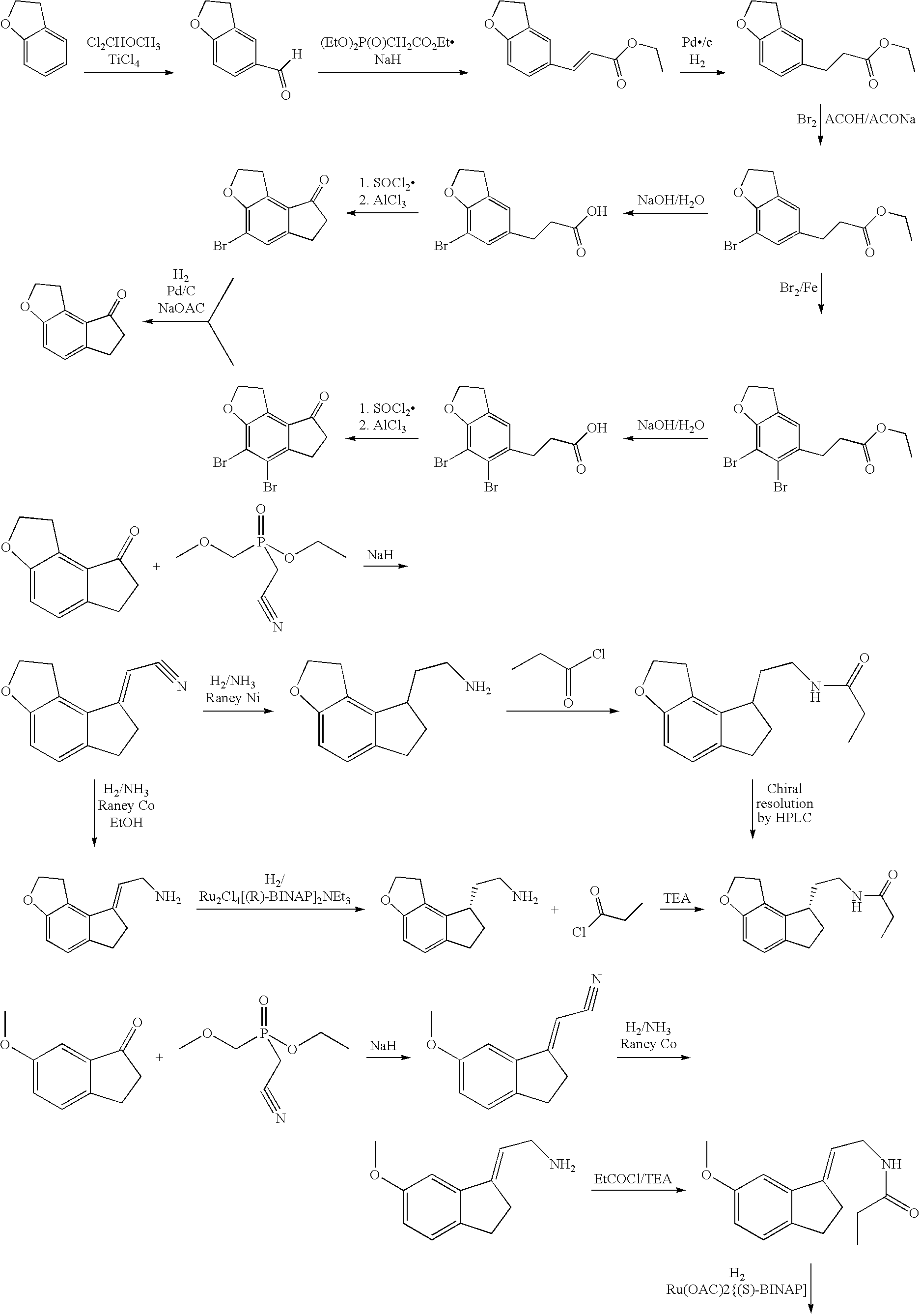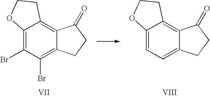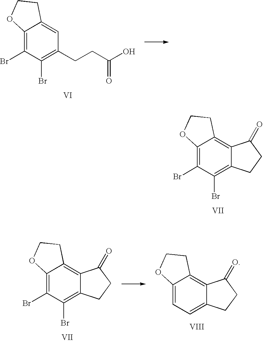 (f) acylation of the amino group of compound XIV to form ramelteon. 102. The method of (a) contacting the compound of formula V with a halogenation agent to form the compound of formula VI; and (b) cyclizing and reductively dehalogenating the compound of formula VI to produce the compound of formula VIII. 103. A method of preparing an intermediate in the synthesis of ramelteon comprising the following steps: