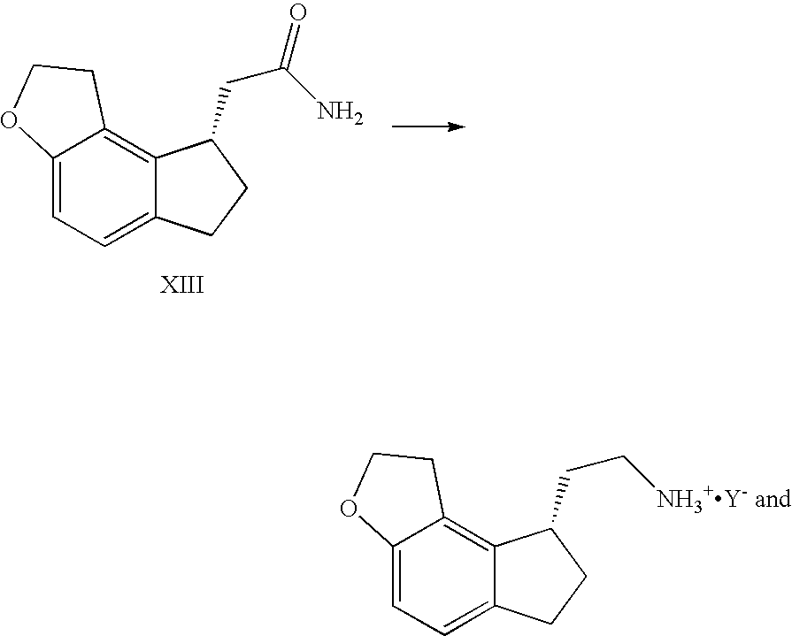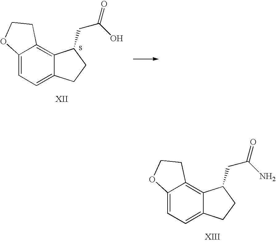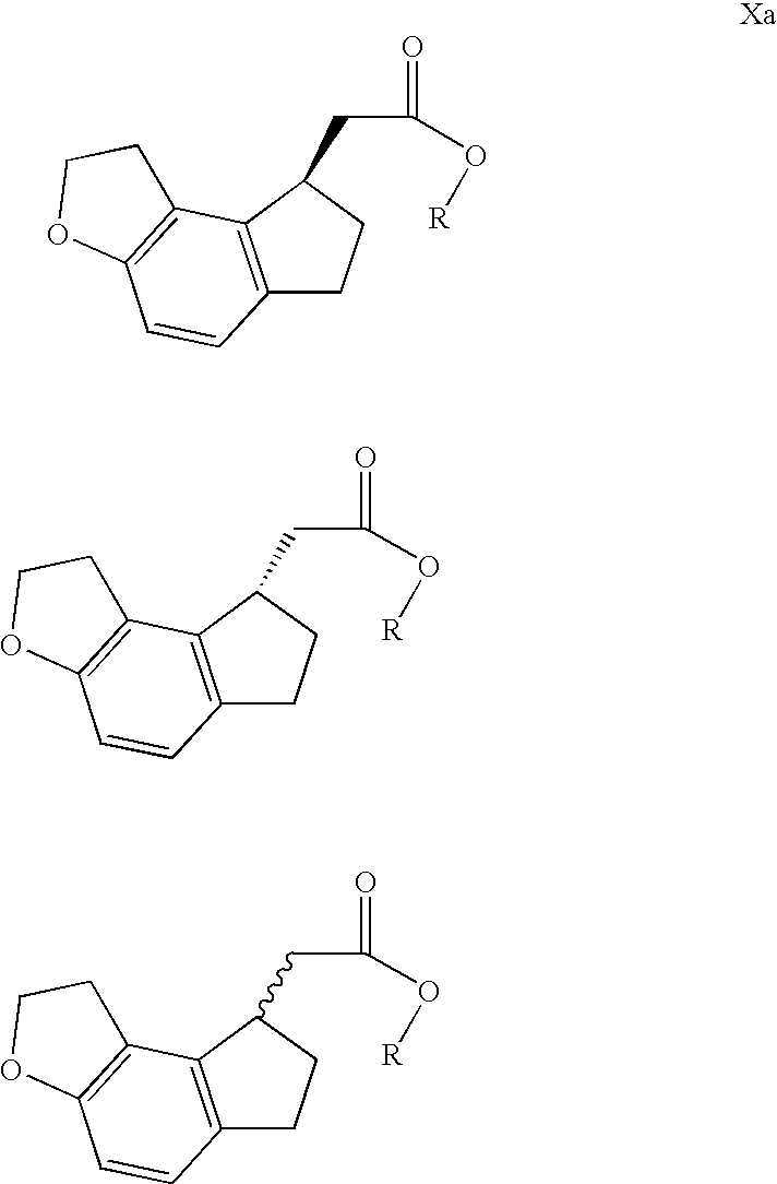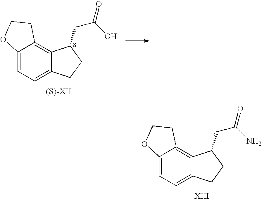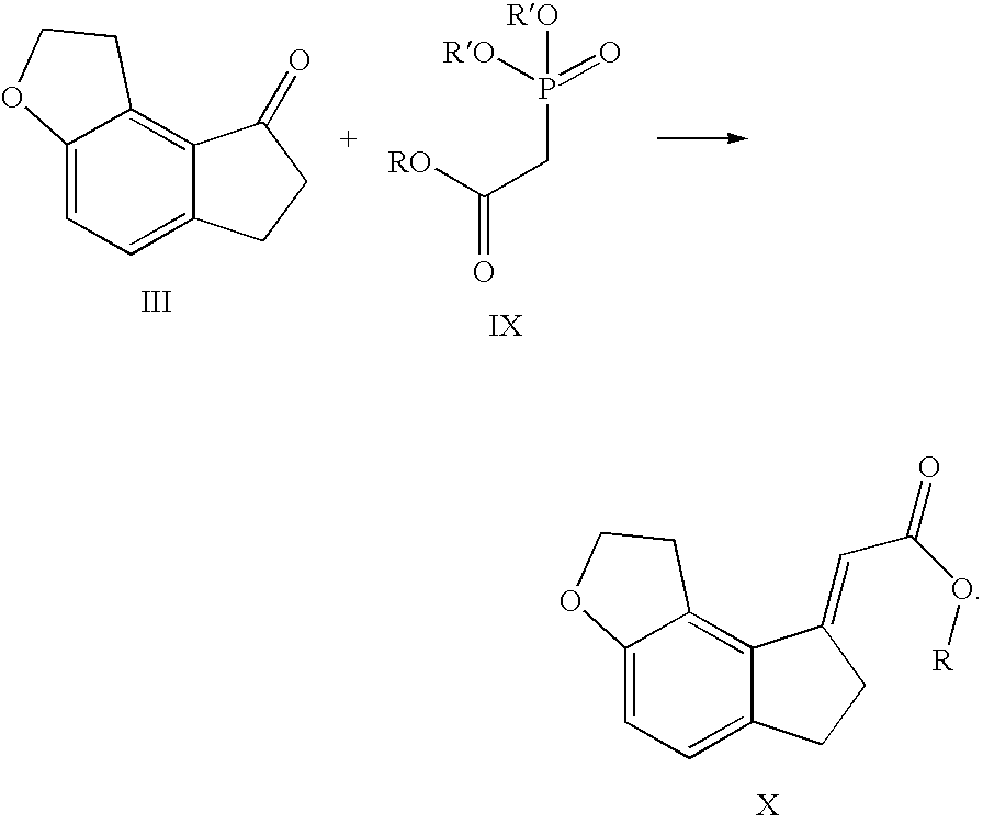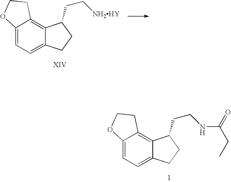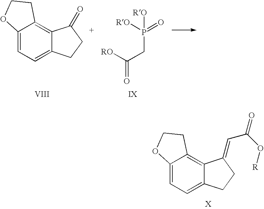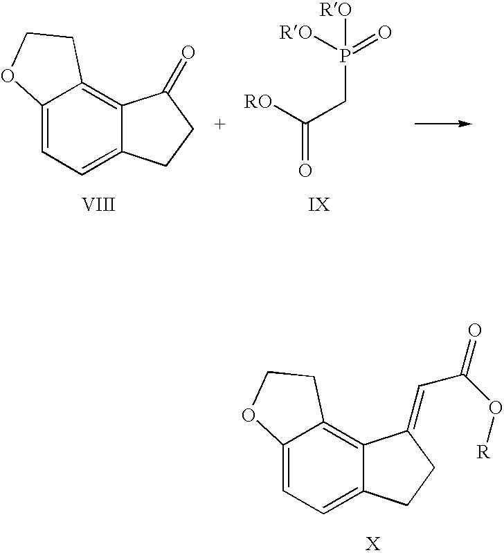 Suitable organic solvents include, but are not limited to, halogenated hydrocarbons, C6 to C14 aromatic hydrocarbons, C2 to C7 esters, C4 to C7 ethers, cyclic ethers, and mixture thereof, preferably dichloromethane, dichloroethane, toluene, ethyl acetate, or diethyl ether; most preferably dichloromethane. The base may be selected from the group consisting of inorganic bases such as sodium carbonate, sodium bicarbonate, potassium carbonate, potassium bicarbonate, and sodium hydroxide, or organic bases such as triethylamine, diisopropylethylamine, N-methylmorpholine, pyridine, lutidine, and picoline, most preferably triethylamine. Compounds VII A, B and VIII A and B may be used as reference marker or standards to determine amount/and or location of compounds VII, VIII, ramelteon or other intermediates and impurities. A compound in a relatively pure state can be used as a “reference standard” (a “reference marker” is similar to a reference standard but it is used for qualitative analysis) to quantify the amount of the compound in an unknown mixture. When the compound is used as an “external standard,” a solution of a known concentration of the compound is analyzed by the same technique as the unknown mixture. (Strobel p. 924, Snyder p. 549) (Snyder, L. R.; Kirkland, J. J. The reference standard compound also can be used to quantify the amount of another compound in the mixture if the “response factor,” which compensates for differences in the sensitivity of the detector to the two compounds, has been predetermined. (Strobel p. 894). For this purpose, the reference standard compound may be added directly to the mixture, in which case it is called an “internal standard.” (Strobel p. 925, Snyder p. 552). The reference standard compound can even be used as an internal standard when the unknown mixture contains some of the reference standard compound by using a technique called “standard addition,” wherein at least two samples are prepared by adding known and differing amounts of the internal standard. (Strobel pp. 391-393, Snyder pp. 571, 572). The proportion of detector response due to the reference standard compound that is originally in the mixture can be determined by extrapolation of a plot of detector response versus the amount of the reference standard compound that was added to each of the samples to zero. (e.g. Strobel, FIG. 11.4 p. 392). In all of the embodiments described above, R and R′ can be a C1-C4 alkyl, preferably methyl or ethyl. ARL X-ray powder diffractometer model X'TRA-030, Peltier detector, round standard aluminum sample holder with round zero background quartz plate [or silicon plate in the case of Form XIV] was used. The cathode is CuKa radiation, λ=1.5418 Å. Scanning parameters: Range: 2-40 deg. 2, continuous Scan, Rate: 3 deg/min. The accuracy of peak positions is defined as +/−0.2 degrees due to experimental differences like instrumentations, and sample preparations. Mobile Phase: n-Heptane:Ethanol (95:5)
