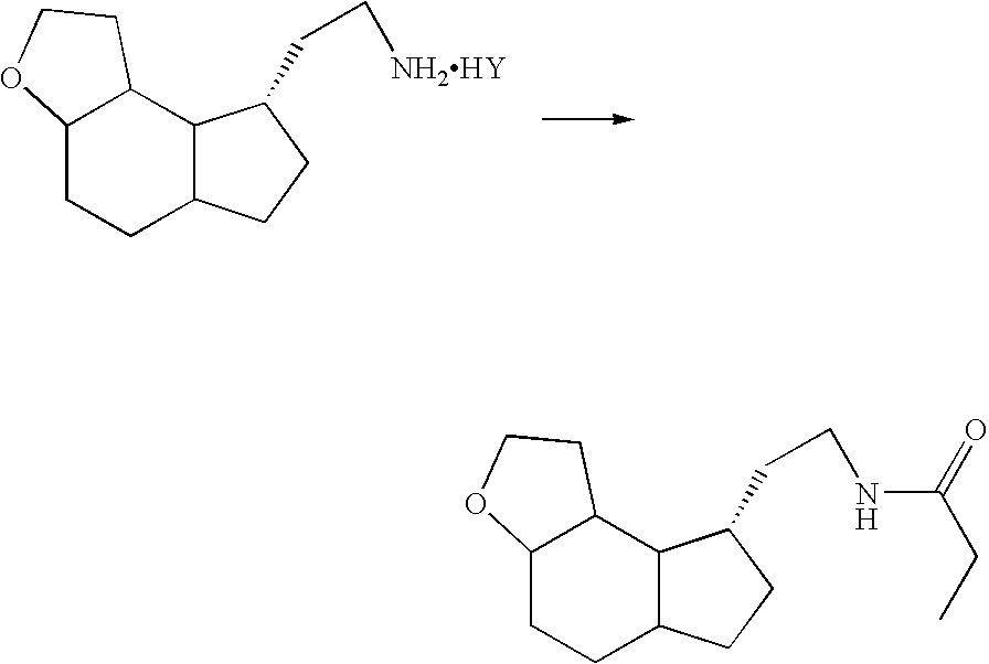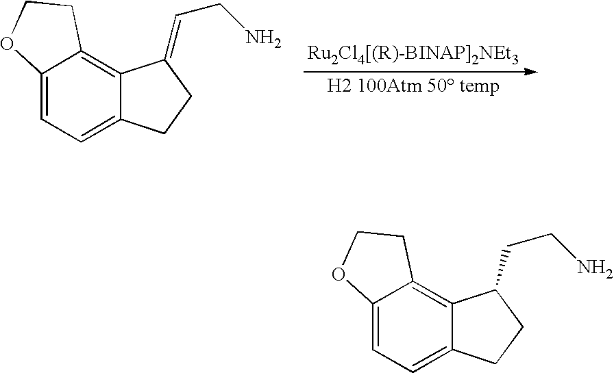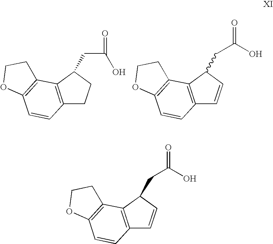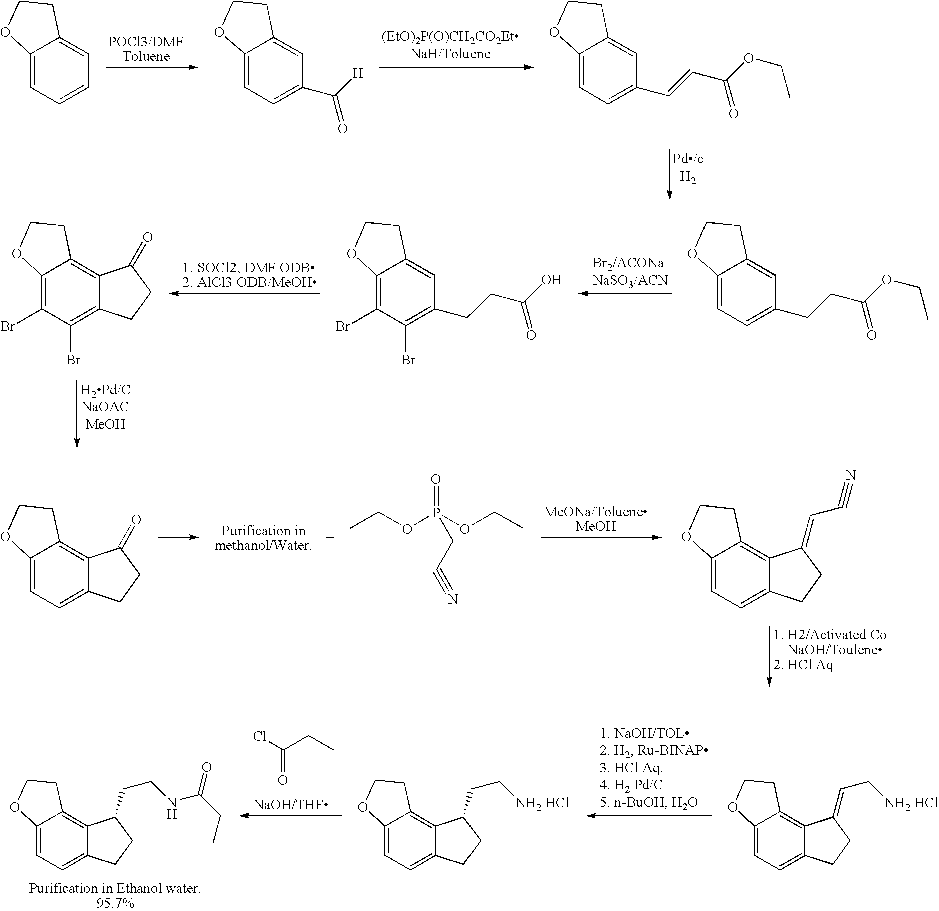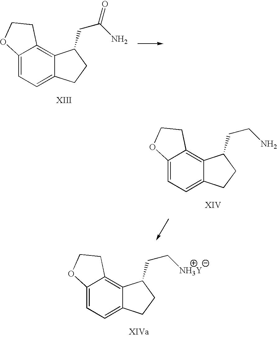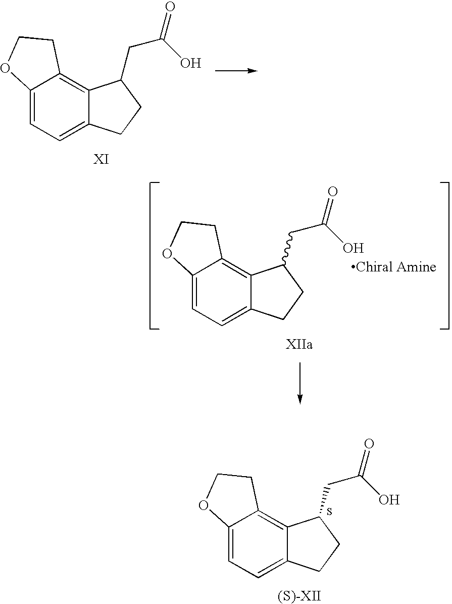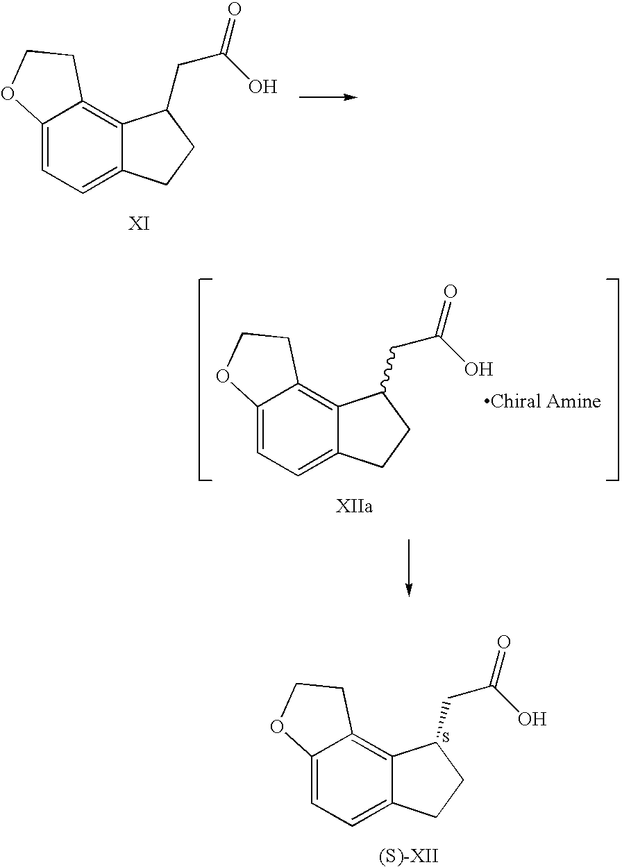 Suitable organic solvents include, but are not limited to, halogenated hydrocarbons, C6 to C14 aromatic hydrocarbons, C2 to C7 esters, C4 to C7 ethers, cyclic ethers, and mixture thereof, preferably dichloromethane, dichloroethane, toluene, ethyl acetate, or diethyl ether; most preferably dichloromethane. The base may be selected from the group consisting of inorganic bases such as sodium carbonate, sodium bicarbonate, potassium carbonate, potassium bicarbonate, and sodium hydroxide, or organic bases such as triethylamine, diisopropylethylamine, N-methylmorpholine, pyridine, lutidine, and picoline, most preferably triethylamine. Compounds VII A, B and VIII A and B may be used as reference marker or standards to determine amount/and or location of compounds VII, VIII, ramelteon or other intermediates and impurities. A compound in a relatively pure state can be used as a “reference standard” (a “reference marker” is similar to a reference standard but it is used for qualitative analysis) to quantify the amount of the compound in an unknown mixture. When the compound is used as an “external standard,” a solution of a known concentration of the compound is analyzed by the same technique as the unknown mixture. (Strobel p. 924, Snyder p. 549) (Snyder, L. R.; Kirkland, J. J. The reference standard compound also can be used to quantify the amount of another compound in the mixture if the “response factor,” which compensates for differences in the sensitivity of the detector to the two compounds, has been predetermined. (Strobel p. 894). For this purpose, the reference standard compound may be added directly to the mixture, in which case it is called an “internal standard.” (Strobel p. 925, Snyder p. 552). The reference standard compound can even be used as an internal standard when the unknown mixture contains some of the reference standard compound by using a technique called “standard addition,” wherein at least two samples are prepared by adding known and differing amounts of the internal standard. (Strobel pp. 391-393, Snyder pp. 571, 572). The proportion of detector response due to the reference standard compound that is originally in the mixture can be determined by extrapolation of a plot of detector response versus the amount of the reference standard compound that was added to each of the samples to zero. (e.g. Strobel, FIG. 11.4 p. 392). In all of the embodiments described above, R and R′ can be a C1-C4 alkyl, preferably methyl or ethyl. ARL X-ray powder diffractometer model X'TRA-030, Peltier detector, round standard aluminum sample holder with round zero background quartz plate [or silicon plate in the case of Form XIV] was used. The cathode is CuKa radiation, λ=1.5418 Å. Scanning parameters: Range: 2-40 deg. 2, continuous Scan, Rate: 3 deg/min. The accuracy of peak positions is defined as +/−0.2 degrees due to experimental differences like instrumentations, and sample preparations. Mobile Phase: n-Heptane:Ethanol (95:5)