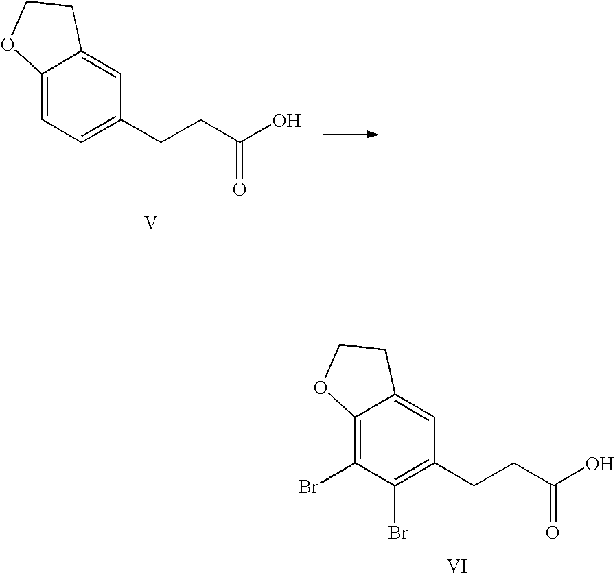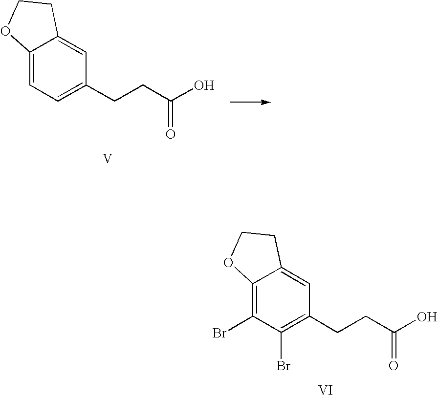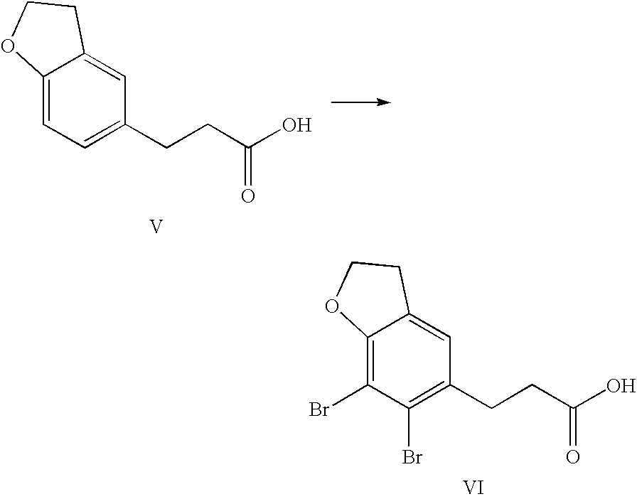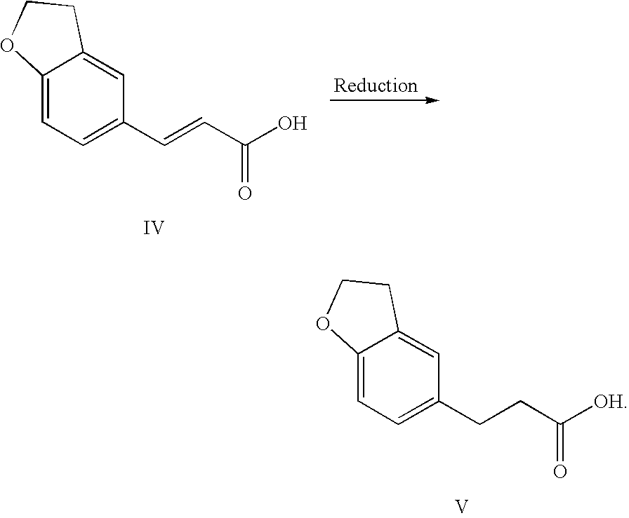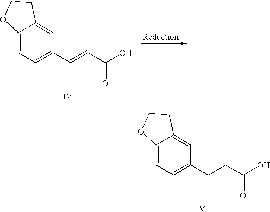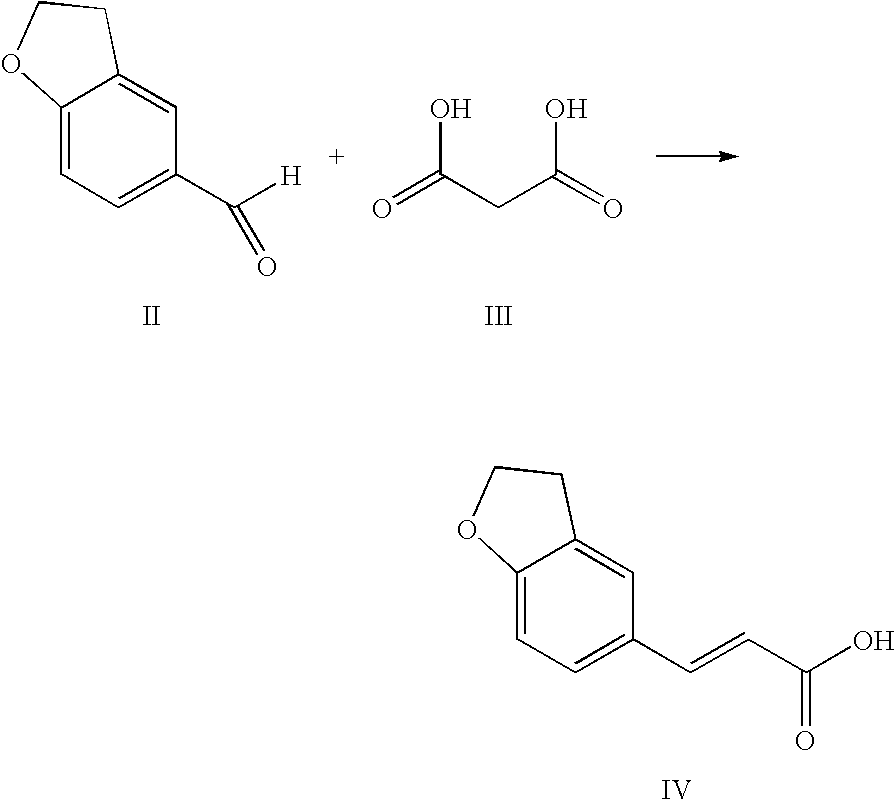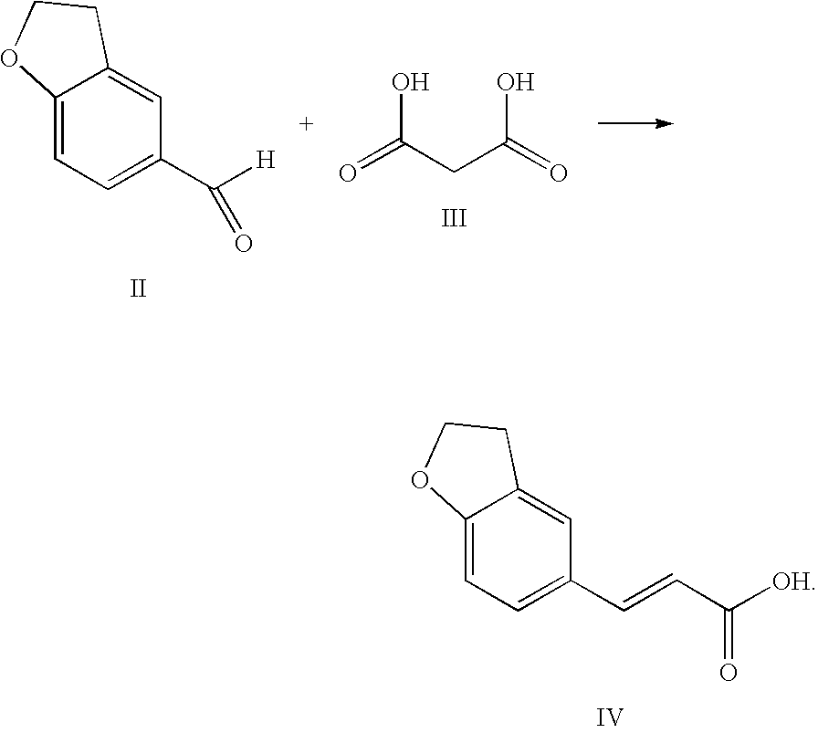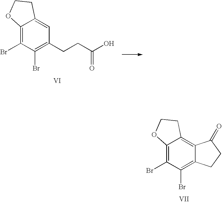 Equilibrium time: 10 minutes Phosphorous oxychloride (255.58 g, 1.666 mol) was slowly added to a solution of DMF (355.0 ml) and 2,3-dihydrobenzofuran (100 g, 0.833 mol) maintaining the temperature 80-85° C. The reaction mixture was stirred for 4-5 hr and the reaction progress monitored by HPLC. The reaction mixture was then poured into ice water and extracted with toluene (2000 ml). The organic layer was washed with 5% sodium bicarbonate solution (500 ml) and then 10% brine solution (500 ml). The organic layer was distilled off under vacuum at 50-60° C. A liquid product was isolated. Yield: 85-90%, Purity: 90-92% A mixture of 2,3-dihydrobenzofuran-5-carbaldehyde (100.0 g, 0.6756 mol) and Malonic acid (175.67 g, 1.6891 mol) in pyridine (200 ml) containing piperidine (11.5 g, 0.135 mol) and acetic acid (4.05 g, 0.0676 mol) was heated at 100° C. for 4-5 hr. The reaction progress was checked by TLC and HPLC monitoring. The cooled reaction mixture was poured into aqueous HCl and stirred for 2-3 hr at room temperature. The solid mass was isolated by filtration and dried under the vacuum at 60-70° C. Yield: 92-95%, Purity: 95% A solution of compound of formula IV (100 g, 0.526 mol) in methanol (1400 ml) and water (100 ml) was subjected to hydrogenation in the presence of 10% palladium on carbon (10 g) in a hydrogen atmosphere at room temperature for 1-2 hr. The reaction was monitored by HPLC. The reaction mixture was distilled off under vacuum at 60-70° C. until no additional solvent distilled off. Water was added dropwise, and the solid materials isolated and dried under vacuum at 60-70° C. Yield: 95% Purity 94-96%. A solution of compound of formula IV (100 g, 0.5263 mol) in water (1000 ml), sodium hydroxide (42.0 g, 1.0526 mol) and ammonium formate (32.0 g, 0.5263 mol) subjected to hydrogenation in the presence of 10% palladium on carbon (10 g) in a hydrogen atmosphere at room temperature for 5-6 hr. The reaction was monitored by HPLC. The reaction mixture was filtered, and acidified with dilute HCl. The precipitated product was filtered off and dried under vacuum at 60-70° C. to afford the title compound. Yield: 95%, Purity: 94-96%. The compound of formula V (100 g, 0.521 mol) and sodium acetate (42.71 g, 0.5208 mol) were stirred in acetic acid (500.0 ml). The reaction mixture cooled at 0-5° C. and bromine (416.64 g, 2.604 mol) was added dropwise, maintaining the temperature at 0-5° C. The reaction mixture was heated 40-45° C. for 2-3 hr, while monitoring the reaction progress by HPLC. 15% Sodium bisulfite solution (1100 ml) was added dropwise, maintaining the temperature, and the solids were isolated by filtration and dried. Yield: 50-60%, Purity 92-95%. A mixture of compound of formula VI (100.0 g, 0.2857 mol) in o-dichlorobenzene (450 mol) and DMF (1.0 ml) was treated with thionyl chloride (44.2 g, 0.3714 mol) at room temperature and stirred for 1-2 hr. The reaction progress was checked by TLC. The reaction mixture was cooled to 0-5° C. and aluminum chloride (42.0 g, 0.314 mol) was added in portions at 0-5° C. The reaction mixture was stirred for 1-2 hr., then poured into methanol (1500 ml) with stirring. Solids were isolated by filtration and washed with 5% sodium bicarbonate solution and water, and dried under vacuum at 50-60° C. Yield: 85-92%, Purity: 90-95% H1NMR: 2.674-2.708, 2H, m; 3.075-3.104 2H, t; 3.562-3.607, 2H, t; 4.746-4.791, 2H, t; 7.429, 1H, s C13 NMR: 25.16, 29.35, 37.03, 72.77, 110.26, 124.68, 128.76, 132.75, 148.05. 157.47, 206.36 H1NMR: 2.740-2.769, 2H, m; 2.488-3.017, 2H, t; 3.363-3.406, 2H, t; 4.725-4.769, 2H, t; 7.196 1H, s C13 NMR: 24.35, 30.73, 37.88, 71.87, 98.34, 121.44, 133.87, 136.12, 151.37, 157.75, 203.74 The compound of formula VII (100.0 g, 0.3012 mol), sodium acetate (61.75 g, 0.753 mol), and 10% Pd/C (10.0 g) in methanol (3500 ml) were stirred under a hydrogen atmosphere (2-3 kg/cm2). The reaction progress was monitored by HPLC. The reaction mixture was filtered through a filter aid (CELITE HYFLO™), and the methanol was removed under vacuum at 50-60° C. The solid product was isolated by filtgration and dried under vacuum at 50-60° C. Yield 80-85% Purity 95-96%. The compound of formula VII (100.0 g, 0.3012 mol), sodium acetate (61.75 g, 0.753 mol), and 10% Pd/C (10.0 g) in acetic acid (1000 ml) were stirred under a hydrogen atmosphere (2-3 kg/cm2). The reaction progress was monitored by HPLC. The reaction mixture was filtered through a filter aid (CELITE HYFLO™), and the acetic acid was removed under vacuum at 50-60° C. The solid product was isolated by filtration and dried under vacuum at 50-60° C. Yield: 85-90% Purity: 96-97%. H1NMR: 2.01-2.11 2H t; 2.756-3.058 HH m; 3.101-3.340 2H t; 4.500-4.542 2H t; 6.562-6.582 1H d; 6.929-6.949 1H d C13 NMR: 25.92, 28.72, 31.36, 32.11, 71.21, 106.70, 122.55, 122.92, 136.29, 140.86, 158.91 H1NMR: 1.87-1.93, 1H, m; 2.12-2.13, 1H, d; 2.40-2.48, 1H, m; 2.65-2.73, 1H, m; 2.89-2.97, 1H, m; 3.07-3.15, 1H, m; 3.23-3.32, 1H, m; 4.49-4.54, 2H, m; 5.15-5.18, 1H, t; 6.64-6.66, 1H, d; 6.92-6.94 1H, d) C13 NMR: Crude compound of formula VIII (100 g) was heated to reflux in methanol (1500 ml) to produce a clear solution. This clear solution was decolorized by charcoal treatment with stirring at reflux temperature. The reaction mixture was filtered while hot through a filter aid (CELITE HYFLO™), and the filtrate was concentrated and then cooled to 10-15° C. and stirred for 1-2 hr. The product was collected by filtration, washed with cold methanol, and dried under reduced pressure at 50-60° C. Yield: 80-85%, Purity: 99.2-99.8%. A 60% suspension of sodium hydride in mineral oil (34.4 g, 1.43 mol) was added to dry toluene (3000 ml) under a nitrogen atmosphere, cooled, and stirred at 0-5° C. for 15-20 minutes. Triethyl phosphonoacetate (257.1 g, 1.148 mol) was added dropwise at 0-5° C. and stirred for 2 hr at room temperature. Compound VIII (100.0 g, 0.5740 mol) was added, and the reaction mixture was heated t