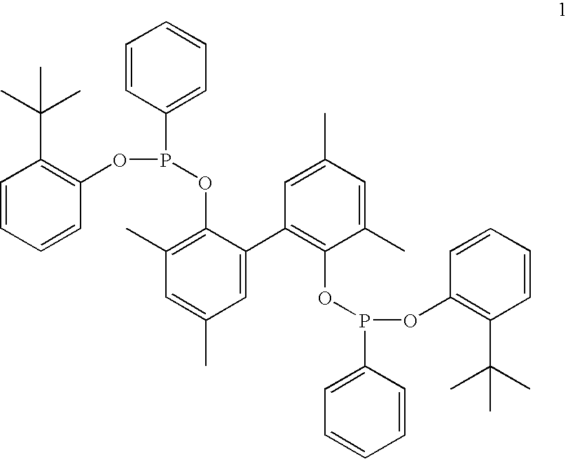 Preferred phosphites of the formula I b can be taken from DE-A 199 53 058. The R1 radical may advantageously be o-tolyl, o-ethylphenyl, o-n-propylphenyl, o-isopropylphenyl, o-n-butylphenyl, o-sec-butylphenyl, o-tert-butylphenyl, (o-phenyl)phenyl or 1-naphthyl groups. Preferred R2 radicals are m-tolyl, m-ethylphenyl, m-n-propylphenyl, m-isopropylphenyl, m-n-butylphenyl, m-sec-butylphenyl, m-tert-butylphenyl, (m-phenyl)phenyl or 2-naphthyl groups. Advantageous R3 radicals are p-tolyl, p-ethylphenyl, p-n-propylphenyl, p-isopropylphenyl, p-n-butylphenyl, p-sec-butylphenyl, p-tert-butylphenyl or (p-phenyl)phenyl groups. The R4 radical is preferably phenyl. p is preferably zero. For the indices x, y, z and p in compound I b, there are the following possibilities: Preferred phosphites of the formula I b are those in which p is zero, and R1, R2 and R3 are each independently selected from o-isopropylphenyl, m-tolyl and p-tolyl, and R4 is phenyl. Particularly preferred phosphites of the formula I b are those in which R1 is the o-isopropylphenyl radical, R2 is the m-tolyl radical and R3 is the p-tolyl radical with the indices specified in the table above; also those in which R1 is the o-tolyl radical, R2 is the m-tolyl radical and R3 is the p-tolyl radical with the indices specified in the table; additionally those in which R1 is the 1-naphthyl radical, R2 is the m-tolyl radical and R3 is the p-tolyl radical with the indices specified in the table; also those in which R1 is the o-tolyl radical, R2 is the 2-naphthyl radical and R3 is the p-tolyl radical with the indices specified in the table; and finally those in which R1 is the o-isopropylphenyl radical, R2 is the 2-naphthyl radical and R3 is the p-tolyl radical with the indices specified in the table; and also mixtures of these phosphites. Phosphites of the formula I b may be obtained by