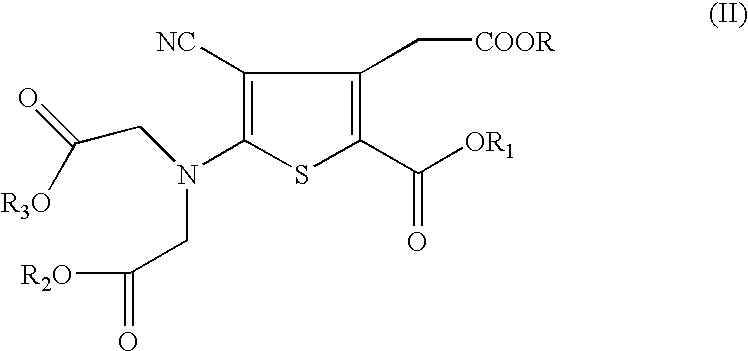 wherein R, R1, R2 and R3 are independently a linear or branched C1-C6 alkyl group or a substituted or unsubstituted C3-C12 cyclic group. Representative examples of alkyl groups for use herein include, by way of example, a straight or branched hydrocarbon chain radical containing carbon and hydrogen atoms of from 1 to about 6 carbon atoms with or without unsaturation, to the rest of the molecule, e.g., methyl, ethyl, n-propyl, n-butyl, n-pentyl, and the like. Representative examples of cyclic groups for use herein include, by way of example, substituted or unsubstituted cyclic radicals containing from 3 to about 12 carbon atoms, e.g., cyclopropyl, cyclobutyl, cyclopentyl, cyclohexyl radicals and the like. The starting tetraester of Formula II is well known and is described in the literature, e.g., M. Wierzbicki et al., Bull. Soc. Chim. pages 1786-1792 (1975). In one embodiment, the staring tetraester is the 5-(bis-ethoxycarbonylmethyl-amino)-4-cyano-3-methoxycarbonylmethyl-thiophene-2-carboxylic acid ethyl ester.