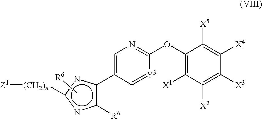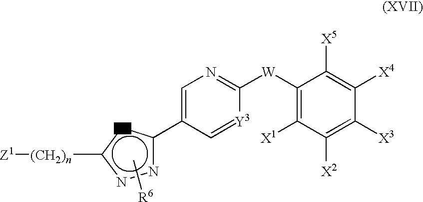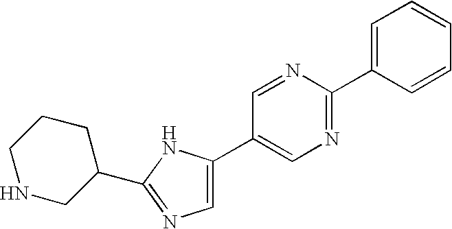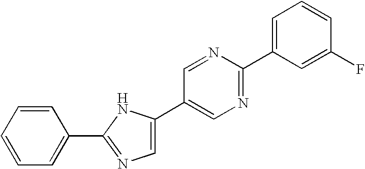 Further examples of replacement groups in accordance with the foregoing examples and examples of other prodrug types may be found in the aforementioned references. Moreover, certain compounds of formulas (I) and (II) may themselves act as prodrugs of other compounds of formulas (I) and (II), respectively. Also included within the scope of the invention are metabolites of compounds of formulas (I) and (II), that is, compounds formed in vivo upon administration of the drug. Also included within the scope of the invention are compounds of formulas (I) and (II) that are all pharmaceutically acceptable isotopically labeled compounds of formulas (I) and (II) wherein one or more atoms are replaced by atoms having the same atomic number, but an atomic mass or mass number different from the atomic mass or mass number which predominates in nature; for example, a compound of formula (I) or (II) for which one of the hydrogen atoms (1H) is replaced with a deuterium (D, or2H) or tritium (T, or3H) isotope. Another example includes a compound of formula (I) or (II) for which one of the carbon-12 atoms (12C) is replaced with a carbon-14 (14C) isotope. Isotopically labeled compounds of formulas (I) and (II) can generally be prepared by conventional techniques known to those ordinarily skilled in the art or by processes analogous to those described in the accompanying Examples using an appropriately isotopically labeled reagent in place of the non-labeled reagent previously employed. Also included within the scope of the invention are all stereoisomers, geometric isomers and tautomeric forms of the compounds of formulas (I) and (II), including compounds that exhibit more than one type of isomerism, and mixtures of one or more thereof. Cis/trans isomers may be separated by conventional techniques well known to those ordinarily skilled in the art; for example, chromatography and fractional crystallization. Conventional techniques for preparation and isolation of individual enantiomers include chiral synthesis from a suitable optically pure precursor or resolution of the racemate (or the racemate salt or derivative) using, for example, chiral high pressure liquid chromatography (HPLC). Alternatively, the racemate (or racemic precursor) may be reacted with a suitable optically active compound, for example, an alcohol, or, in the case where the compound of formula (I) or (II) contains an acidic or basic moiety, a base or an acid such as 1-phenethylamine or tartaric acid. The resulting diastereomeric mixture may be separated by chromatography and/or fractional crystallization and one or both of the diastereomers converted into the corresponding pure enantiomer(s) by means well known to those ordinarily skilled in the art. Compounds of the exemplary embodiments of formulas (I) and (II) may be administered orally, topically, transdermally, intranasally, by inhalation, directly into the bloodstream, into muscle, into an internal organ, into the eye, into the ear, into the rectum, or by other means. The compounds herein, their methods of preparation and their biological activity will appear more clearly from the examination of the following examples that are presented as an illustration only and are not to be considered as limiting the invention in its scope. Compounds herein are identified, for example, by the following analytical methods. Mass spectra (MS) methods include positive electrospray ionization (ESI+), negative electrospray ionization (ESI−), positive atmospheric pressure chemical ionization (APCI+), or negative atmospheric pressure chemical ionization (APCI−). 400 MHz proton nuclear magnetic resonance spectra (1H NMR) are recorded at ambient temperature using either a Bruker (300 MHz) or a Varian INOVA (400 MHz) nuclear magnetic resonance spectrometer. In the1H NMR chemical shifts (δ) are indicated in parts per million (ppm) with reference to tetramethylsilane (TMS) as the internal standard. Examples 1-13, 32-33, and 44 are imidazole compounds that may be prepared according to the general synthetic route illustrated in Scheme 1. Palladium-assisted coupling of 5-bromo-2-iodopyridine or 5-bromo-2-iodopyrimidine (1) with the appropriate arylboronic acid (2) provided the corresponding 2-aryl-5-bromopyridine or 2-aryl-5-bromopyrimidine intermediate (3). A subsequent palladium-assisted coupling of an intermediate (3) with a 1-benzyl-2-R2-substituted imidazole intermediate (4), which was prepared as illustrated in Scheme 2, provides the corresponding intermediate generally illustrated as structure (5). Debenzylation catalyzed with palladium on carbon affords the corresponding 5-(imidazol-4-yl)-pyridine or 5-(imidazol-4-yl)-pyrimidine (6). For each of the examples and schemes below, temperatures, measurements, and time references are approximations and are not intended to be limited to the actual values listed. A mixture consisting of 5-bromo-2-iodopyrimidine (Bridge Organics, 10.0 g, 35.1 mmol), benzene boronic acid (Alfa Aesar, 4.25 g, 35.1 mmol), tetrakis(triphenylphosphine)palladium (Strem, 0.405 g, 0.351 mmol), toluene (150 mL), and a 2 M aqueous sodium carbonate solution (35 mL) was stirred at 115° C. (degrees Celsius) under a nitrogen atmosphere for 16 hours. After cooling to room temperature, the mixture was partitioned between chloroform (250 mL) and brine (200 mL). The phases were separated and the organic phase was dried over anhydrous magnesium sulfate, and concentrated under reduced pressure to give an orange oil (9.1 g). The crude product was purified by flash silica column chromatography. Elution through a 500-g Analogix® flash silica cartridge with 100% hexanes afforded the title intermediate as a white solid (3.15 g, 38% yield). Rf0.69 with 9:1 v/v hexanes-ethyl acetate;1H-NMR (400 MHz; CDCl3) δ 8.83 (s, 2H), 8.44-8.38 (m, 2H), 7.52-7.46 (m, 3H); MS (APCI+) m/z 236.9 (M+1). To a mixture consisting of 2-phenylimidazole (TCI America, 3.0 g, 21 mmol) and N,N-dimethylformamide (40 mL) was a
