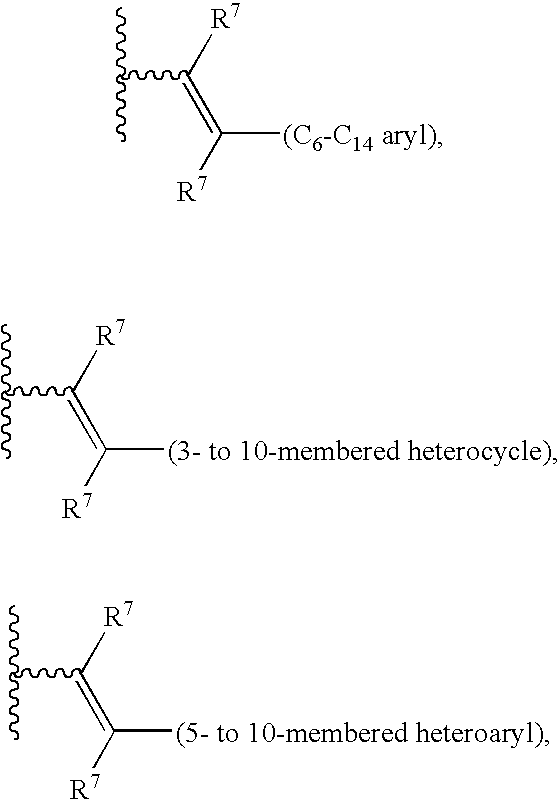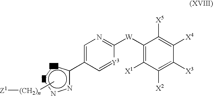 All three reactions are typically carried out in solution. The resulting salt may precipitate out and be collected by filtration or may be recovered by evaporation of the solvent. The degree of ionization in the resulting salt may vary from completely ionized to almost non-ionized. The compounds of formula (I) or (II) may also exist in unsolvated and solvated forms. The term “solvate” is used herein to describe a molecular complex comprising the compound of formula (I) or (II), or a pharmaceutically acceptable salt thereof, and one or more pharmaceutically acceptable solvent molecules, for example, ethanol or water. The term “hydrate” is employed when said solvent is water. Also included herein are multi-component complexes other than salts and solvates wherein the compound of formula (I) or (II) and at least one other component are present in stoichiometric or non-stoichiometric amounts. The compounds of formula (I) or (II) may exist in a continuum of solid states ranging from fully amorphous to fully crystalline. The compounds of formula (I) or (II) may also exist in a mesomorphic state (mesophase or liquid crystal) when subjected to suitable conditions. The mesomorphic state is intermediate between the true crystalline state and the true liquid state (either melt or solution). Hereinafter all references to compounds of formula (I) or (II) (also referred to as compounds of the invention) include references to salts, solvates, multi-component complexes, and liquid crystals thereof and to solvates, multi-component complexes, and liquid crystals of salts thereof. Also included herein are all polymorphs and crystal habits of compounds of formula (I) or (II), prodrugs, and isomers thereof (including optical, geometric, and tautomeric isomers) and isotopically-labeled forms thereof. As indicated, so-called ‘prodrugs’ of the compounds of formulas (I) and (II) are also within the scope of the invention. Thus certain derivatives of a compound of formula (I) or (II) which may have little or no pharmacological activity themselves can, when administered into or onto the body, be converted into a compound of formula (I) or (II) having the desired activity, for example, by hydrolytic cleavage. Such derivatives are referred to as ‘prodrugs.’ Further information on the use of prodrugs may be found in Higuchi and W, Stella) and Prodrugs in accordance with the invention can, for example, be produced by replacing appropriate functionalities present in the compounds of formulas (I) and (II) with certain moieties known to those skilled in the art as ‘pro-moieties’ as described, for example, in Some examples of prodrugs in accordance with the exemplary embodiments include: