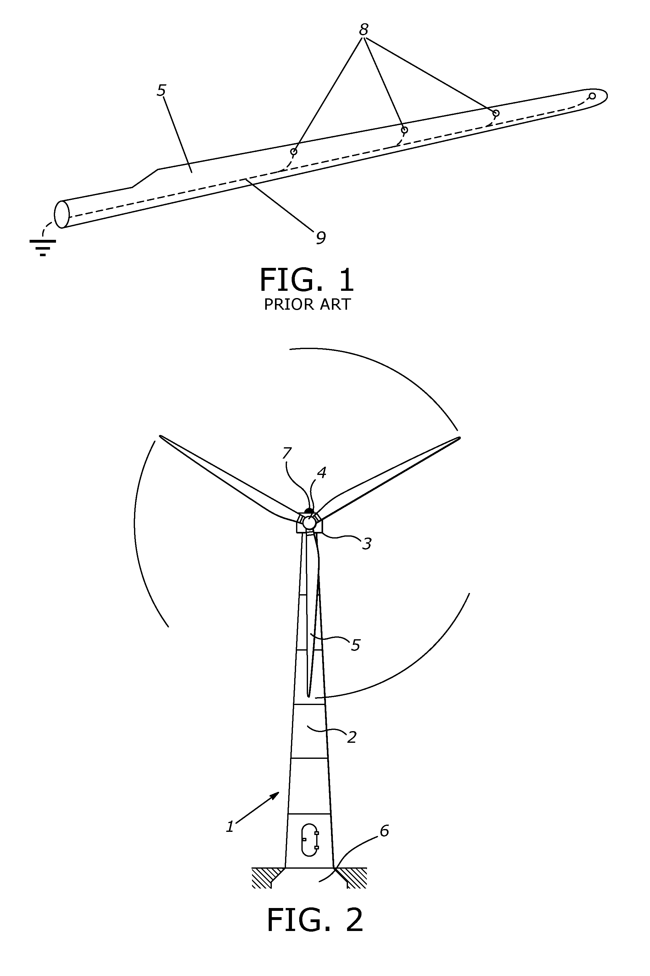 A study published in 2002 by the National Renewable Energy Laboratory (B. McNiff, Wind Turbine Lightning Protection Project 1999-2001, National Renewable Energy Laboratory (NREL), U.S. Dept. of Energy, Golden, Colo., USA) states that about 8 out of every 100 wind turbines could be expected to receive one direct lightning strike every year. According to the statistics quoted in IEC TR 61400-24, 7-10% of damages caused by lightning was to the rotor blades (IEC TR 61400-24, Wind Turbine Generator Systems, Part 24: Lightning Protection, International Electrotechnical Commission, First edition 2002-07). The blades of a wind turbine are most likely to be damaged when struck by lightning due to the presence of fiber glass which exhibits a highly resistive behavior. Even carbon fiber reinforced epoxies are not capable of conducting away the large amounts of current and heat from a single bolt of lightning. The wind turbine blades account for 15-20% of the cost of a wind turbine and hence damage thereto is very costly (F. M. Larsen, T. Sorensen, New Lightning Qualification Test Procedure for Large Wind Turbine Blades, 2002).