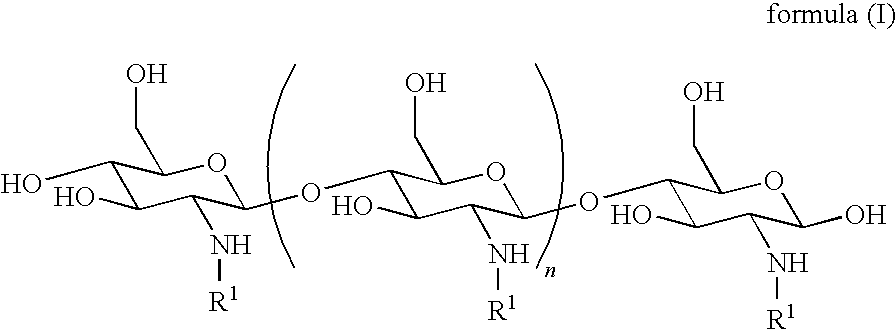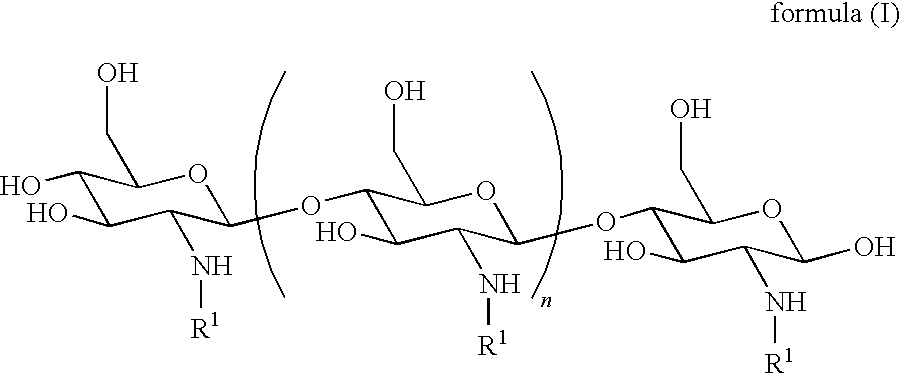 The present application claims the benefit of U.S. provisional application No. 61/113,981, filed Nov. 12, 2008, the contents of which are incorporated herein by reference. The invention relates to the use of chitosan derivatives, e.g., to treat or inhibit infections, or generally optimize animal health, e.g., to optimize weight gain to allow for the use of lower doses of anti-bacterial agents. Animal diseases, especially those that afflict animals used for the production of food or fiber, result in tremendous economic loss and human suffering. Chitosan derivatives are described. The derivatized chitosan can be used to optimize animal health, e.g., to optimize weight gain to allow for the use of lower doses of anti-bacterial agents. In one aspect, the invention features a method of inhibiting the growth of a bacterium and/or killing a bacterium in an animal subject, preventing or delaying onset of an infection with a bacterium in an animal subject, preventing or delaying onset of a pathogen mediated disease or disorder in an animal subject, or reducing bacterial load in an animal subject. The method includes administering an effective amount of a derivatized chitosan to said animal, thereby inhibiting the growth of a bacterium and/or killing a bacterium in an animal subject, preventing or delaying onset of an infection with a bacterium in an animal subject, preventing or delaying onset of a pathogen mediated disease or disorder in an animal subject, or reducing bacterial load in an animal subject, in an animal subject. In some embodiments, the derivatized chitosan is administered orally, e.g., in the subject's feed or water. In some embodiments, the derivatized chitosan is administered by inhalation. In some embodiments, the derivatized chitosan is soluble in aqueous solution from about pH 6.8 to about pH 7.4. In some embodiments, the derivatized chitosan is soluble in aqueous solution from about pH 3 to about pH 9. In some embodiments, the derivatized chitosan comprises a chitosan of the following formula (I): wherein: n is an integer between 20 and 6000; and each R1is independently selected for each occurrence from hydrogen, acetyl, and either: a) a group of formula (II): wherein R2is hydrogen or amino; and R3is amino, guanidino, C1-C6alkyl substituted with an amino or guanidino moiety, or a natural or unnatural amino acid side chain; or b) R1, when taken together with the nitrogen to which it is attached, forms a guanidine moiety; wherein at least 25% of R1substituents are H, at least 1% of R1substituents are acetyl, and at least 2% of R1substituents are a group of formula (II) or are taken together with the nitrogen to which they are attached to form a guanidine moiety. In some embodiments, between 25-95% of R1substituents are hydrogen. In some embodiments, between 55-90% of R1substituents are hydrogen. In some embodiments, between 1-50% of R1substituents are acetyl. In some embodiments, between 4-20% of R1substituents are acetyl. In some embodiments, between 2-50% of R1substituents are a group of formula (II). In some embodiments, between 4-30% of R1substituents are a group of formula (II). In some embodiments, 55-90% of R1substituents are hydrogen, 4-20% of R1substituents are acetyl, 4-30% of R1substituents are a group of formula (II). In some embodiments, R2is amino and R3is an arginine side chain. In some embodiments, R1is selected from one of the following: In some embodiments, R2is amino and R3is a lysine side chain. In some embodiments, R1is selected from one of the following: In some embodiments, R2is amino and R3is a histidine side chain. In some embodiments, R1is selected from one of the following: In some embodiments, at least 1% of R1substituents are selected from one of the following: AND at least 1% of R1substituents are selected from the following: In some embodiments, R2is amino and R3is a substituted C1-C6alkyl. In some embodiments, R3is C1-C6alkyl substituted with an amino group. In some embodiments, R3is C1alkyl substituted with an amino group. In some embodiments, R3is C2alkyl substituted with an amino group. In some embodiments, R3is C3alkyl substituted with an amino group. In some embodiments, R1is selected from one of the following: In some embodiments, R3is C1-C6alkyl substituted with a guanidino group. In some embodiments, R3is C1alkyl substituted with a guanidino group. In some embodiments, R3is C2alkyl substituted with a guanidino group. In some embodiments, R1is selected from one of the following: In some embodiments, R2is amino that is substituted with a nitrogen protecting group prior to substitution on chitosan and removed subsequent to substitution on chitosan. In some embodiments, the nitrogen protecting group is tert-butyloxycarbonyl (Boc). In some embodiments, in the synthetic process a nitrogen protecting group is used, which can provide an intermediate polymer having a nitrogen protecting group such as Boc. In some embodiments, R2is amino. In some embodiments, R2is hydrogen and R3is amino. In some embodiments, R2is hydrogen and R3is guanidino. In some embodiments, R2is hydrogen and R3is a substituted C1-C6alkyl. In some embodiments, R3is C1-C6alkyl substituted with an amino group. In some embodiments, R3is C1alkyl substituted with an amino group. In some embodiments, R3is C2alkyl substituted with an amino group. In some embodiments, R3is C3alkyl substituted with an amino group. In some embodiments, R3is C4alkyl substituted with an amino group. In some embodiments, R3is C5alkyl substituted with an amino group. In some embodiments, R1is selected from one of the following: In some embodiments, R3is C1-C6alkyl substituted with a guanidino group. In some embodiments, R3is C1alkyl substituted with a guanidino group. In some embodiments, R3is C2alkyl substituted with a guanidino group. In some embodiments, R3is C3alkyl substituted with a guanidino group. In some embodiments, R1is selected from one of the following: In some embodiments, at least 25% of R1s