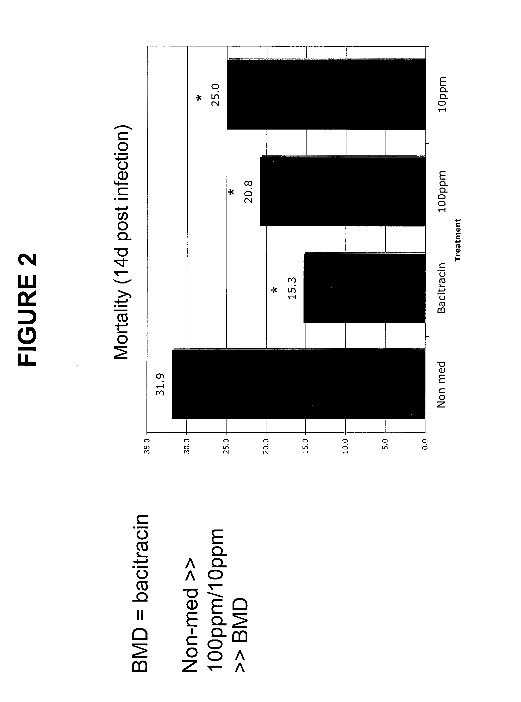 Poultry study in feed Dosage Awt21 Treatment (mg/kg) (kg) P Diff* Negative control — 0.728 Penicillin 55 0.852 0.0001 Chitosan 10% 5 0.764 0.07 Chitosan 10% 25 0.768 0.04 Chitosan 10% 100 0.747 0.35 Chitosan 10% 500 0.769 0.09 Chitosan 30% 5 0.739 0.60 Chitosan 30% 10 0.774 0.03 Chitosan 30% 50 0.751 0.25 Example 2