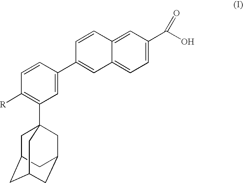 The various forms of acne described above can be treated with active agents such as anti-seborrheic agents and anti-infectives, for example, benzoyl peroxide (in particular, the product Eclaran® marketed by Pierre Fabre), with retinoids such as tretinoin (in particular, the product Retacnyl® marketed by Galderma) or isotretinoin (the product Roaccutane® marketed by Laboratories Roche), or else with naphthoic acid derivatives. Naphthoic acid derivatives such as, in particular, 6-[3-(1-adamantyl)-4-methoxyphenyl]-2-naphthoic acid, which is commonly called adapalene (the product Differine® marketed by Galderma), are widely described and recognized as active ingredients that are just as effective as tretinoin for the treatment of acne.