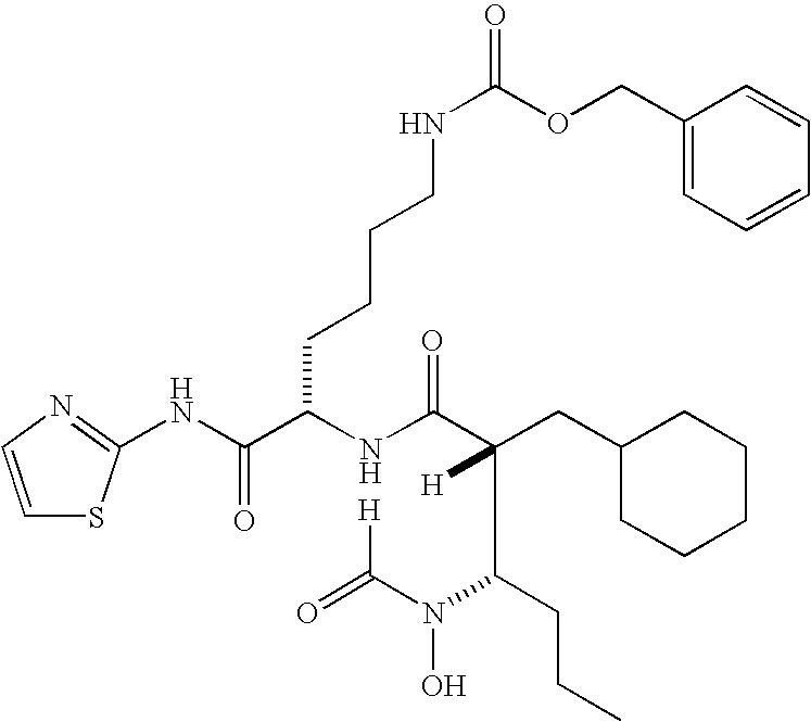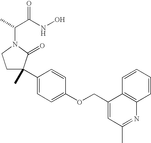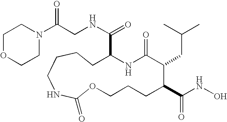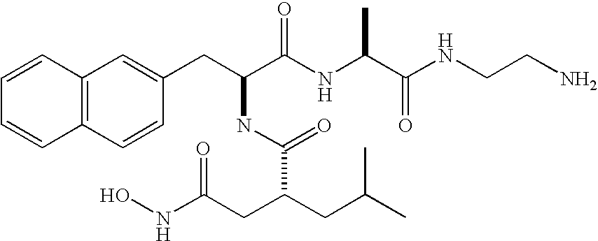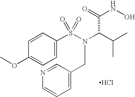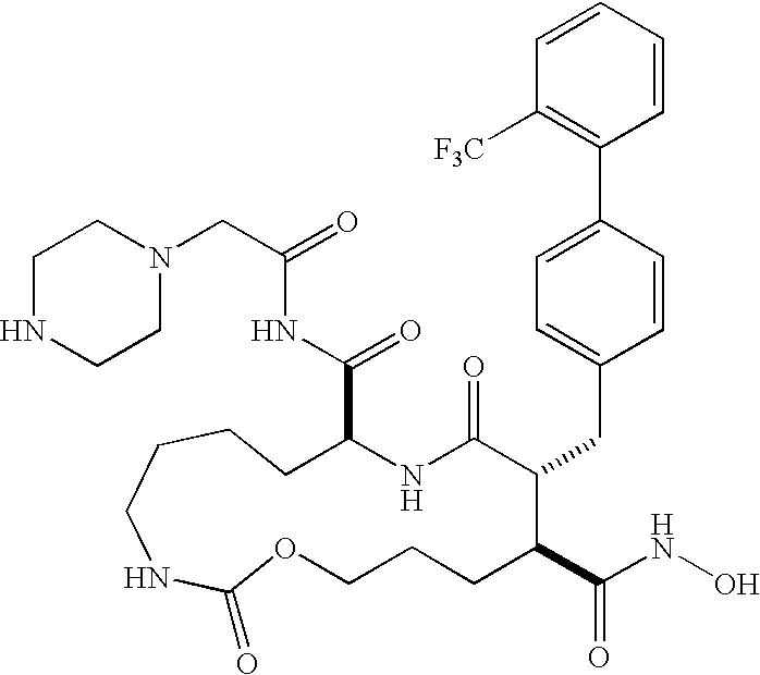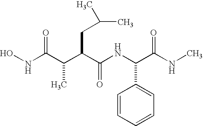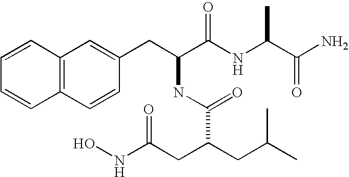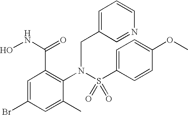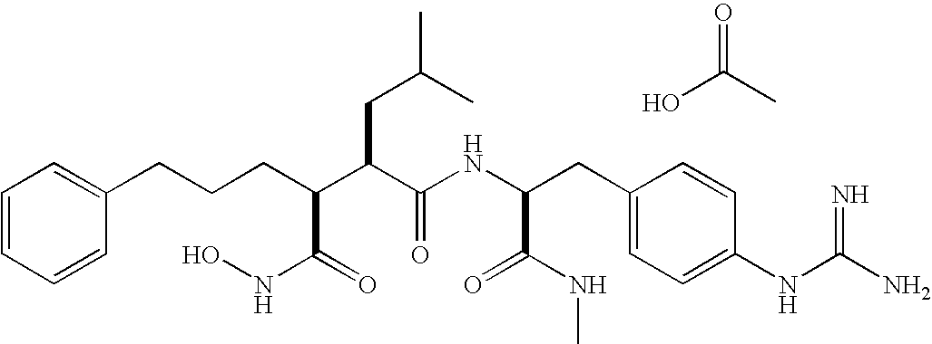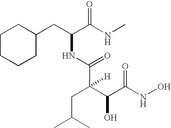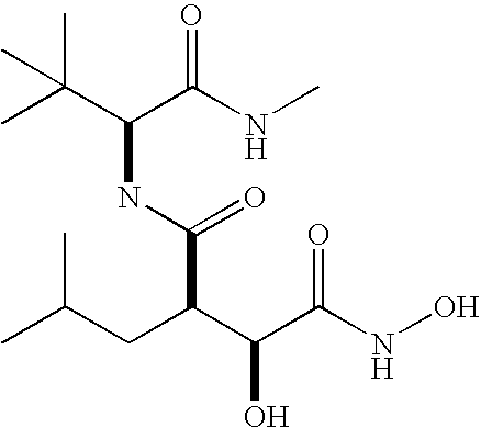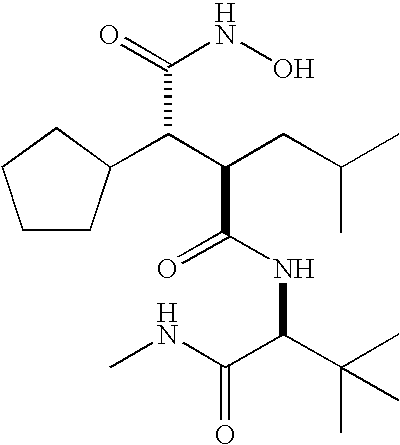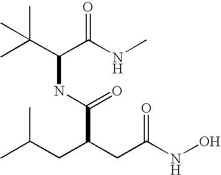 TACE inhibitors: Compound Number Structure T1 T2 T3 T4 T5 T6 T7 T8 T9 T10 T11 T12 T15 T16 T17 T18 T19 T20 T21 T22 T23 T24 T25 T26 T27 T28 T29 T30 T31 T32 T33 Names of TACE inhibitors: No. Name(s) CAS Reference T1 W-3646, 3-[3-[N-isopropyl-N-(4- Abstracts of Papers, methoxyphenylsulphonyl)amino]-phenyl]- 222nd ACS National 3-(3-pyridyl)-2-(E)- Meeting, Chicago, propenohydroxamic acid IL, Aug. 26-30, (Wakunaga Pharmaceutical Co.) 2001, MEDI-262. T2 N-hydroxy-2-[(4-methoxyphenyl)- WO 99/42436; sulphonyl]octanamide, (American Abstracts, 219th Cyanamid) ACS National Meeting, San Francisco, CA, Mar. 26-30, 2000, MEDI-281. T3 BB-1101, (2R,3S)—N4-hydroxy- 147783-67-3 U.S. Pat. No. 5,652,262 N1-[(1S)-2-(methylamino)-2-oxo- 1-(phenylmethyl)ethyl]-2-(2- methylpropyl)-3-(2-propenyl)- butanediamide T4 BB-1433, (2R,3S)—N1-[(1S)-1- 147783-68-4 WO 94/02447 (cyclohexylmethyl)-2-(methyl- amino)-2-oxoethyl]-N4,3- dihydroxy-2-(2-methylpropyl)- butanediamide T5 BB-94, batimastat, (2R,3S)—N4- 130370-60-4 WO 90/05719 hydroxy-N1-[(1S)-2-(methyl- amino)-2-oxo-1-(phenylmethyl)- ethyl]-2-(2-methylpropyl)-3-[(2- thienylthio)methyl]butanediamide T6 Ro-32-7315, (2R,3S,5E)-3- 219613-02-2 U.S. Pat. No. 6,235,787 [(hydroxyamino)carbonyl]-2-(2- methylpropyl)-6-phenyl-5-hexenoic acid, 2-(2-methylpropyl)-2- (methylsulphonyl)hydrazide (Roche) T7 GW-3333, (2R,3S)-3-(formyl- 212609-68-2 WO 98/38179 hydroxyamino)-4-methyl-2-(2- methylpropyl)-N-[(1S,2S)-2- methyl-1-[(2-pyridinylamino)- carbonyl]butyl]pentanamide (GlaxoSmithKline) T8 GW-4459, (2R,3S)-3-(formyl- 260270-56-2 WO 00/12466 hydroxyamino)-N-[(1S)-4-[[imino- (nitroamino)methyl] amino]-1-[(2- thiazolylamino)carbonyl]butyl]-2- (2-methylpropyl)hexanamide (GlaxoSmithKline) T9 GI 129471, (2R,3S)—N4-hydroxy- 130370-59-1 WO 90/05719 N1-[(1S)-2-(methylamino)-2-oxo- 1-(phenylmethyl)ethyl]-2-(2- methylpropyl)-3-[(phenylthio)- methyl]butanediamide (British BioTechnology) T10 CGS-33090A, (αR,1α,4β)-α-[[(4- 209397-76-2 U.S. Pat. No. 5,770,624 ethoxyphenyl)sulphonyl](4- pyridinylmethyl)amino]- N-hydroxy-4- propoxycyclohexaneacetamide (Novartis) T11 IK-682, 1-(αR,3S)-3-[4-[(3,5- 223406-21-1 U.S. Pat. No. 6,057,336 dimethylphenyl)methoxy]phenyl]- N-hydroxy-α,3-dimethyl-2-oxo- pyrrolidineacetamide (Bristol- Myers Squibb) T12 DPC-333, (αR)—N-hydroxy-α,3- U.S. Pat. No. 6,057,336 dimethyl-2-oxo-3-[4-(2-methyl-4- quinolinylmethoxy)phenyl]-1- pyrrolidineacetamide (Bristol- Myers Squibb) T13 TNF-484, (Novartis) T14 WTACE2, (Wyeth-Ayerst) T15 marimastat, (2S,3R)—N4-[(1S)-2,2- 154039-60-8 U.S. Pat. No. 5,986,132 dimethyl-1-[(methylamino)- carbonyl]propyl]-N1,2-dihydroxy- 3-(2-methylpropyl)butanediamide (British Biotechnology) T16 Ro 31-9790, (2R)—N1-[(1S)-2,2- 145337-55-9 U.S. Pat. No. 5,304,549 dimethyl-1-[(methylamino)- carbonyl]propyl]-N4-hydroxy-2-(2- methylpropy)butanediamide (Roche) T17 prinomastat, (3S)—N-hydroxy-2,2- 192329-42-3 WO 97/20824 dimethyl-4-[[4-(4-pyridinyloxy)- phenyl]sulphonyl]-3-thio- morpholinecarboxamide (Agouron) T18 (2S,3R)-2-cyclopentyl-N4-[(1S)- 191613-76-0 WO 97/19053 2,2-dimethyl-1-[(methylamino)- carbonyl]propyl]-N1-hydroxy-3-(2- methylpropyl)butanediamide (British Biotechnology) T19 TAPI-O, N-[(2R)-2-[2-(hydroxy- 163958-73-4 WO 95/06031 amino)-2-oxoethyl]-4-methyl-1- oxopentyl]-3-(2-naphthalenyl)-L- alanyl-L-alaninamide (Immunex) T20 TAPI-1, N-[(2R)-2-[2-(hydroxy- 163847-77-6 U.S. Pat. No. 5,594,106 amino)-2-oxoethyl]-4-methyl-1- oxopentyl]-3-(2-naphthalenyl)-L- alanyl-N-(2-aminoethyl)-L- alaninamide (Immunex) T21 TAPI-2, N-[(2R)-2-[2-(hydroxy- 187034-31-7 U.S. Pat. No. 5,594,106 amino)-2-oxoethyl]-4-methyl-1- oxopentyl]-3-methyl-L-valyl-N-(2- aminoethyl)-L-alaninamide (Immunex) T22 CGS 27023A, (2R)—N-hydroxy-2- 169799-04-6 U.S. Pat. No. 5,455,258 [[(4-methoxyphenyl)sulphonyl](3- pyridinylmethyl)amino]-3-methyl- butanamide, monohydrochloride (Novartis) T23 [(5S)-5-[[(2R,3S)-2-(cyclohexyl- 212609-63-7 WO 98/38179 methyl)-3-(formylhydroxyamino)- 1-oxohexyl]amino]-6-oxo-6-(2- thiazolylamino)hexyl]carbamic acid, phenyl methyl ester (Glaxo) T24 CT-2256, (2S,3R)—N4-[(1S)-1- 215593-63-8 (aminocarbonyl)-2,2-dimethyl- propyl]-N1,2-dihydroxy-3-(2- methylpropryl)butanediamide T25 SP-057, (8S,11R,12S)—N12- 191408-36-3 WO 97/18207 hydroxy-11-(2-methylpropyl)-N8- [2-(4-morpholinyl)-2-oxoethyl]- 2,10-dioxo-1-oxa-3,9-diazacyclo- pentadecane-8,12-dicarboxamide (Dupont) T26 SL-422, (6S,7R,10S)—N6-hydroxy- 191406-90-3 WO 97/18207 N10-[2-(methylamino)-2-oxo- ethyl]-7-(2-methylpropyl)-8-oxo-2- oxa-9-azabicyclo[10.2.2]hexadeca- 12,14,15-triene-6,10-dicarboxamide (Dupont) T27 (8S,11R,12S)—N12-hydroxy-2,10- 377088-88-5 Xue, C.-B. et al., J. dioxo-N8-[2-oxo-2-(1-piperazinyl)- Med. Chem., 44(21), ethyl]-11-[[2′-(trifluoromethyl)- 3351-3354 (2001) [1,1′-biphenyl]-4-yl]methyl]-1-oxa- 3,9-diazacyclopentadecane-8,12- dicarboxamide (Dupont) T28 (8S,11R,12S)—N12-hydroxy-N8-[2- 377088-85-2 Xue, C.-B. et al., J. (4-morpholinyl)-2-oxoethyl]-2,10- Med. Chem., 44(21), dioxo-11-[[2′-(trifluoromethyl)- 3351-3354 (2001) [1,1′-biphenyl]-4-yl]methyl]-1-oxa- 3,9-diazacyclopentadecane-8,12- dicarboxamide (Dupont) T29 (3R)—N2-[(1,4-dihydro-4-oxo-8- 204125-89-3 WO 98/07742 quinazolinyl)sulphonyl]-N-hydroxy- 3-(2-methylpropyl)-L-a- asparaginyl-N,3-dimethyl-L- valinamide (AstraZeneca) T30 (2R,3S)—N1-(2,4-dioxo-1- 277304-07-1 WO 00/35885 imidazolidinyl)-N4-hydroxy-2-(2- methylpropyl)-3-[(2E)-3-phenyl-2- propenyl]butanediamide (Hoffmann-La Roche) T31 5-bromo-N-hydroxy-2-[[(4- 206547-73-1 WO 98/16503 methoxyphenyl)sulphonyl](3- pyridinylmethyl)amino]-3- methylbenzamide (Wyeth-Ayerst) T32 FYK-1388, [2R-[1(S*),2R*,3S*]]- 184947-94-2 WO 96/33968 N1-[1-[[4-[(aminoiminomethyl)- amino]pheny]methyl]-2-(methyl- amino)-2-oxoethyl]-N4-hydroxy-2- (2-methylpropyl)-3-(3-phenyl- propyl)butanediamide, mono- acetate (salt) (Daiichi Seiyaku) T33 KB-R7785, (2S,3R)—N1-hydroxy- 168158-16-5 WO 95/04715 2-methyl-N4-[(1S)-2-(methyl- amino)-2-oxo-1-phenylethyl]-3-(2- methylpropyl)butaned