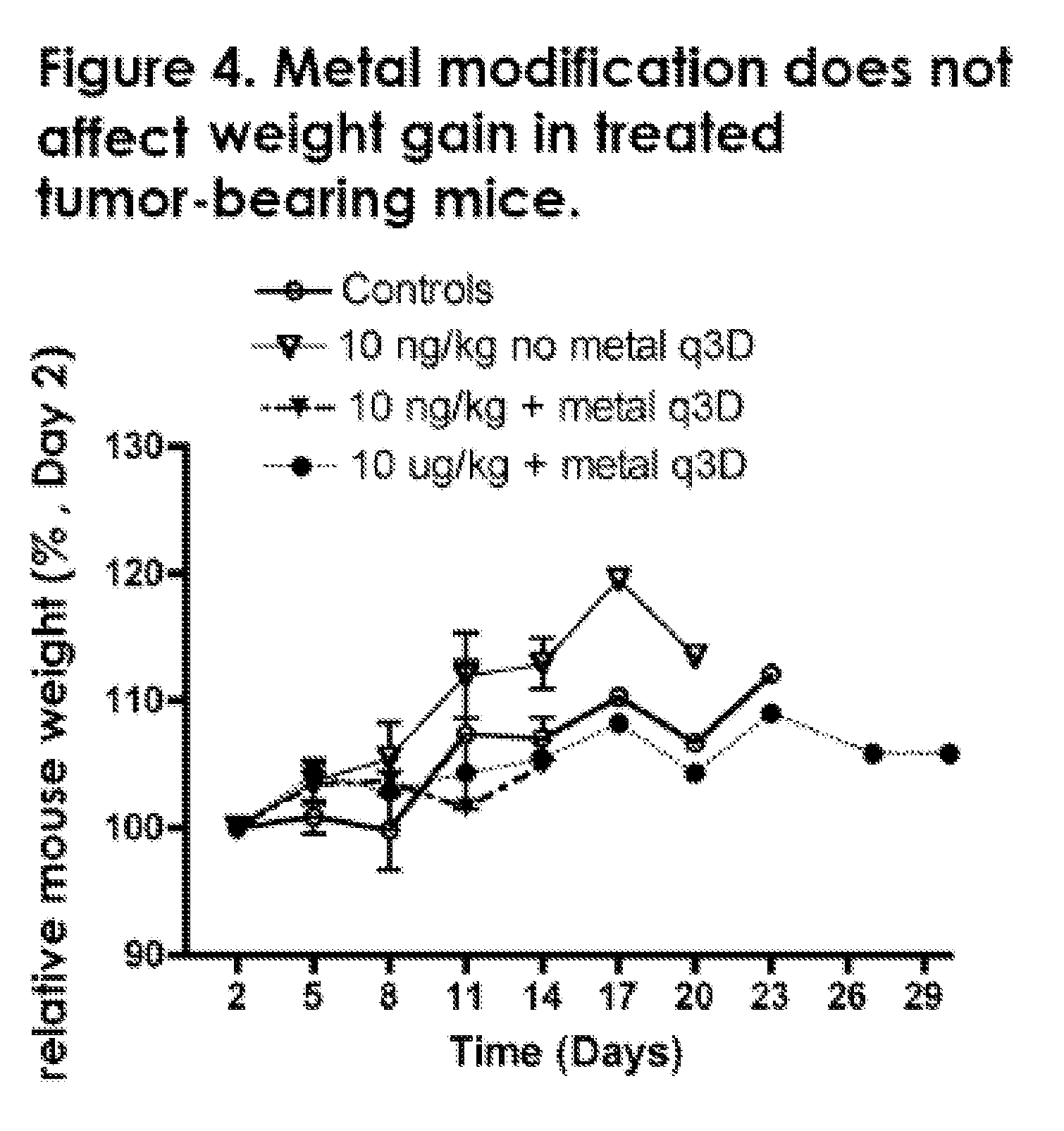Necropsy Results from UM-11A study. Lung Necrosis Group Treatment Lung Metastases and/or Scarring Died on Study 0 Controls 5/5 0/5 4/5 1 No Metal 1/3 2/3 3/3 2 10 ng/kg 1/6 6/6 6/6 3 10 ug/kg* 0/5 4/5 4/6 *One animal of the original 6 was not recovered for necropsy. Analysis of primary tumor sections in UM-11A model. Vascularity Proliferation (CD 31, 34, 105, p (Δ from p (Δ No (Ki67 signal, p (Δ from p (Δ from Group Treatment area percent) PBS) Metal) area percent) PBS) No Metal) 0 Controls 1.34 ± 0.12 60.83 ± 8.15 1 No Metal 2.14 ± 0.63 0.175 51.86 ± 12.21 0.467 2 10 ng/kg* 2.11 ± 0.19 0.136 0.953 19.23 ± 7.09 0.001 0.017 3 10 ug/kg 3.0 ± 0.5 0.003 0.128 15.12 ± 5.22 0.001 0.008 Table displays means ± standard Errors. Significance of difference between means was calculated by ANOVA with post hoc Fisher's testing *One tumor sample was lost so that n = 5 for this analysis. Example 6