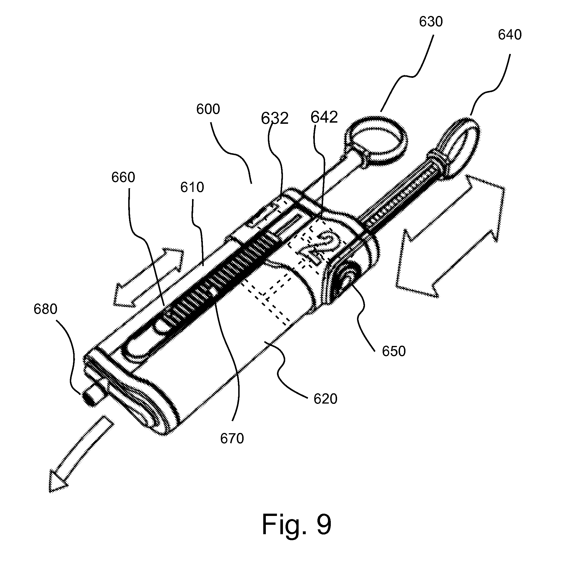 This application is a divisional of U.S. patent application Ser. No. 10/821,210, filed Apr. 8, 2004, now patented, and claims the benefit of U.S. Provisional Patent Application Ser. No. 60/461,152, filed Apr. 8, 2003, the disclosures of which are incorporated herein by reference. The present invention relates generally to fluid delivery systems, to fluid delivery devices and to methods of fluid delivery, and, especially, to fluid delivery systems of hazardous medical fluids, devices for use therein and to methods of delivering hazardous medical fluids to a patient. Current angiographic practice uses X-ray imaging to visualize the inside of the body. Physicians deftly maneuver catheters to a desired blood vessel. X-ray absorbing contrast is injected so that the vessel and downstream vessels can be clearly seen on the X-ray display or film. Using the resultant image, a physician makes a diagnosis and determines appropriate treatment. In interventional procedures, treatment is performed using injection catheters, atherectomy devices, stents, or any one of many interventional devices. Often the interventional treatment is performed during the angiographic procedure, although sometimes treatment is performed at a later time. During normal angiographic procedures, in addition to contrast it is common to inject saline to flush contrast from the catheter, to keep the catheter lumen open (unclotted), and/or to act as a fluid path for measuring blood pressure. Often the doctor performs the injections by hand, particularly for coronary injections. In some cases, saline is gravity fed. For peripheral injections, and sometimes for coronary injections, powered injectors are used to inject the contrast because of its high viscosity and the high pressures required to drive contrast through small catheter diameters. Powered injectors can, for example, develop pressures up to 1200 psi in such injections. The pressure range used in such injections is well above the pressure a person can practically develop via hand injection. U.S. Pat. Nos. 5,494,036, 6,339,718, 5,843,037, 5,840,026, 5,806,519, 5,739,508, and 5,569,181, assigned to the assignee of the present invention, which are incorporated herein by reference, disclose the use of powered injector systems that are capable of injecting contrast, saline, and other fluids, either at the same time or in sequence. In thrombolytic therapy, a doctor places a catheter to study a blockage of a vessel. The doctor then uses a plain catheter or one of many special thrombolytic catheters to inject a thrombolytic agent into the clot. Sometimes the injection is performed using periodically pulsed high-pressure injections to drive the thrombolytic agent into the clot and speed its breakdown. Examples of injectors suitable for use in thrombolytic procedures include the Pulse*Spray Injector Model PSI-1 available from AngioDynamics of Queensbury, N.Y. and the Pulse Thrombolytic Pump PTP1 available from Linet Compact s.r.o. of the Czech Republic. A difficulty with such currently available injection devices is the requirement that the doctor manipulate the fluid path, sometimes having to disconnect the manual contrast injection syringe and connect the thrombolytic injector. This manipulation takes time, and carries some risk of operator error, including inadvertent biological contamination. Another interventional procedure under development involves the injection of gene therapies. The goal of one type of gene therapy is to cause the heart muscle to express a gene that causes growth of new blood vessels to nourish heart muscle in which supply arteries have become significantly narrowed by disease. In one type of such gene therapy, the gene therapy DNA is contained in a non-replicating virus. When injected into the body, this virus transfects cells with the contained DNA. As the virus does not contain the DNA required for replicating the virus, it does not multiply and cause disease. These viruses can transfect any cells that they contact with the gene therapy DNA. For this reason, it is important to ensure that the vector viruses are delivered to target tissues only, and to make sure that the hospital personnel are sufficiently protected from contact with the vector virus. Another application of gene therapy is to block angiogenesis as a way to reduce tumor growth. In this application it is also important that the gene therapy be delivered to the target tissue and that delivery to healthy tissue and health care workers be minimized There are also many other gene therapy applications under study, for example treating cystic fibrosis and muscular dystrophy. In a representative procedure using an adenovirus gene therapy product, practitioners perform the following steps: (1) storing frozen vials in the pharmacy; (2) in a pharmacy hood, using gloves and proper technique, thawing the bottle with the gene therapy drug in the hand, avoiding agitation; (3) using a needle, pulling a few ml of drug into a hand syringe, for example a 10 ml syringe; (4) adding a few ml of saline to dilute the drug; (5) placing the hand syringe in a syringe holder for transport to the interventional suite to preserve the sterility of the outside of the syringe (the thawed drug has to be used within several hours); (6) for use in the interventional suite, donning goggles and masks (doctors, nurses, technicians) with M-95 filters to protect against infection from airborne viruses; (7) purging the fluid lines of air; (8) diluting the drug further if needed; (9) positioning the catheter in the desired vessel using normal angiographic equipment (manifolds, catheters, guidewires) and technique (normally this is a deep subselective placement to avoid any reflux of contrast or drug into the aorta, where it would be distributed systemically); (10) verifying the placement of the catheter with a contrast injection; (11) optionally flushing the manifold and/or catheter with saline by removing the contrast syringe an