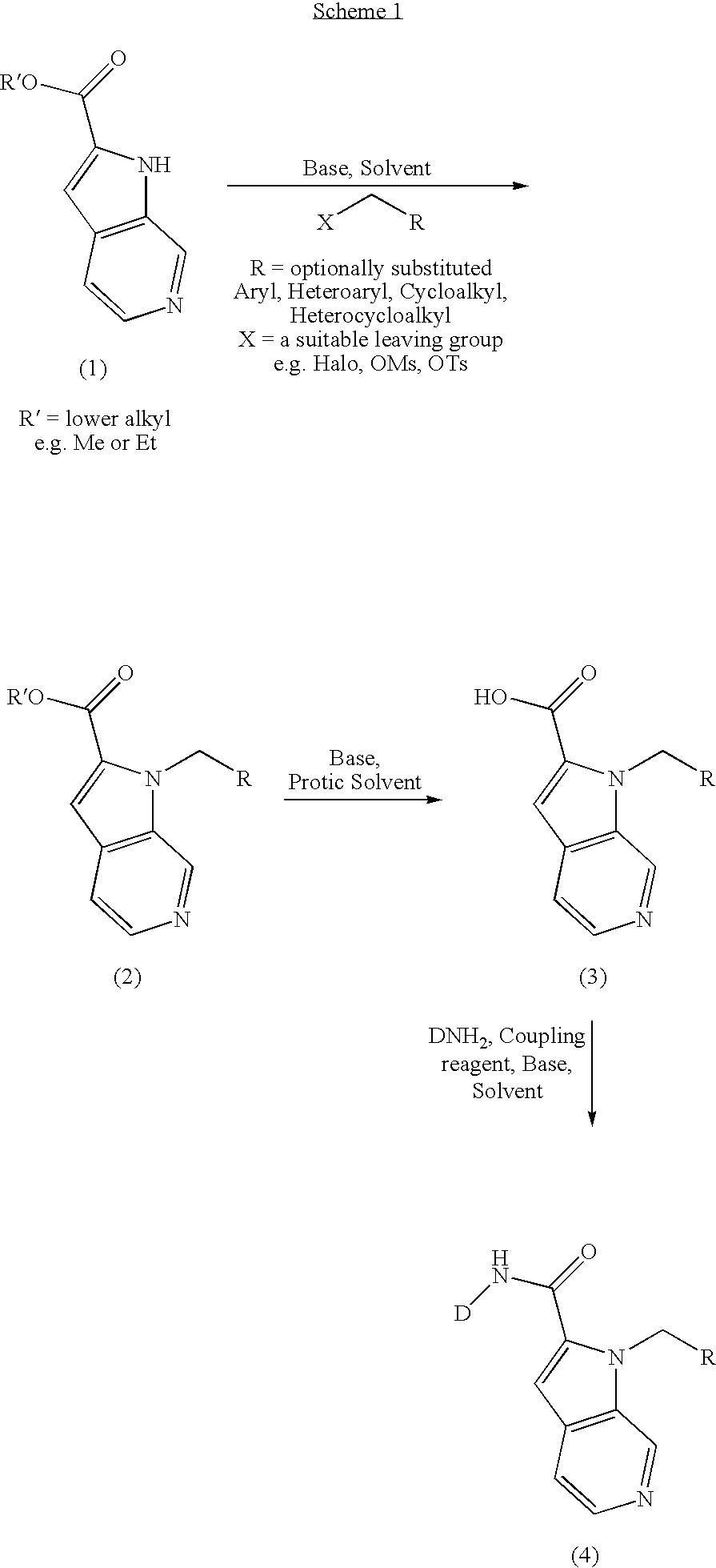 Palladium (II) acetate (1.5 mg, 5 μmol) was added to a mixture of 1-(2-fluoro-4-iodo-benzyl)-1H-pyrrolo[2,3-c]pyridine-2-carboxylic acid ((R)-2,2-dimethyl-[1,3]-dioxolan-4-ylmethoxy)-amide (55 mg, 0.11 mmol), trimethylsilylacetylene (138 μl, 1.0 mmol) and triphenylphosphine (3 mg, 10 μmol) in piperidine (0.5 ml). The resultant mixture was heated at 150° C. under microwave irradiation for 10 seconds. The reaction mixture was diluted with ethyl acetate (35 ml) and washed sequentially with water (10 ml), then brine (10 ml). The organic layer was isolated, dried over magnesium sulphate and concentrated in vacuo to provide a residue. The residue was dissolved in methanol (5 ml) to which potassium carbonate (29 mg, 0.21 mmol) was added, and the resultant suspension was stirred at room temperature for 2 hours. The reaction mixture was filtered, concentrated in vacuo, and then partitioned between ethyl acetate (25 ml) and water (20 ml). The organic layer was isolated, dried over magnesium sulphate and concentrated in vacuo to provide a residue. Purification by flash chromatography (Si-SPE, dichloromethane:ethyl acetate, 100:0 to 70:30 to 40:60 to 0:100) afforded the title compound as a yellow solid (30 mg, 68%). LCMS (method B): RT=2.21 min, (M−H)=422, (M+H)+=424.